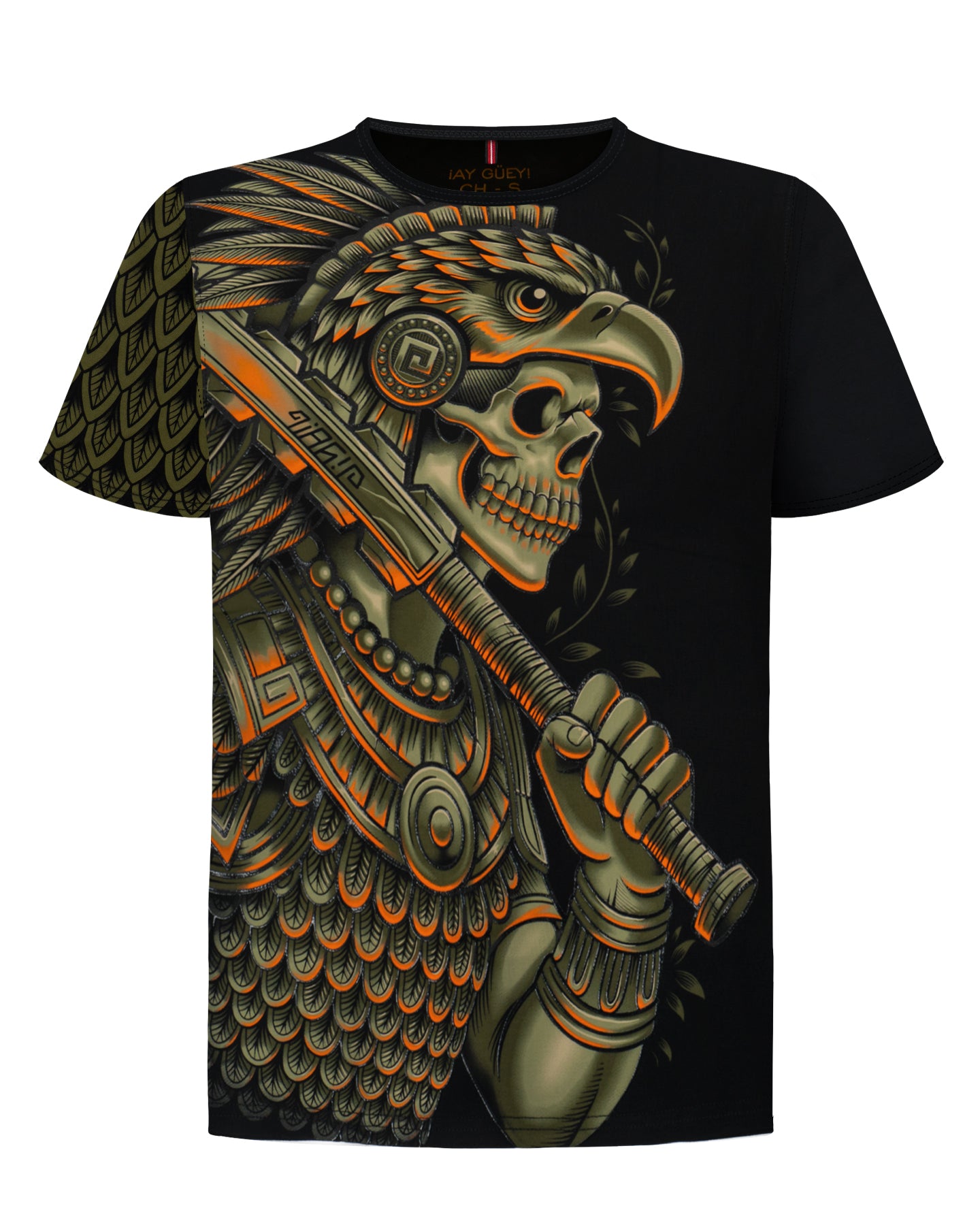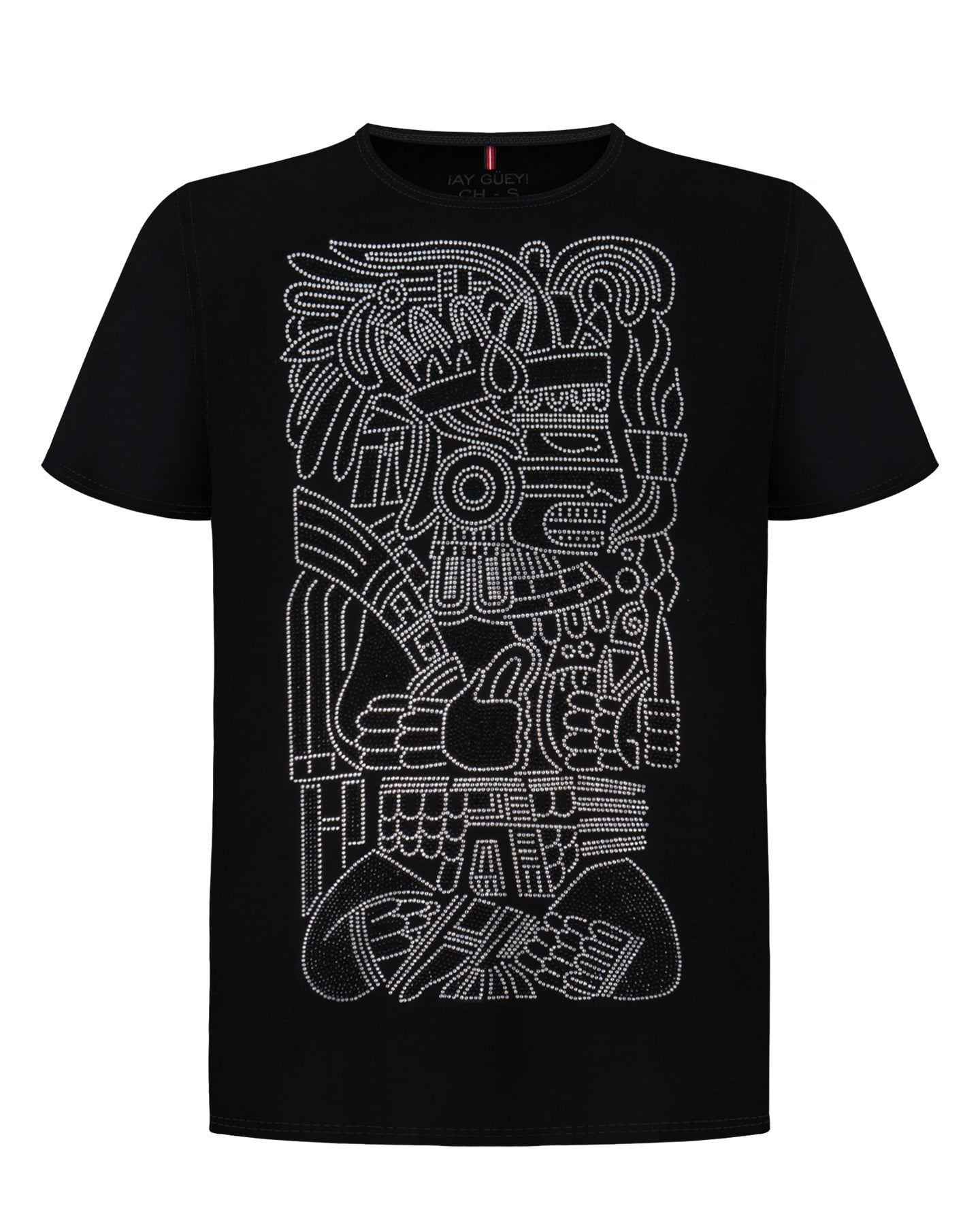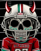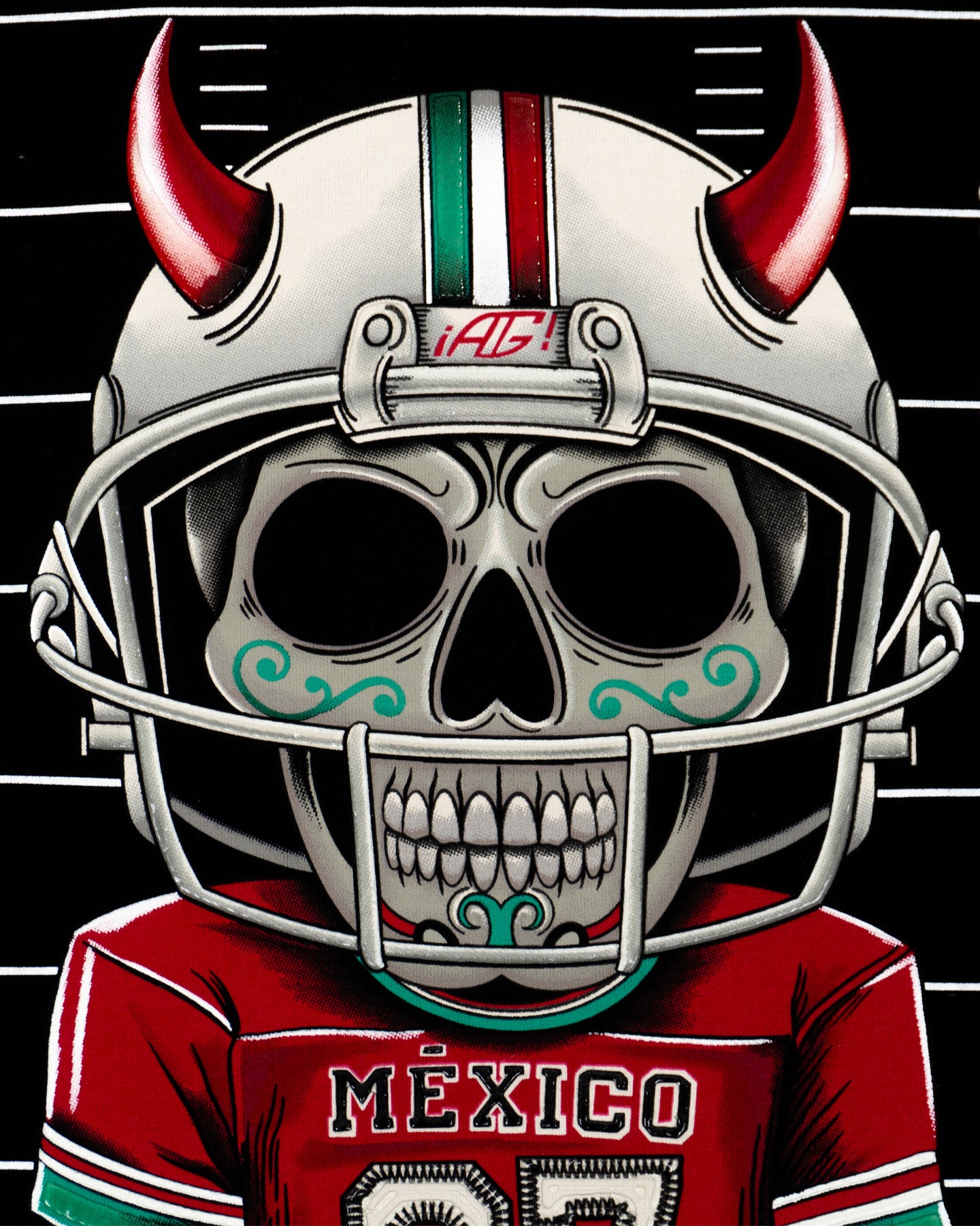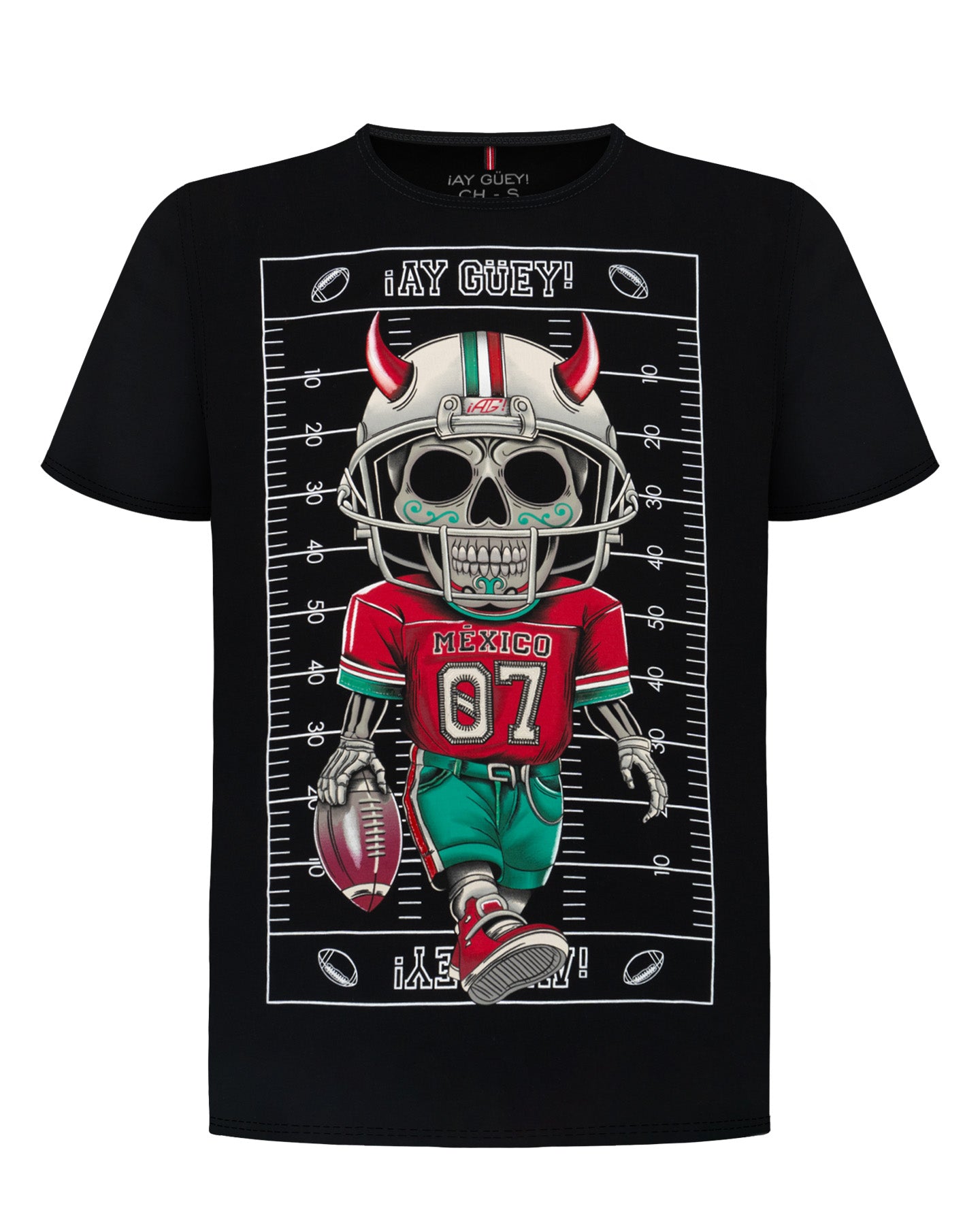 Esta prenda rinde homenaje a la intensidad del fútbol americano en México, personificada en "El Bronco", un guerrero que surge del campo de juego portando los colores nacionales y elementos tradicionales como el decorado de calavera. Su diseño integra un casco con astas y un uniforme clásico sobre un fondo de yardaje, capturando la esencia de quien deja todo en la línea de golpeo bajo el grito de ¡Ay Güey!