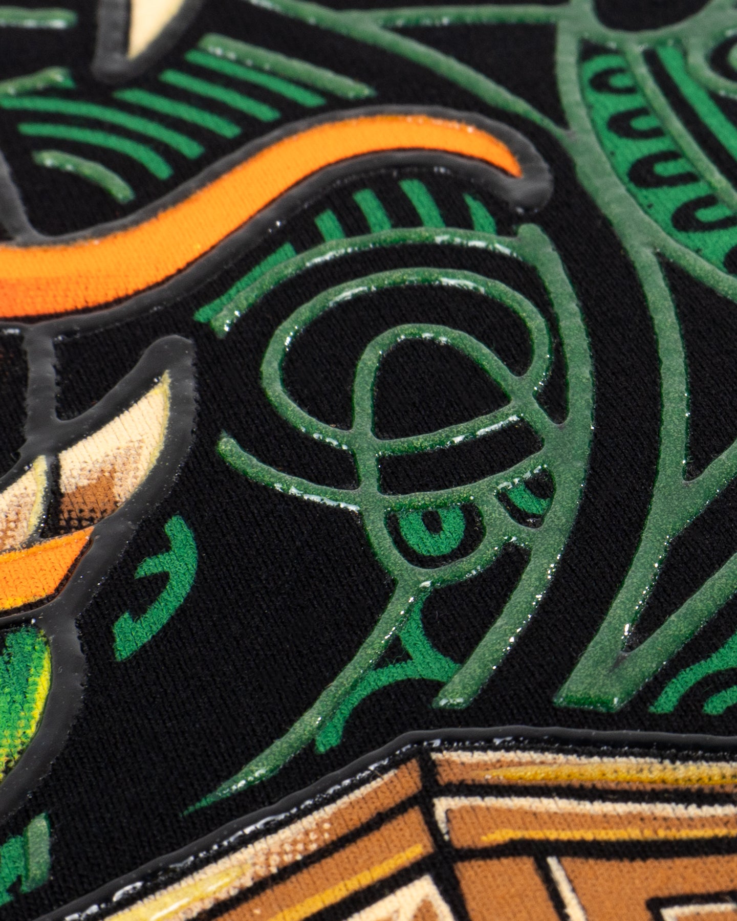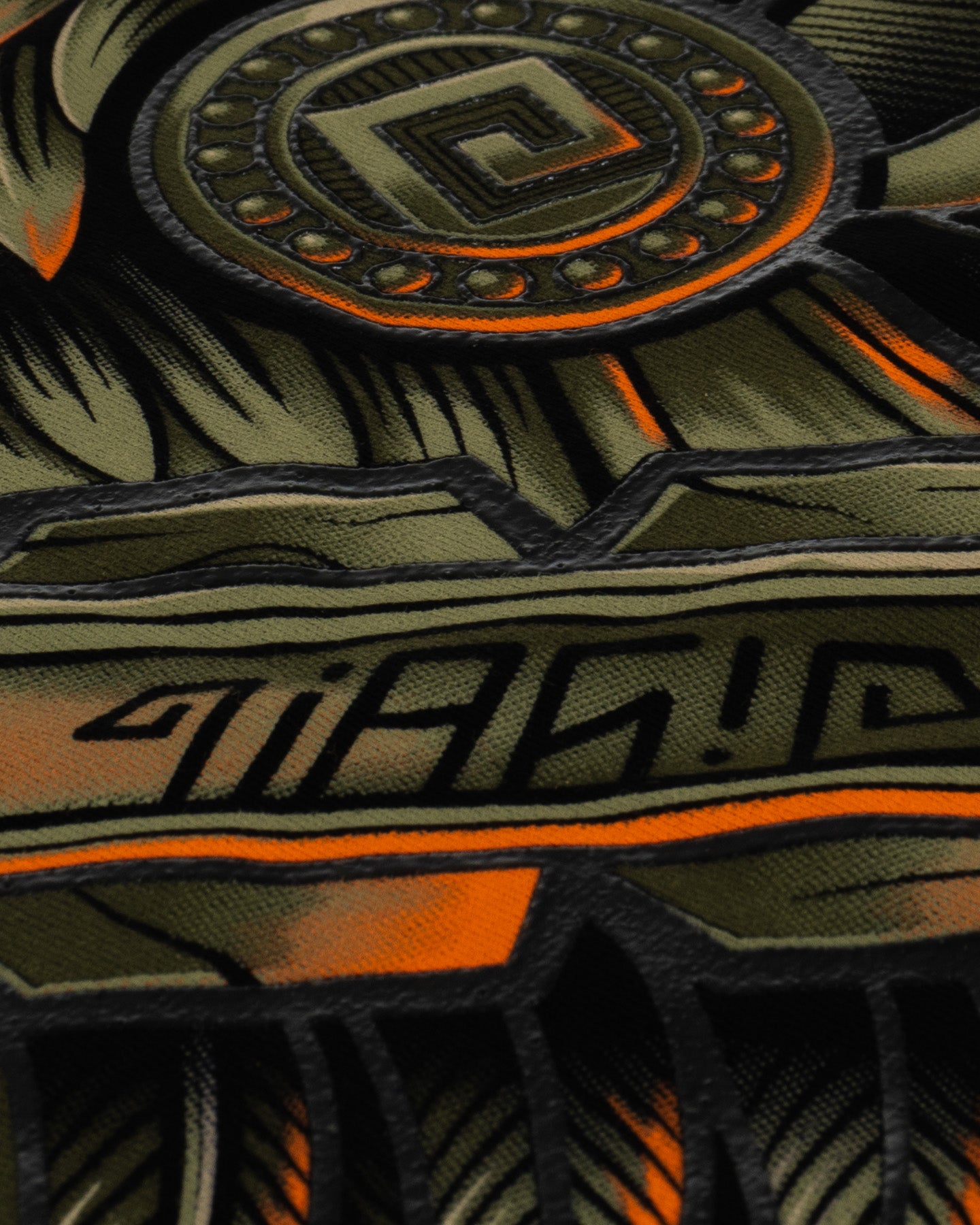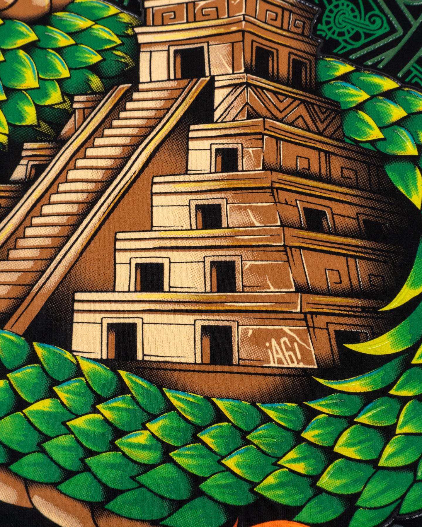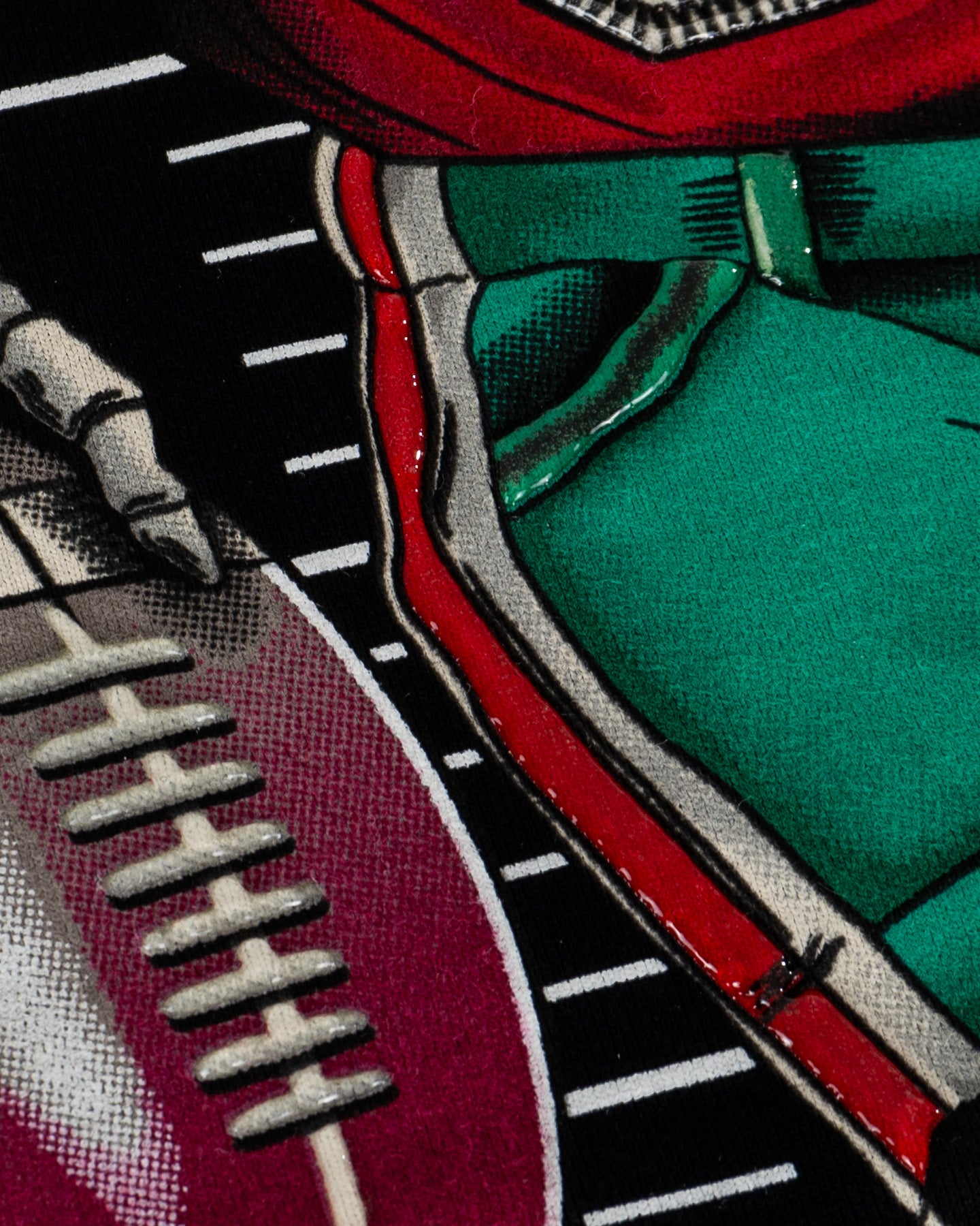 Esta prenda rinde homenaje a la intensidad del fútbol americano en México, personificada en "El Bronco", un guerrero que surge del campo de juego portando los colores nacionales y elementos tradicionales como el decorado de calavera. Su diseño integra un casco con astas y un uniforme clásico sobre un fondo de yardaje, capturando la esencia de quien deja todo en la línea de golpeo bajo el grito de ¡Ay Güey!