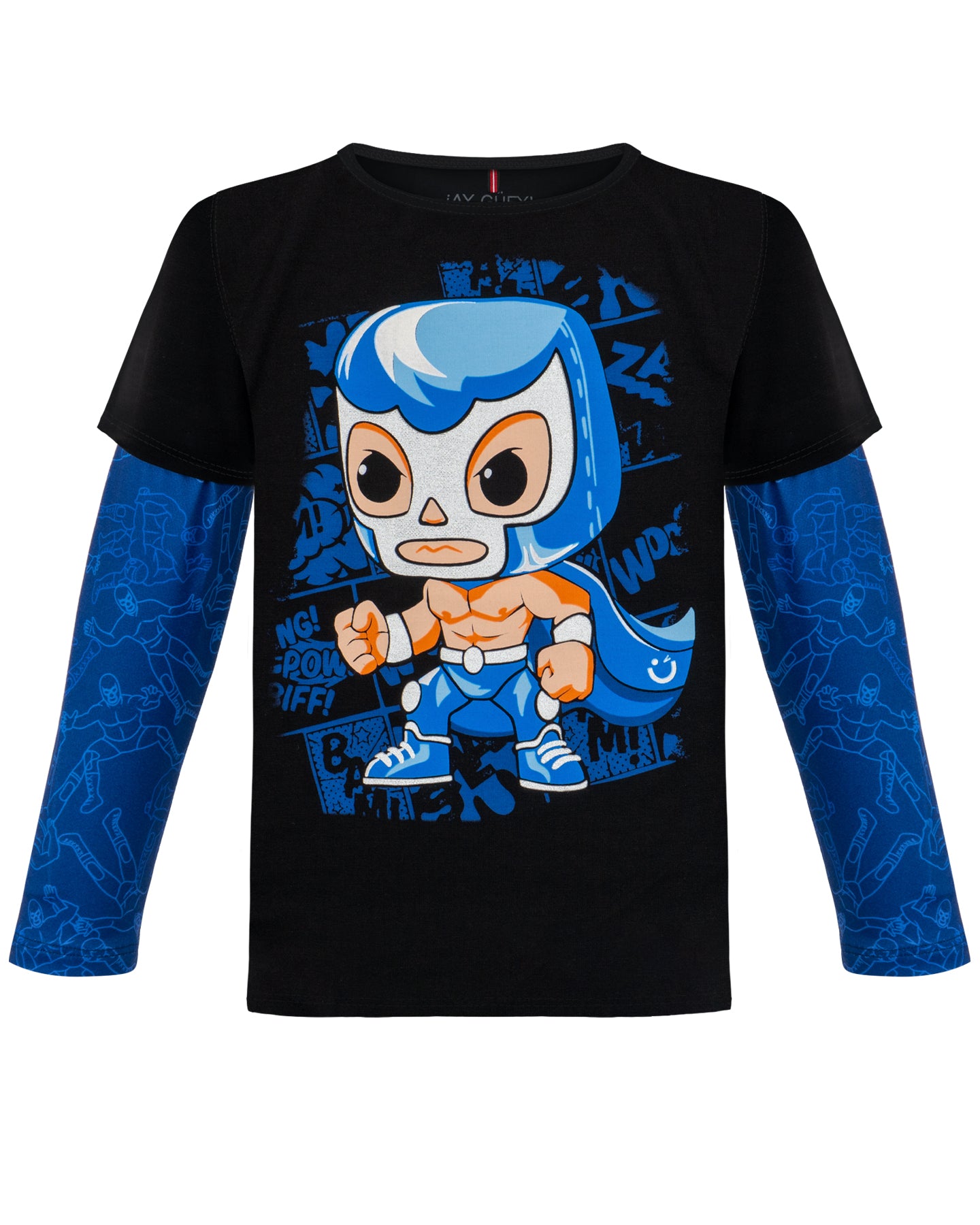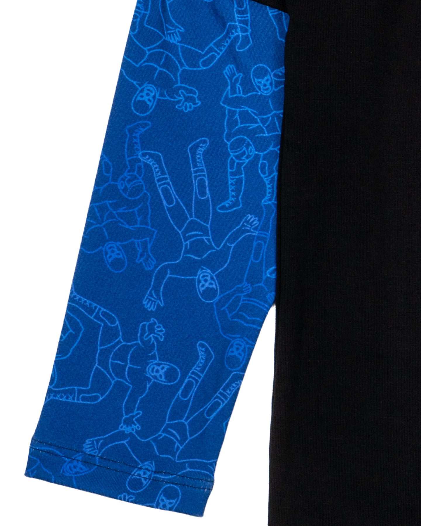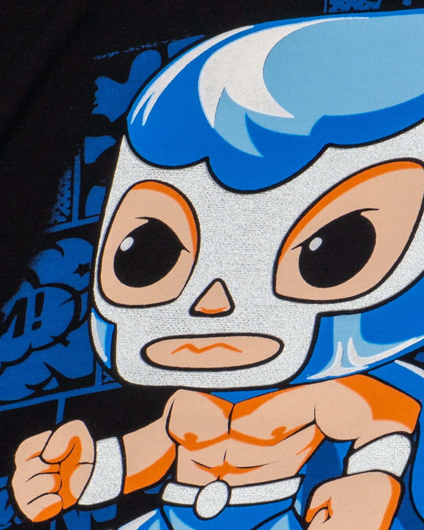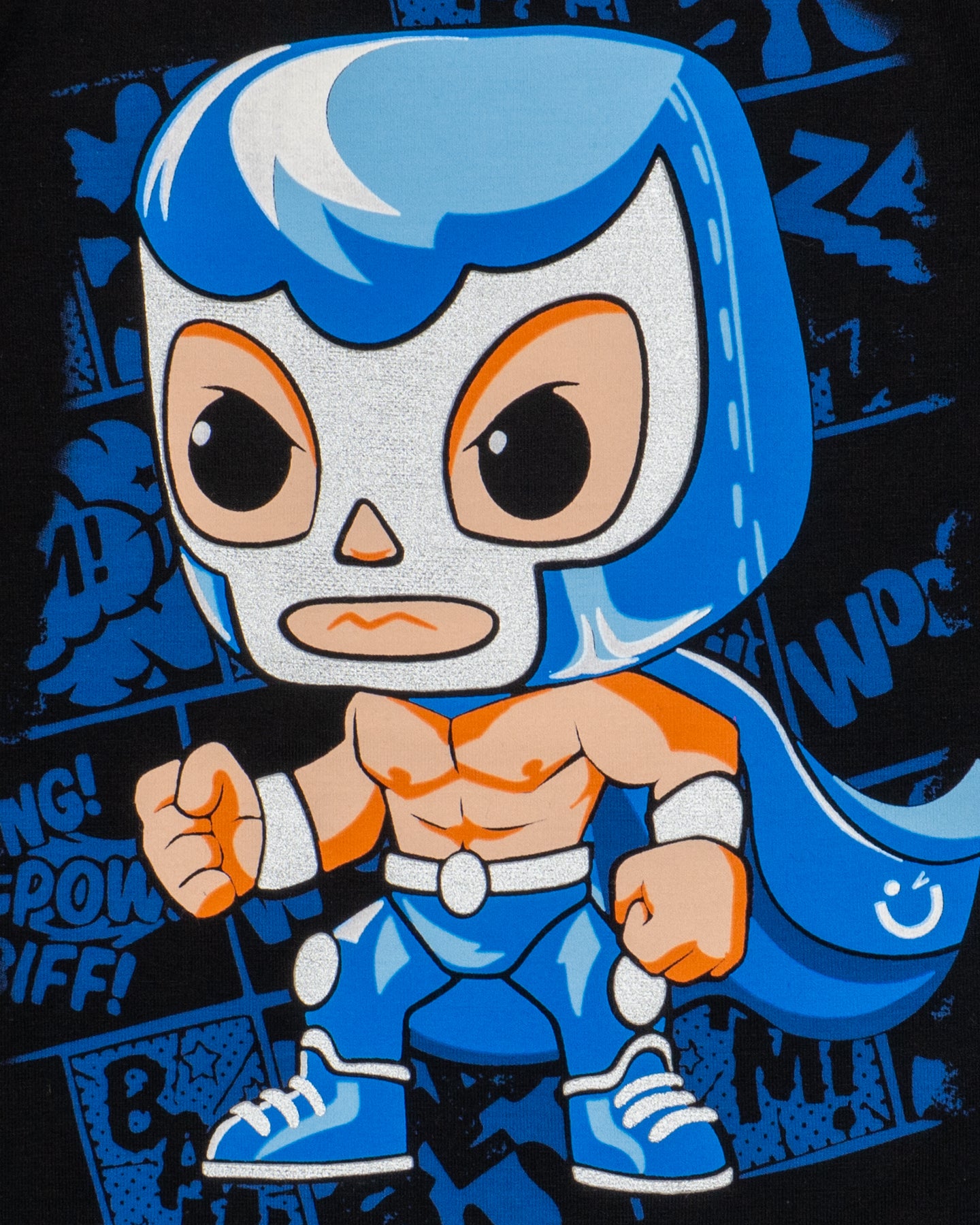 Esta es la playera perfecta para el pequeño campeón de la casa, inspirada en el legendario Blue Demon Jr. Presenta un llamativo diseño de doble manga que simula un look de capas para un estilo de acción. El centro muestra una ilustración vibrante y estilizada del luchador con su emblemática máscara azul y plateada, sobre un fondo de gráficos dinámicos y de cómic que gritan "¡Poder!".