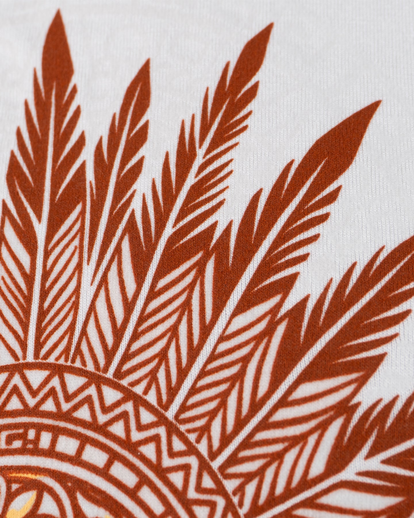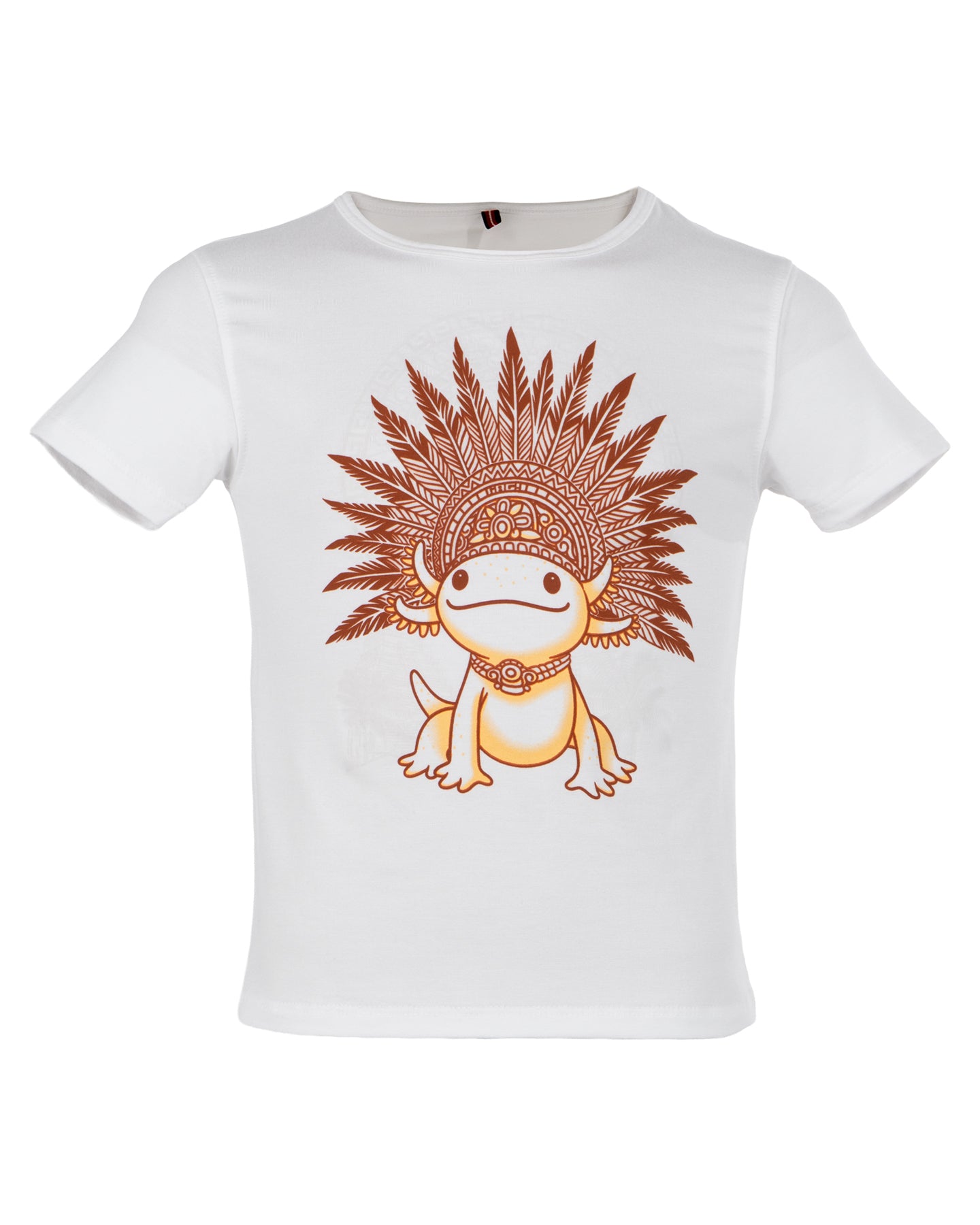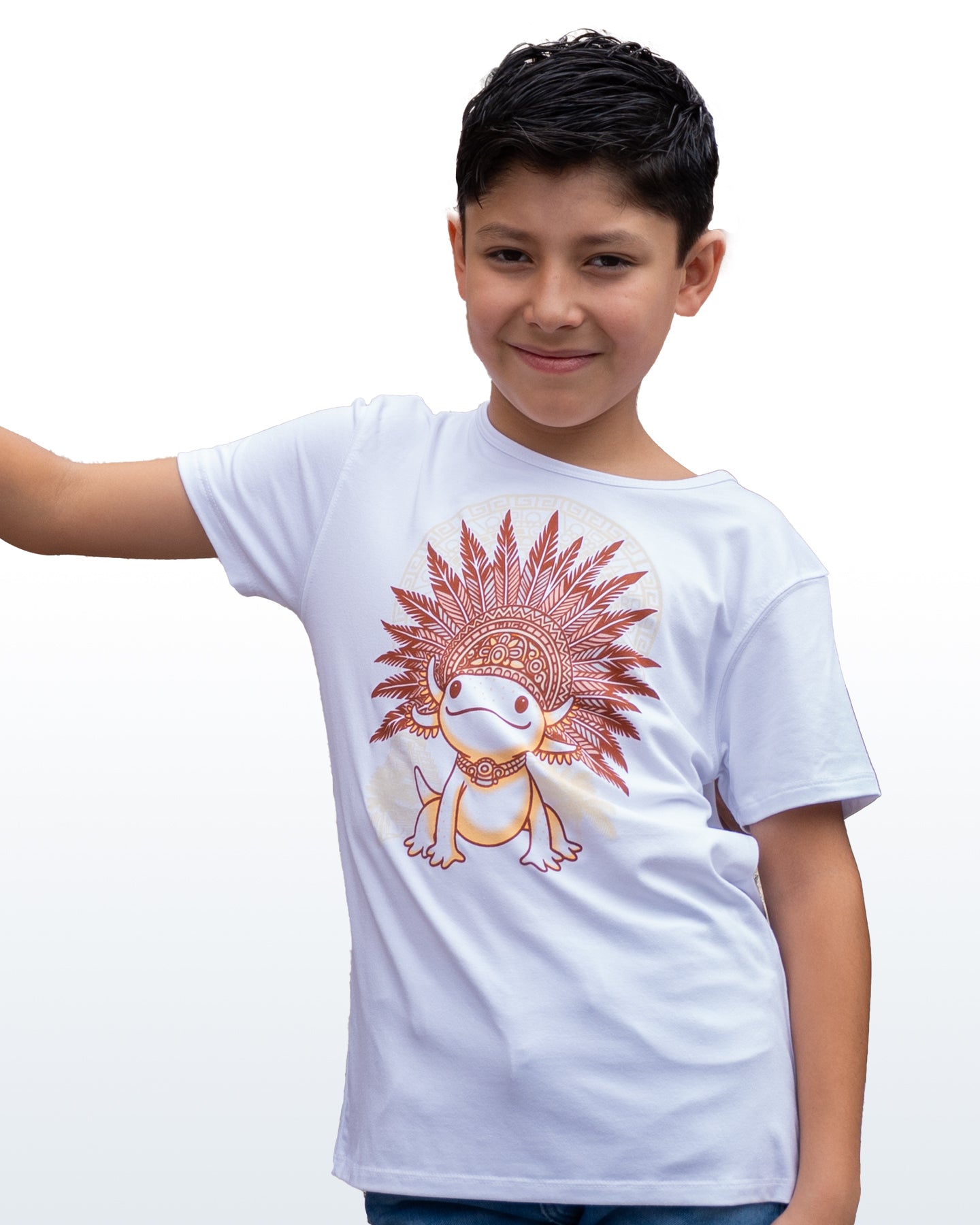 Esta playera nace de la fusión entre la fauna endémica mexicana y la herencia prehispánica. El ajolote, símbolo de regeneración y sabiduría ancestral, es representado aquí con un penacho ceremonial que evoca la grandeza de las culturas mexica y maya. Su gesto tierno y sereno recuerda que el poder no siempre viene del rugido, sino también de la calma.