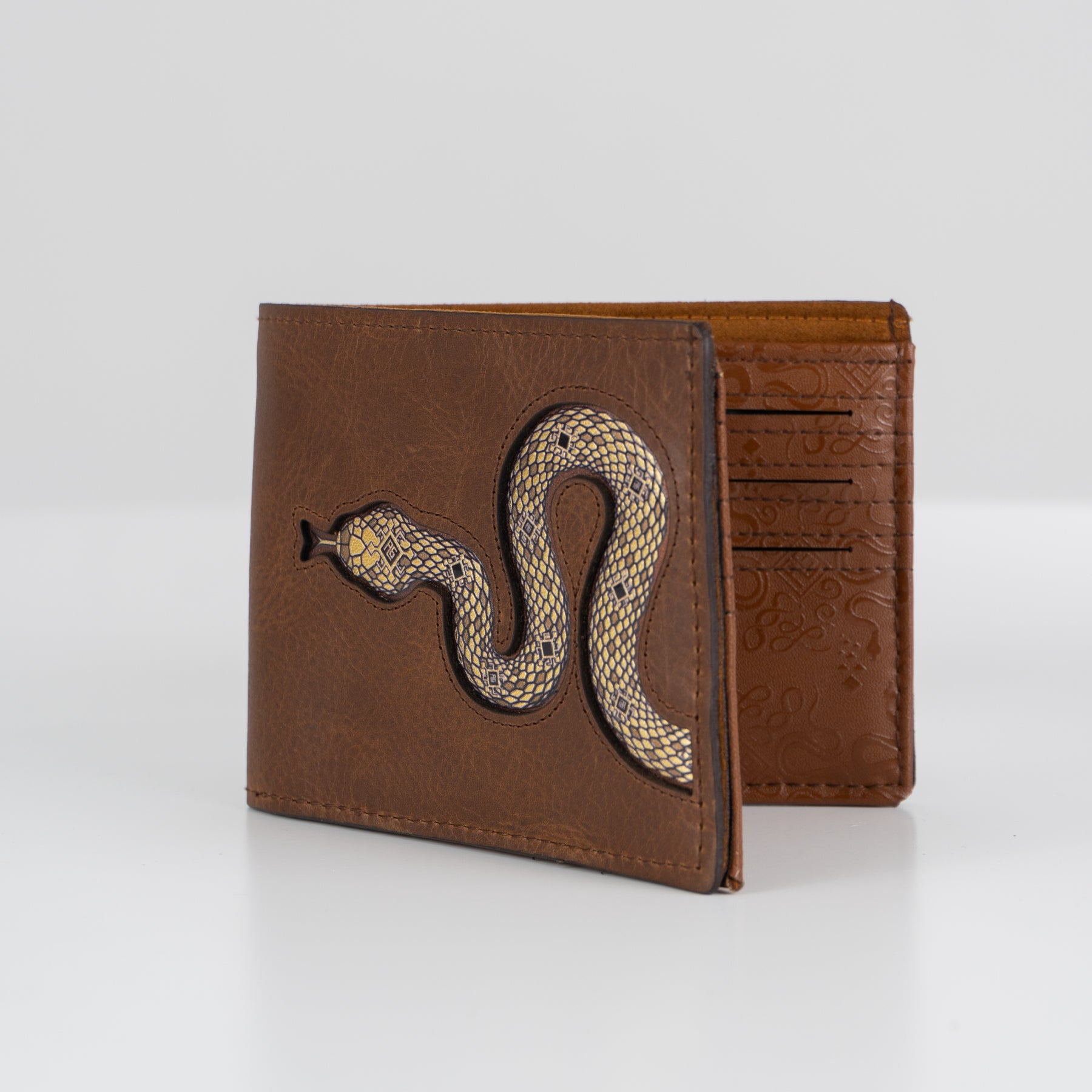 Cartera de piel en color café con gráfico de serpiente en tonos dorados.