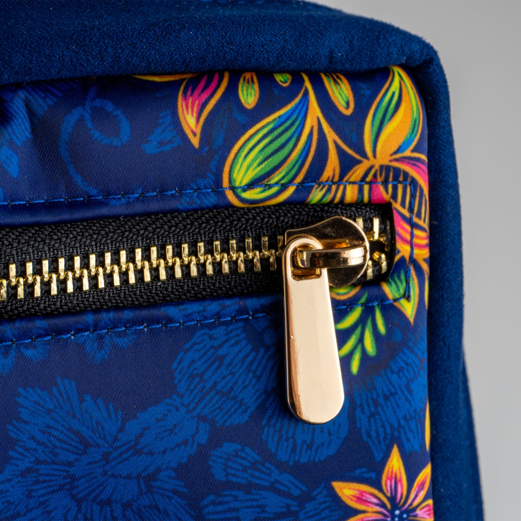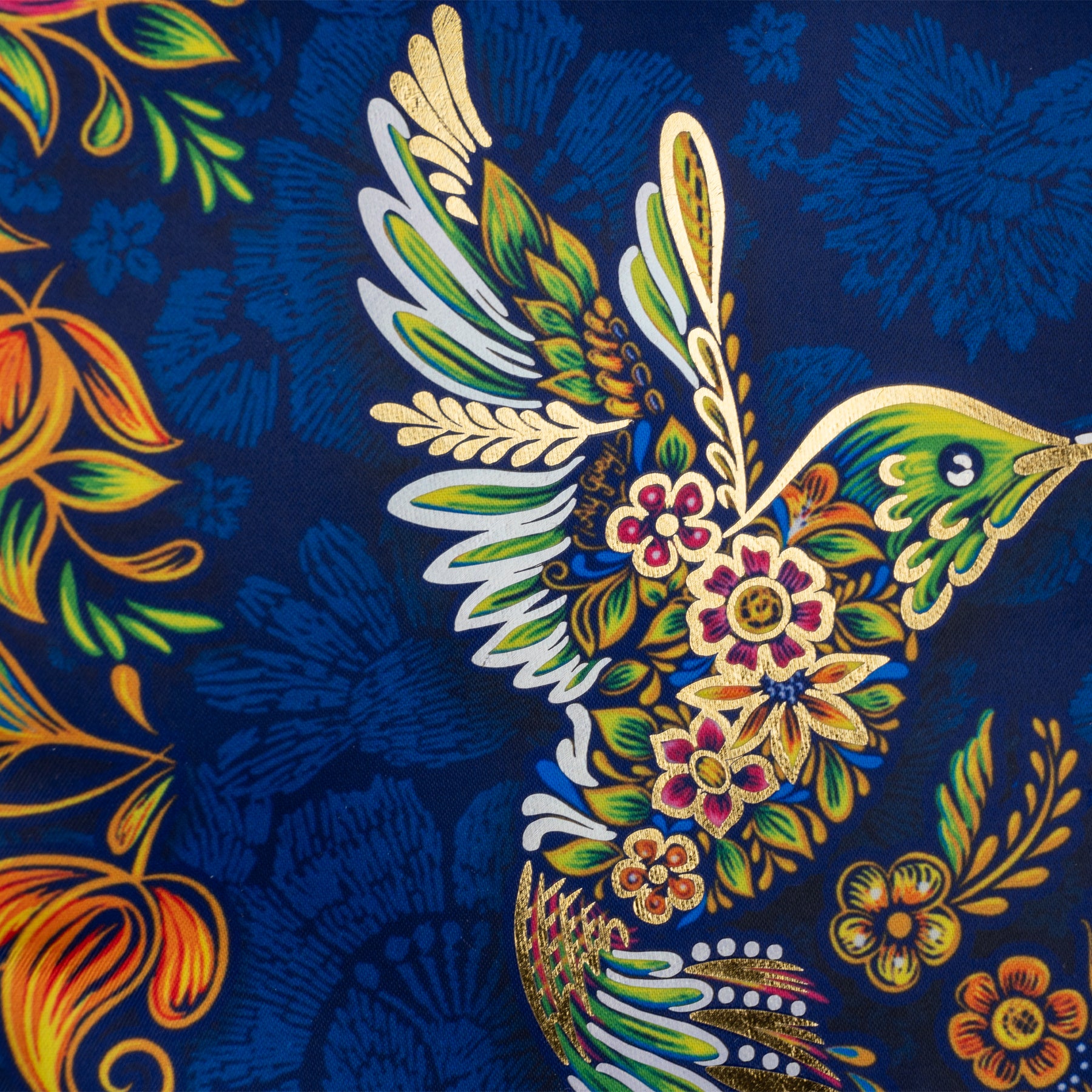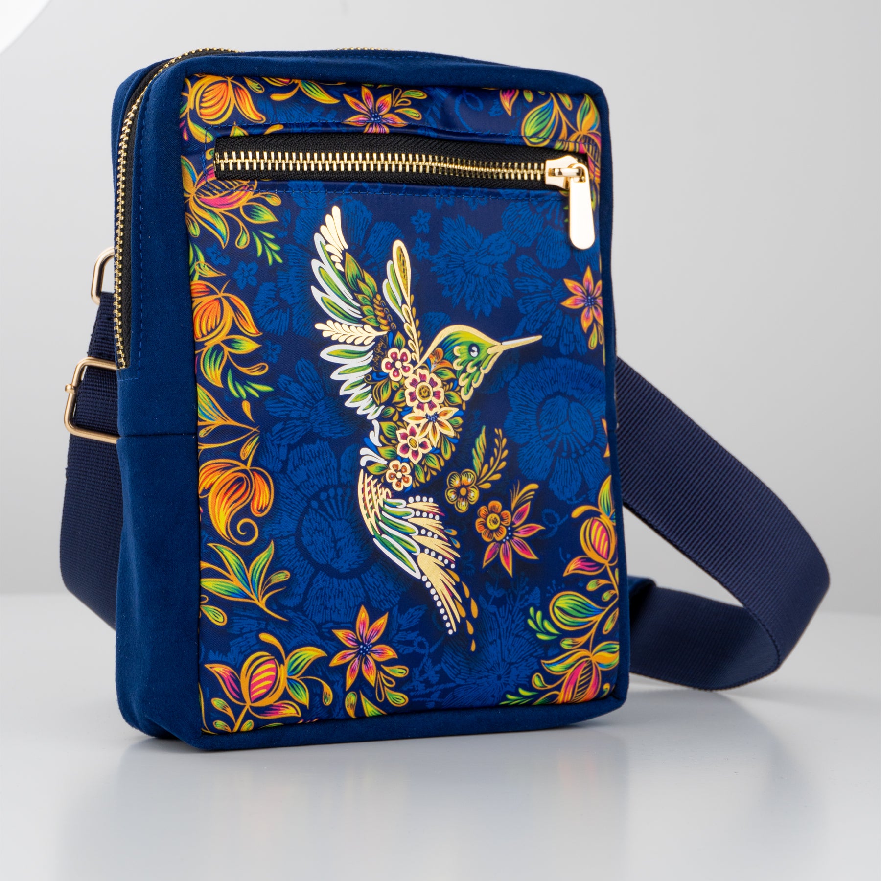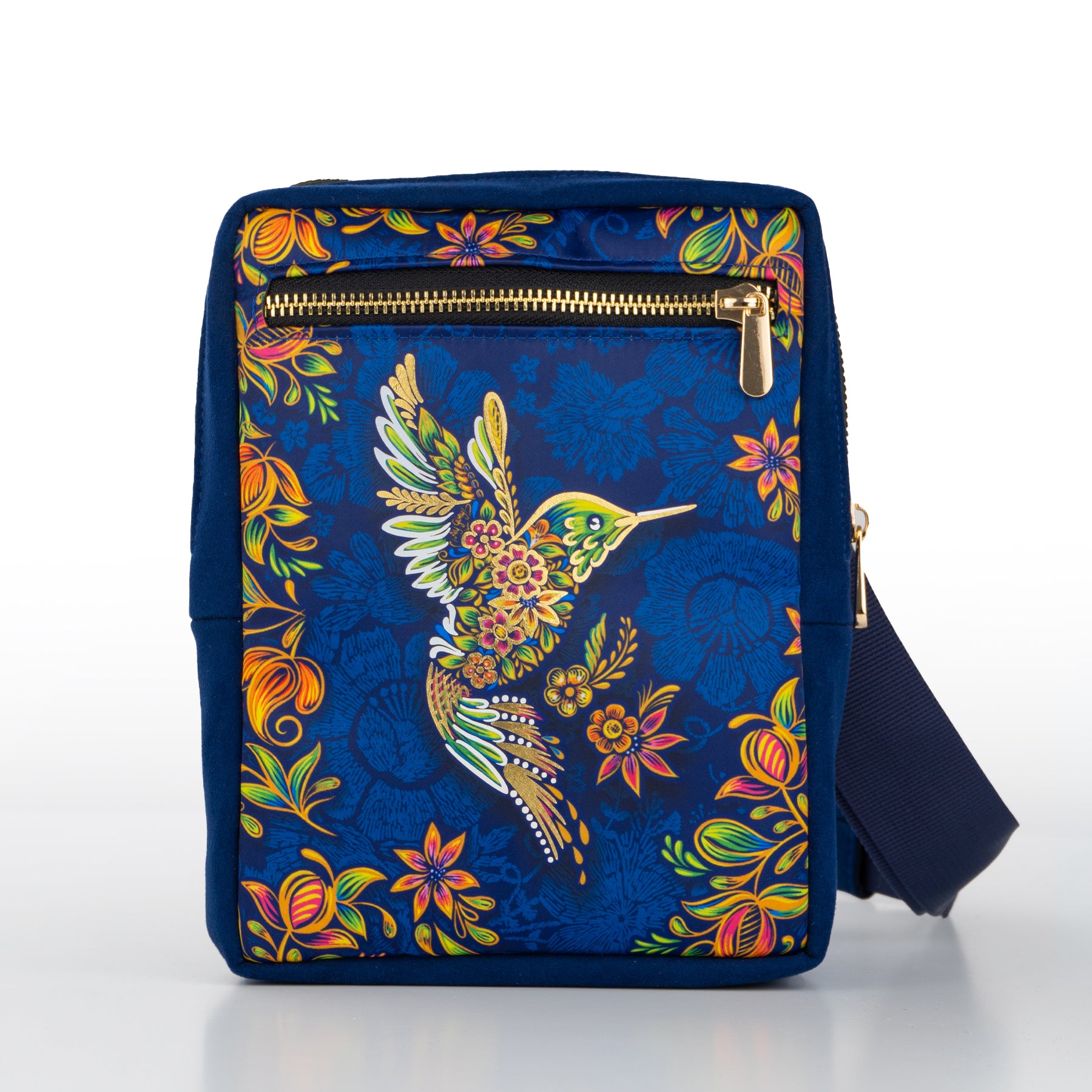 Mochila tipo bandolera, con correa de de tela, inspirada en el colibrí y la primavera.