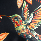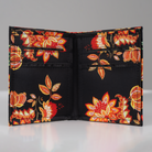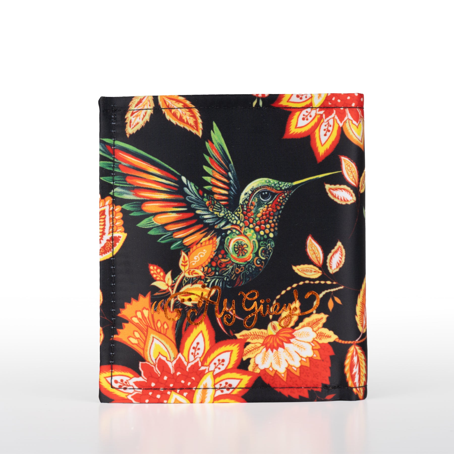Billetera en tonos naranjas, verde y negros que tiene como protagonista al colibrí, el mensajero de los buenos deseos.