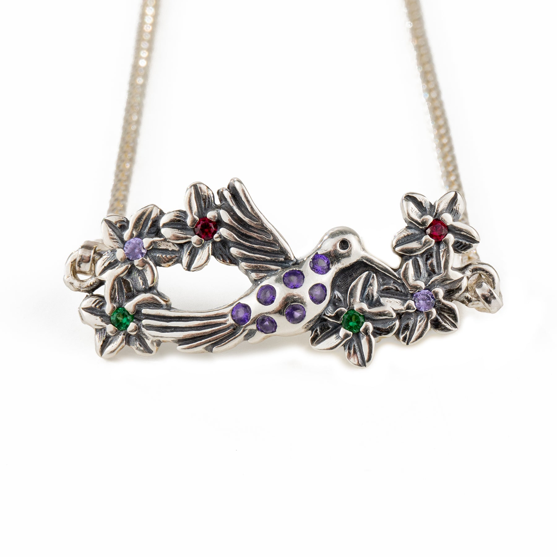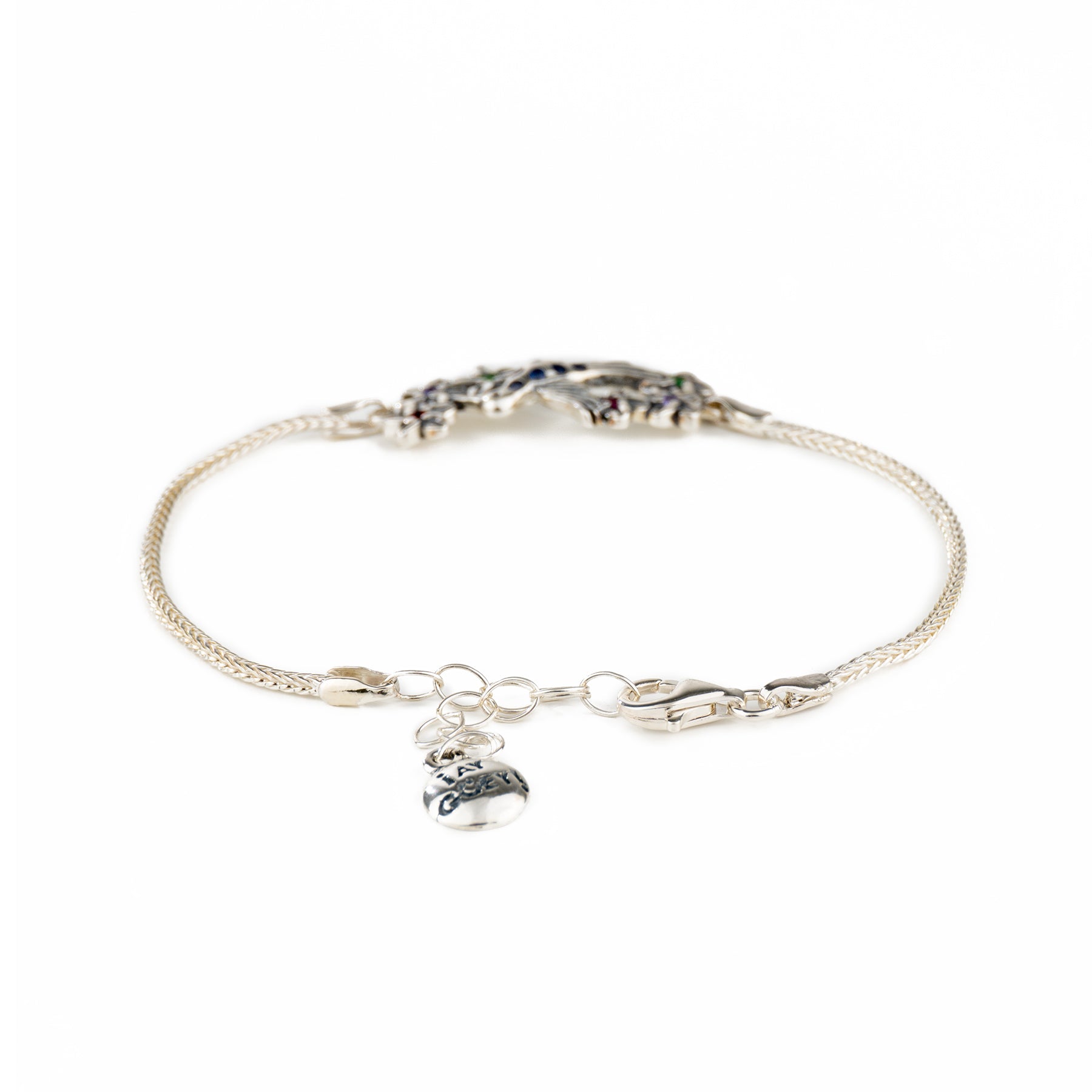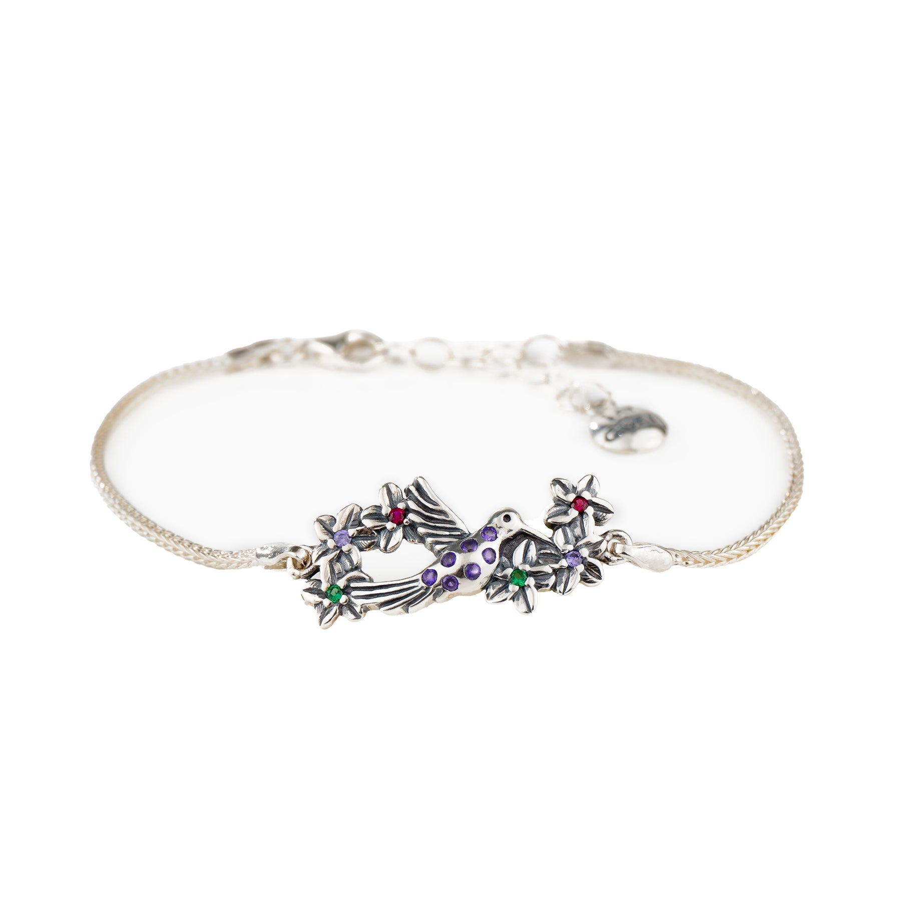 Brazalete de plata con dije y circonias Moradas - Colección COLIBRÍ FLORES