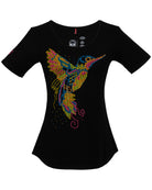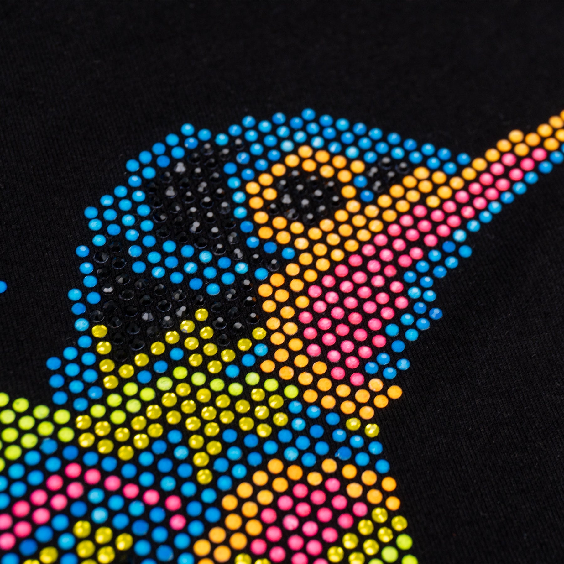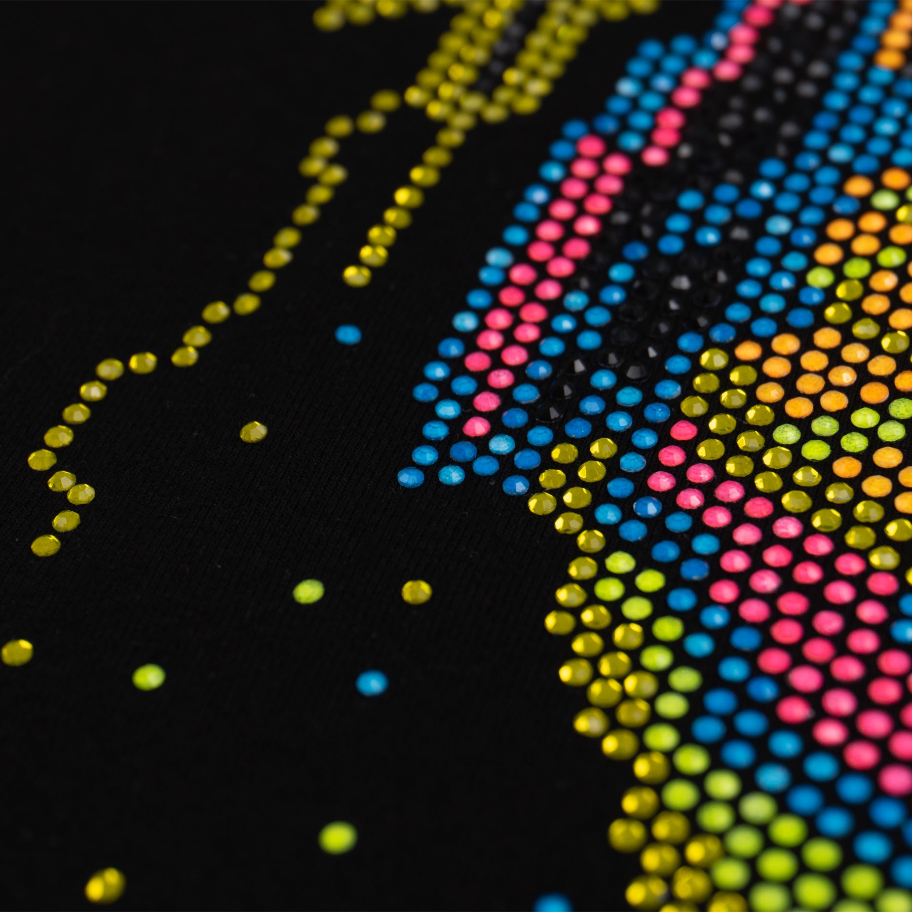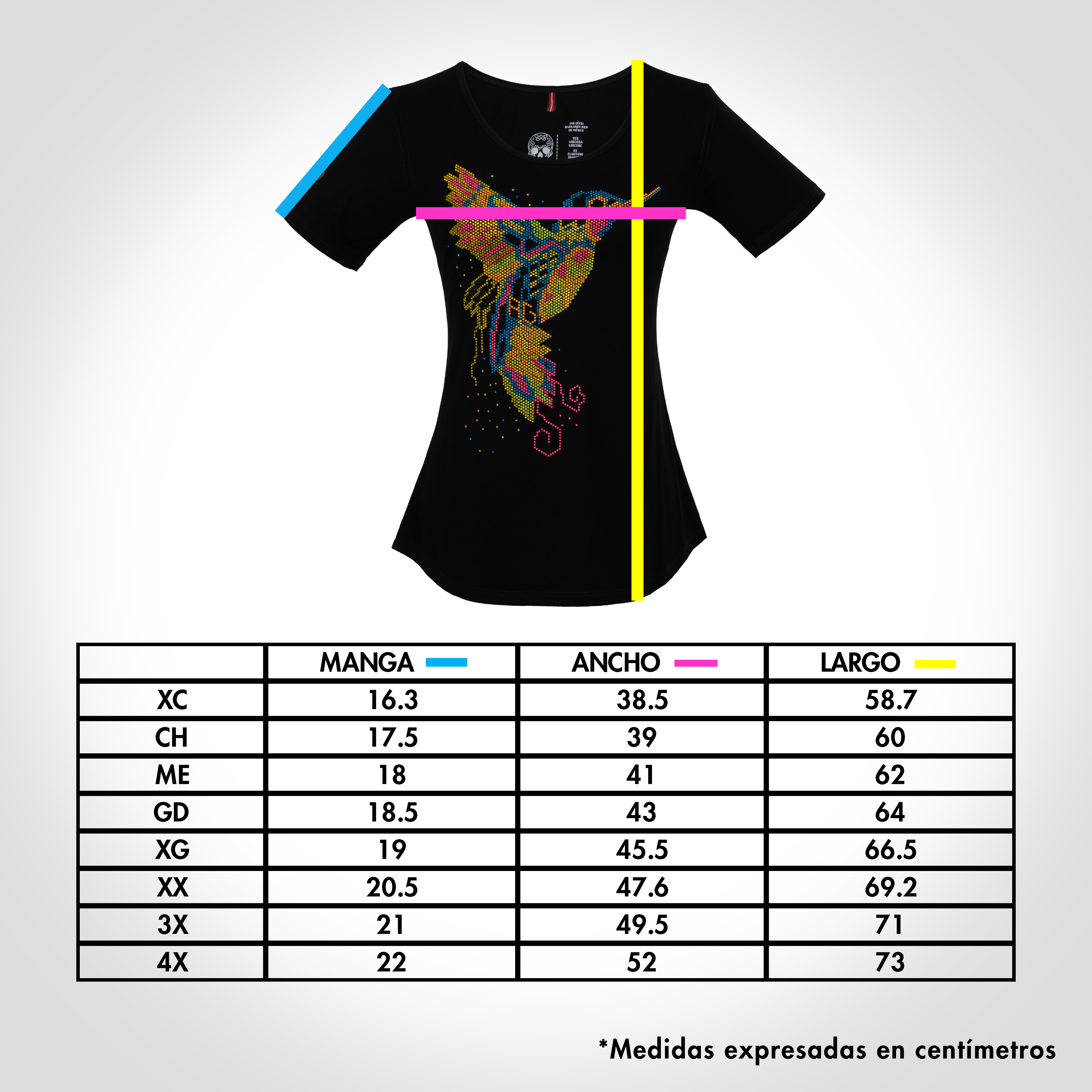 Pajaritos a volar, playera de dama que es una explosión de color y alegría. Su base curva acentúa tu figura, mientras que las mangas cortas te brindan comodidad y frescura. Cada centímetro del estampado está adornado con pedrería de neón que brilla intensamente, convirtiéndote en el centro de atención.