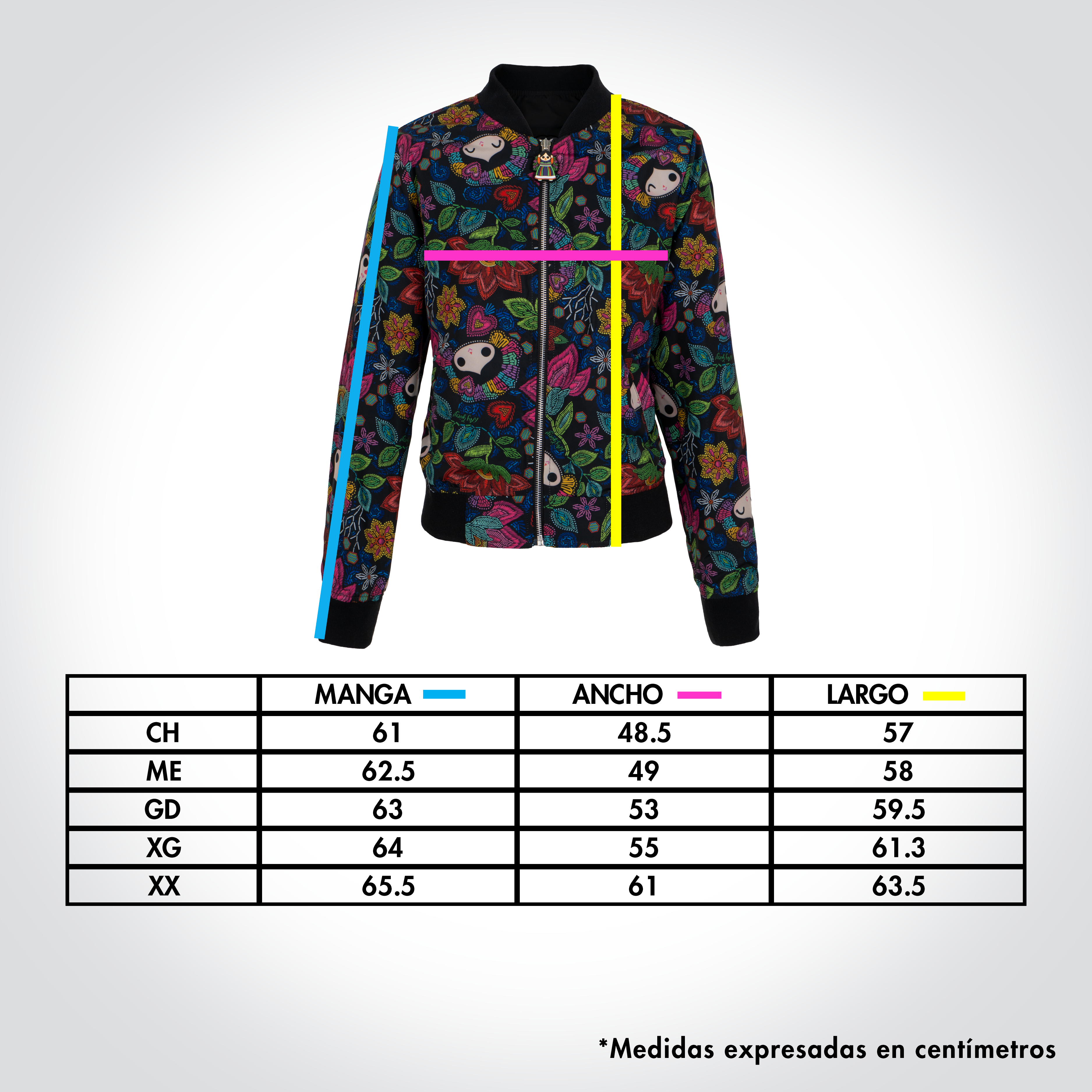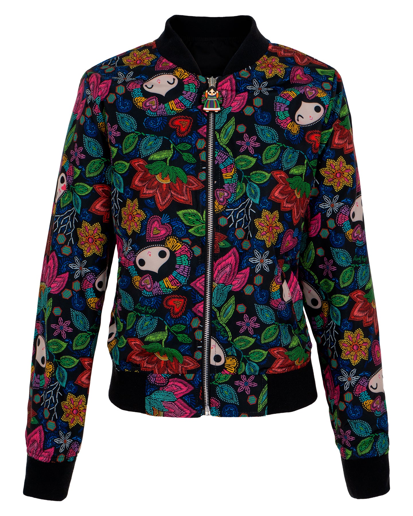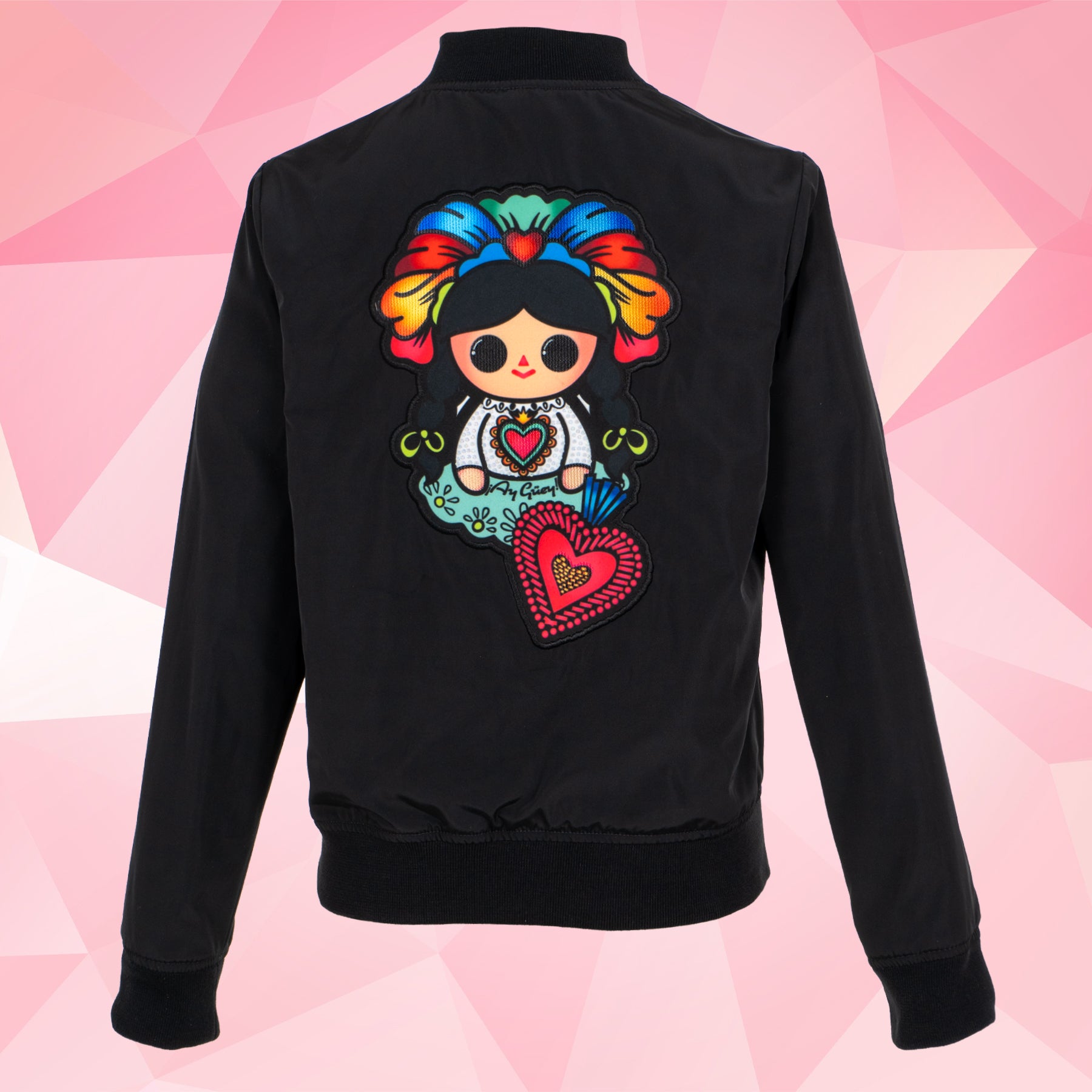 Chamarra doble vista con diseño inspirado en Petrita, nuestra interpretación de la muñeca mazahua. Cuenta con detalles bordados en la espalda, además de aplicación de pedrería en el parche.