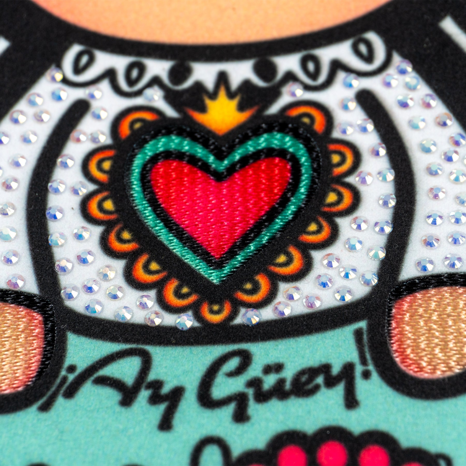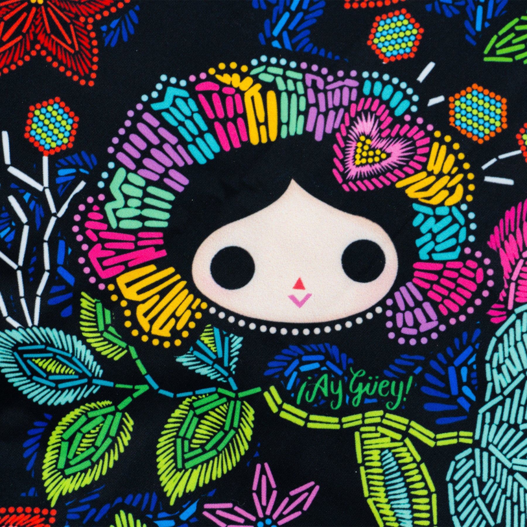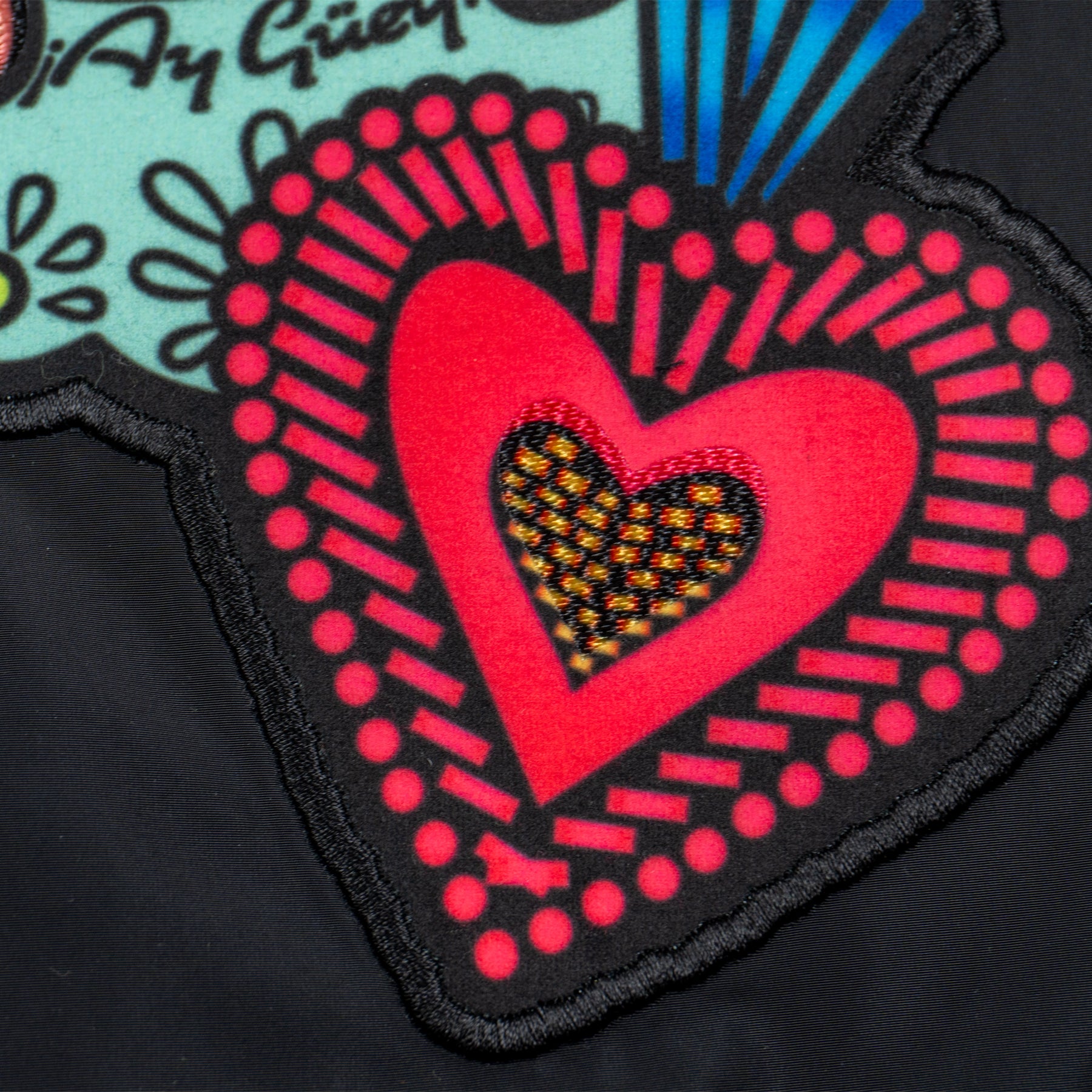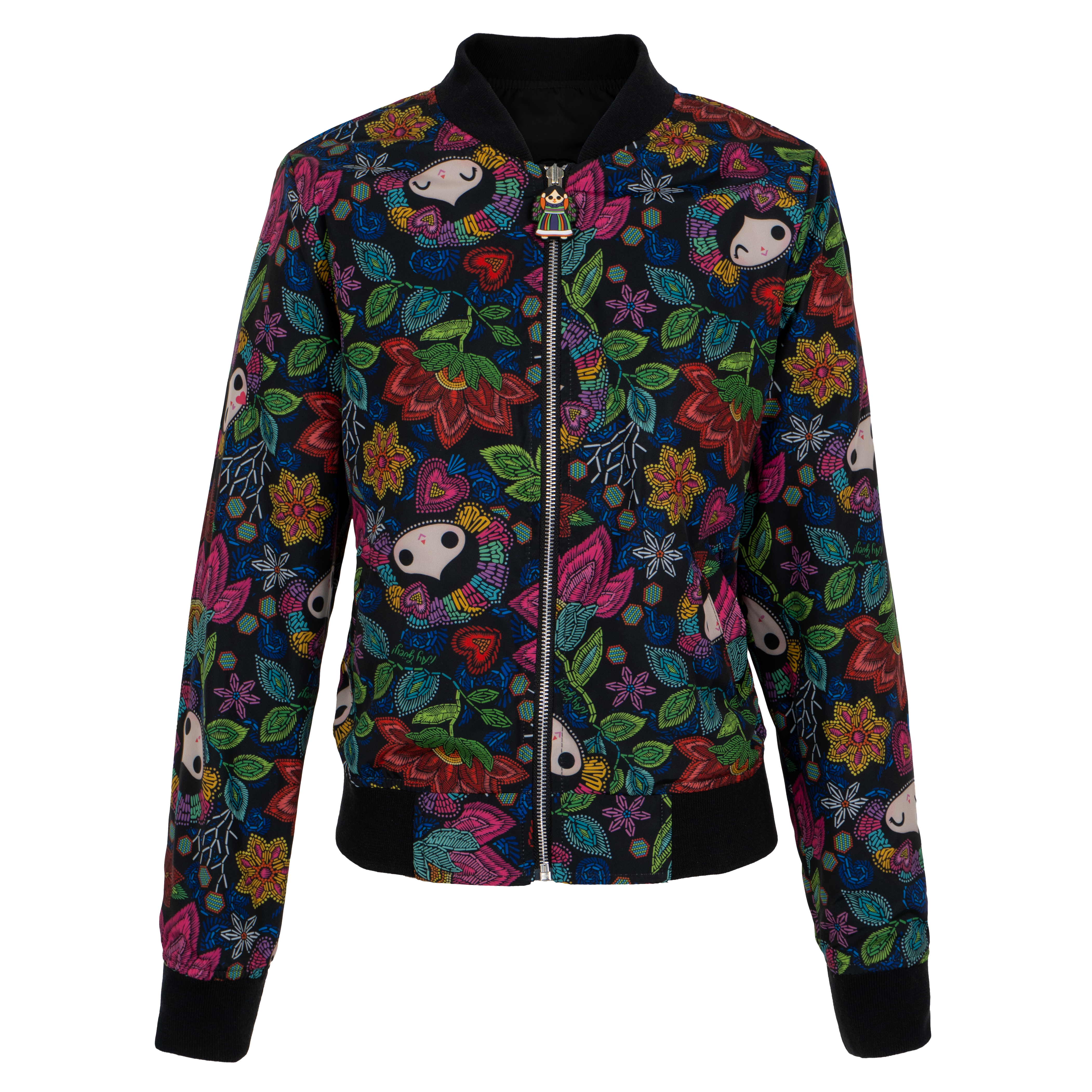 Chamarra doble vista con diseño inspirado en Petrita, nuestra interpretación de la muñeca mazahua. Cuenta con detalles bordados en la espalda, además de aplicación de pedrería en el parche.