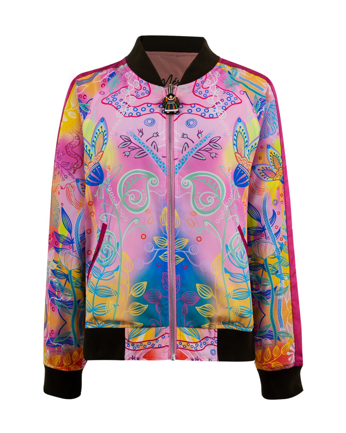 Vista 1: Estampado vibrante de motivos florales y botánicos en tonos shocking. El reverso destaca con un impresionante bordado de colibrí de cola larga, ricamente detallado.