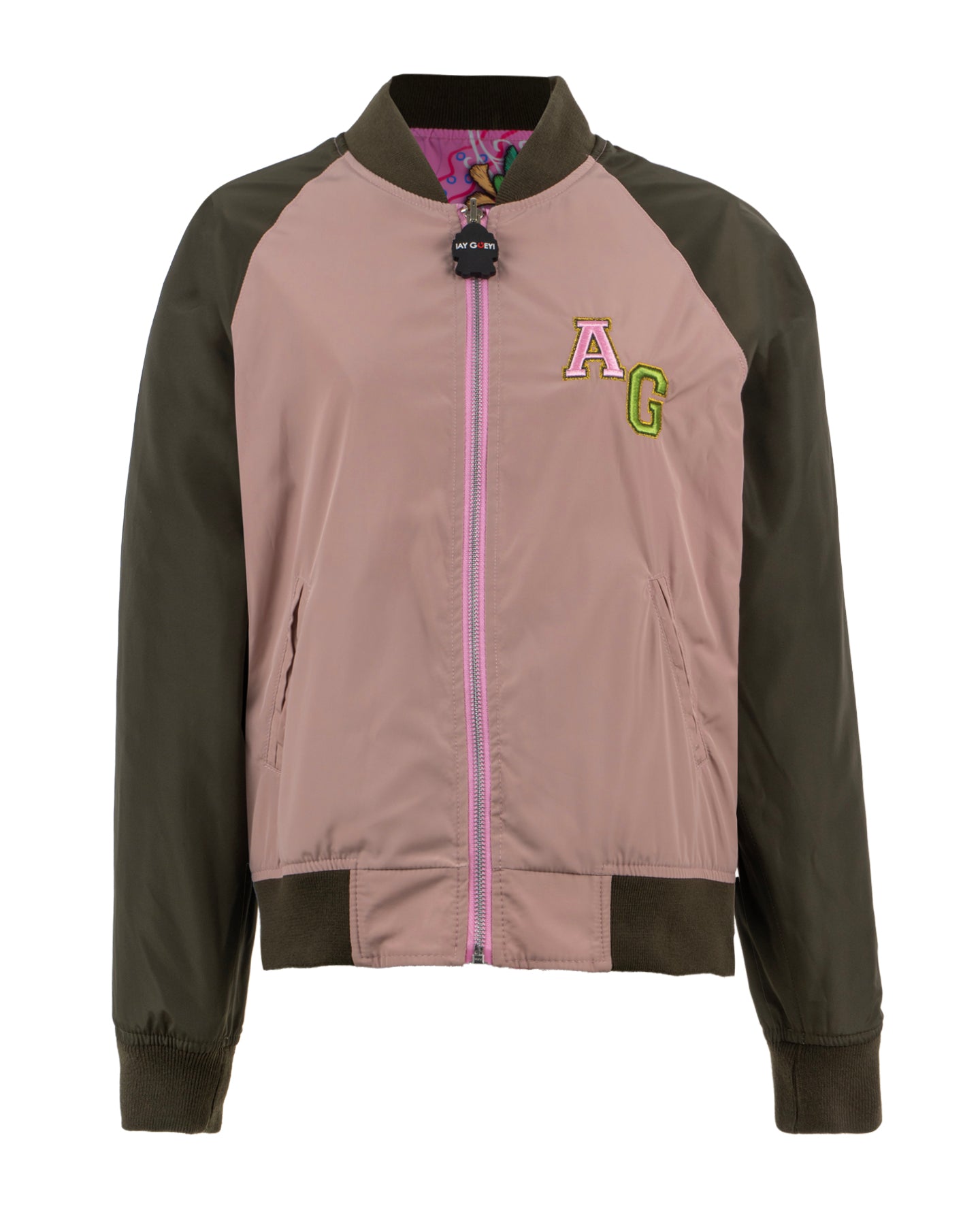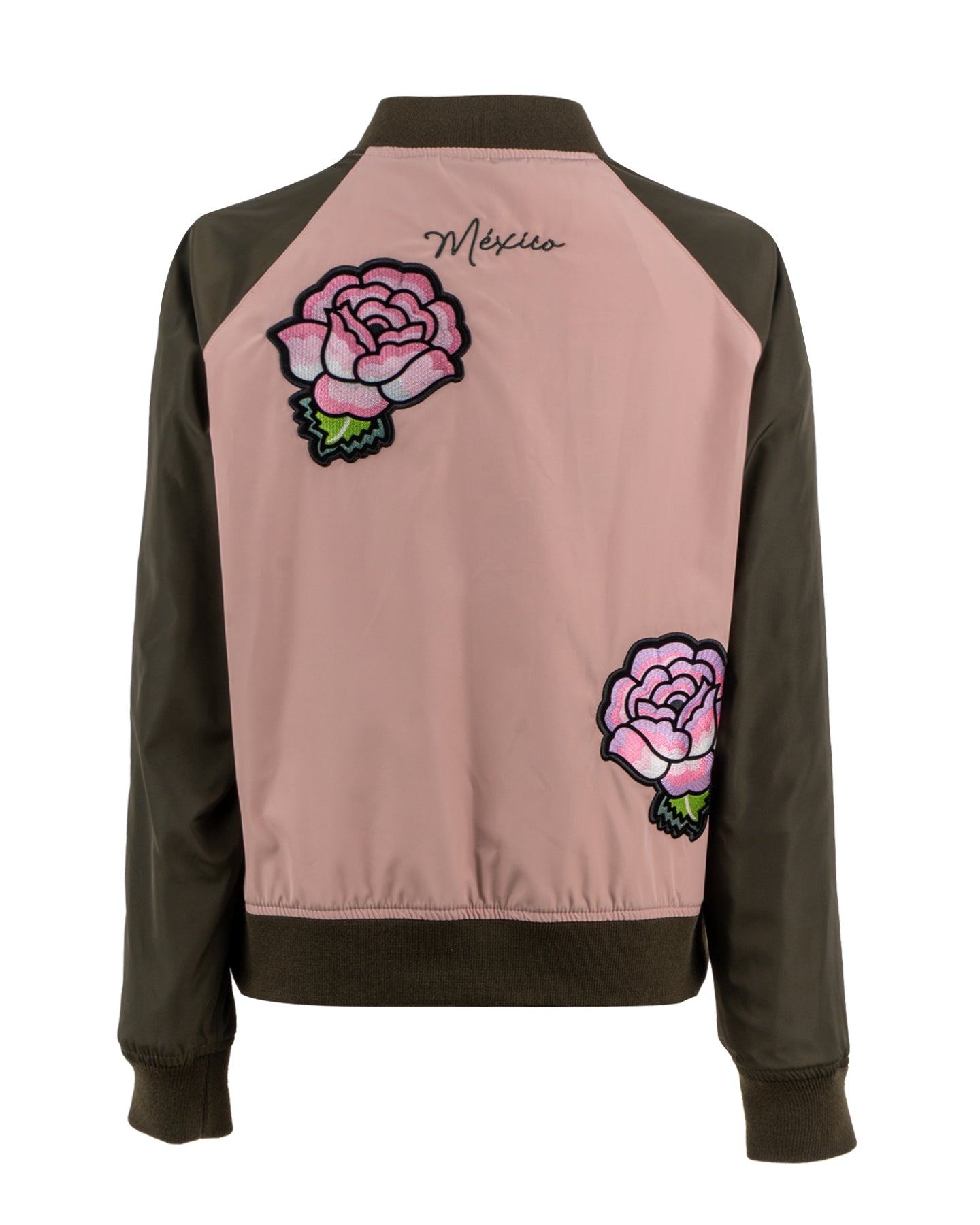 Vista 2: Estilo varsity en rosa palo y mangas verde olivo. El reverso presenta delicados bordados de rosas y la palabra "México", ofreciendo un look más discreto pero igualmente chic.