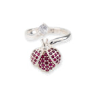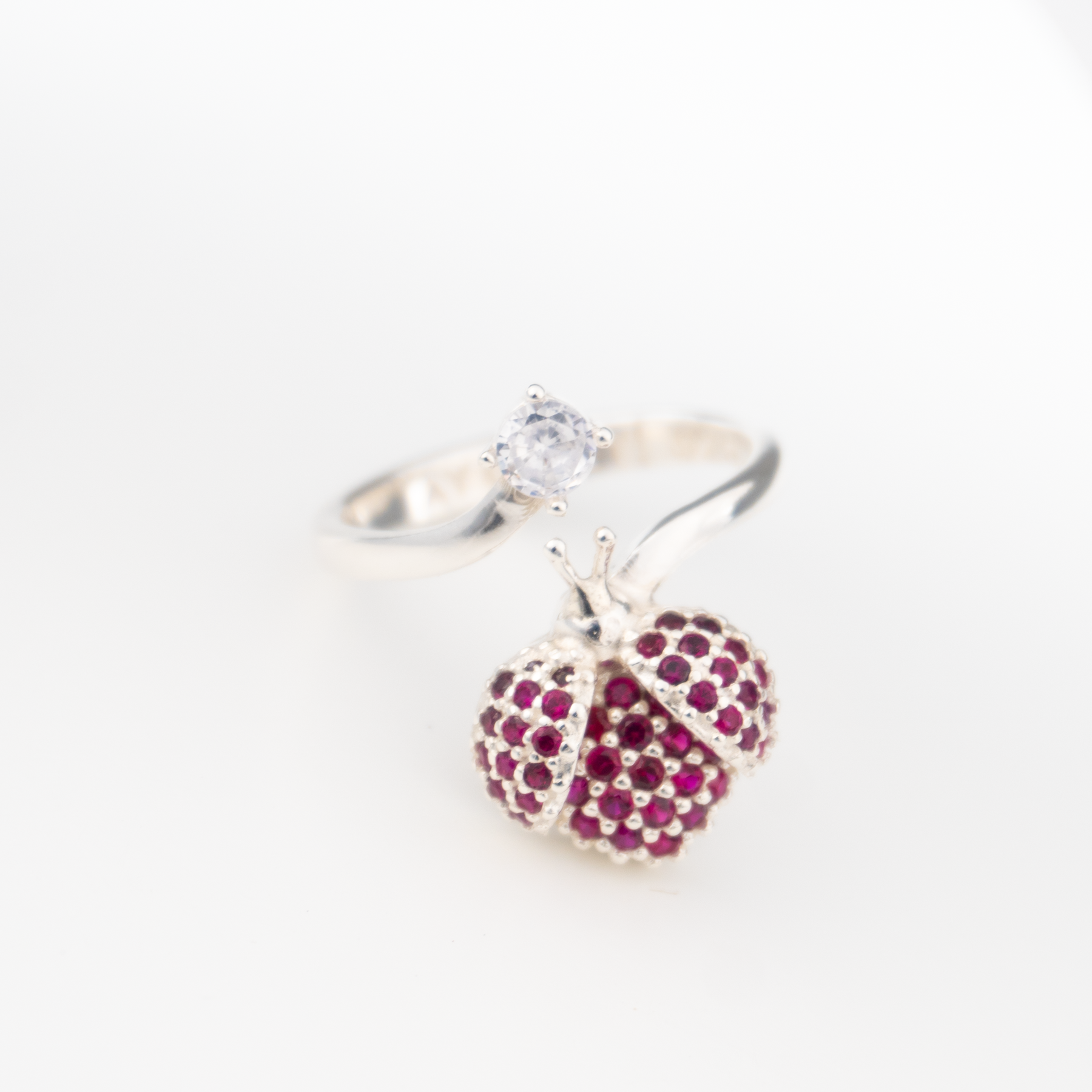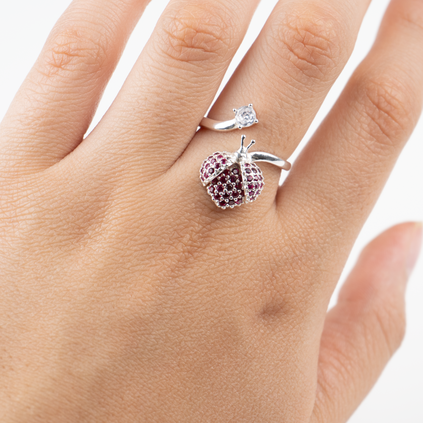 Hermoso anillo de plata con dije en forma de catarina. Se adapta al dedo gracias a su diseño abierto. Con incrustaciones de brillantes en tonalidad rosa, hechos de plata ley 925, estas piezas son una combinación perfecta de elegancia y durabilidad.
