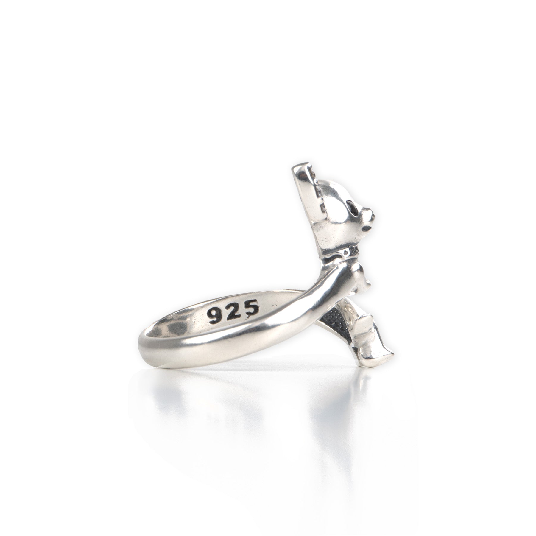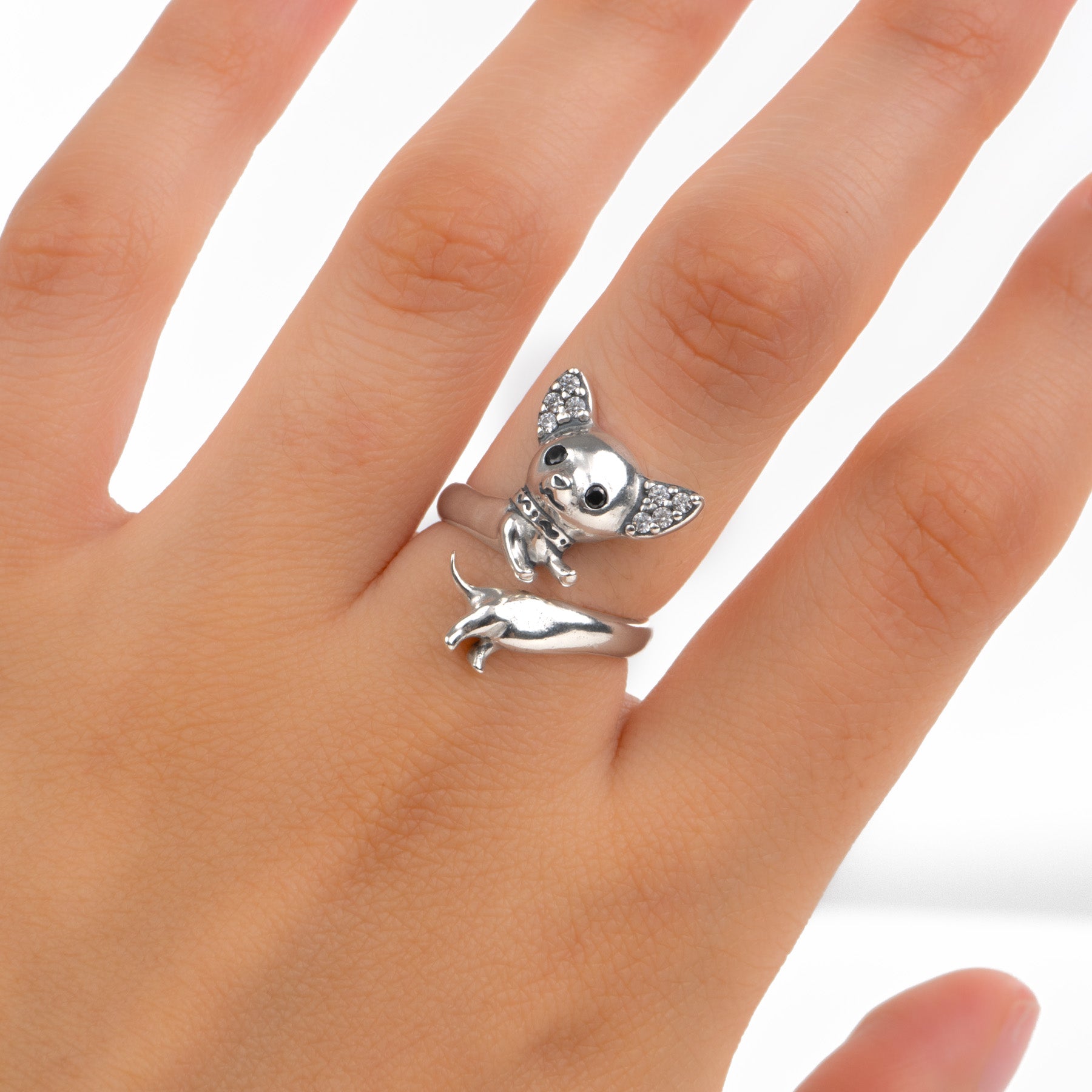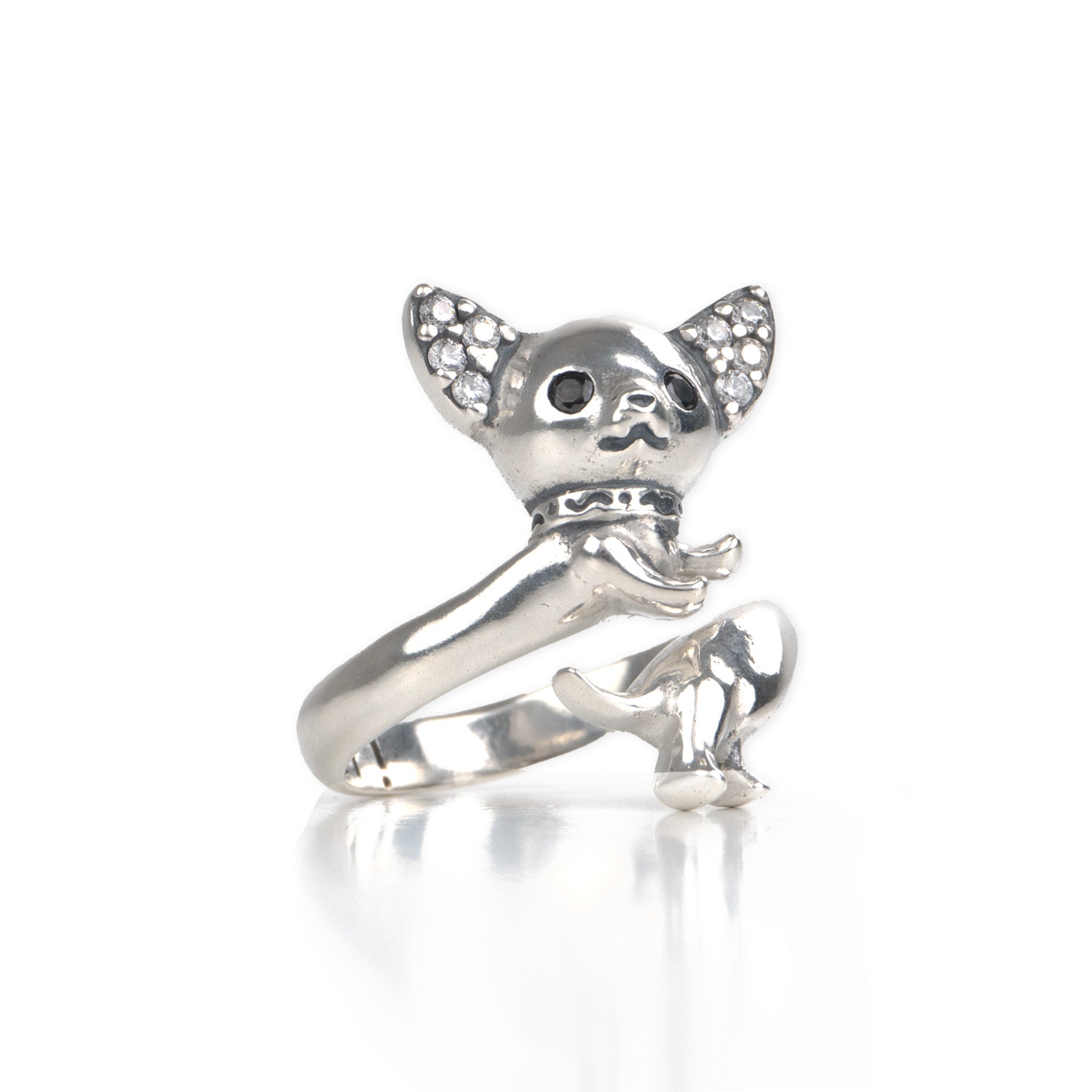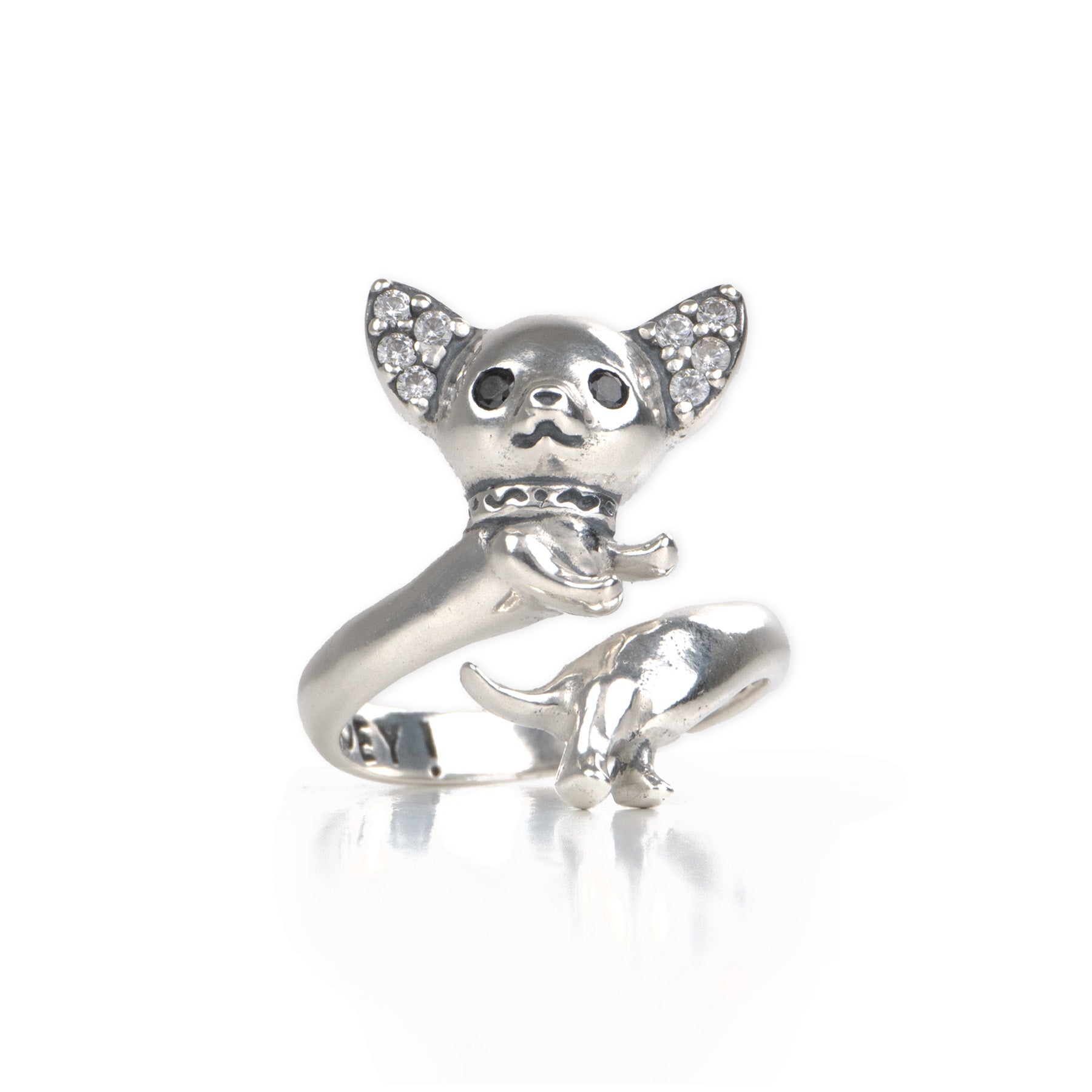 Hermoso anillo de plata con dije en forma de perrito chihuahua. Se adapta al dedo gracias a su diseño abierto.