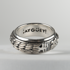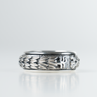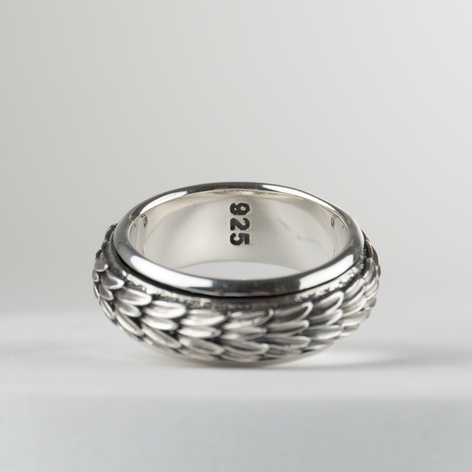 Anillo giratorio con el relieve de Quetzalcóatl que rodea toda la pieza. Su mecanismo giratorio ayuda a reducir el estrés al manipular el aro exterior.