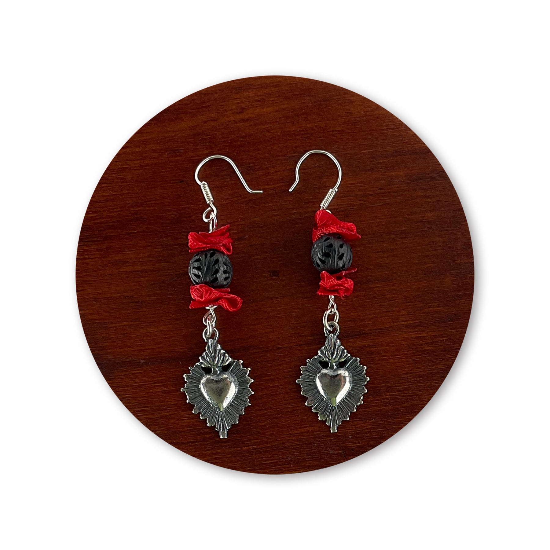 Estos aretes culminan con dos pendientes en forma de sagrado corazón, que representan el amor y el agradecimiento.