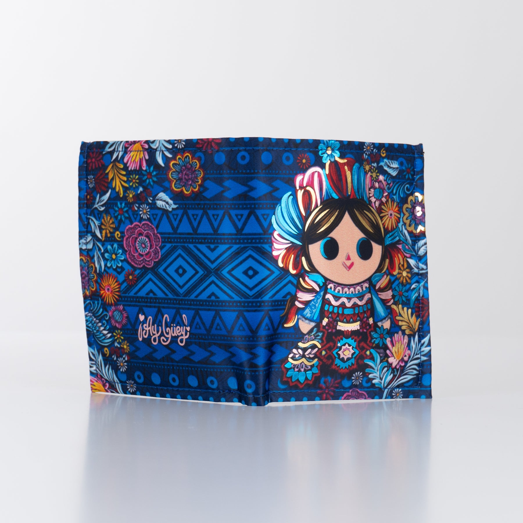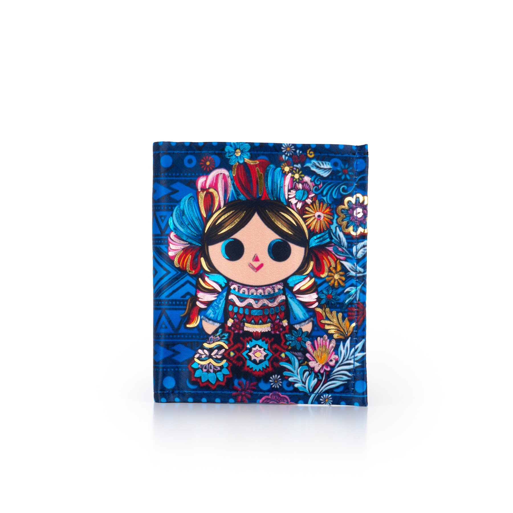 Billetera en color azul y foil metalizado que tiene como protagonista a nuestra muñeca Petrita.