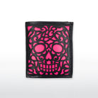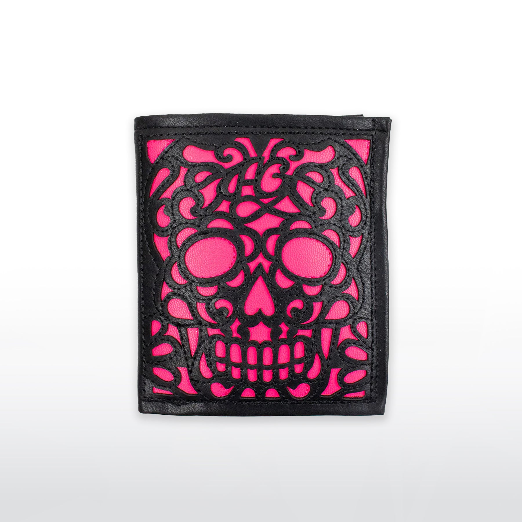 Billetera de dama con diseño inspirado en las calaveras de azúcar.