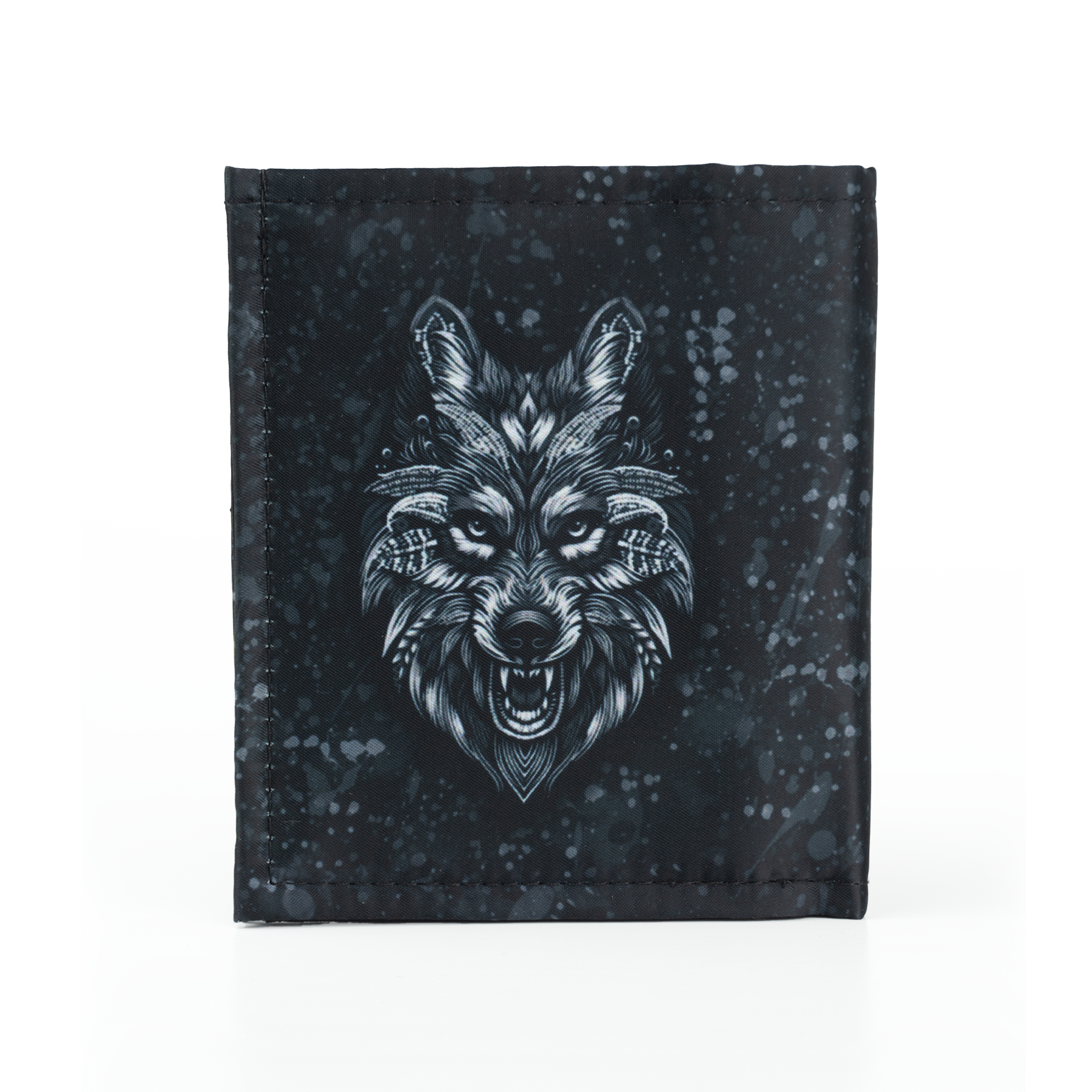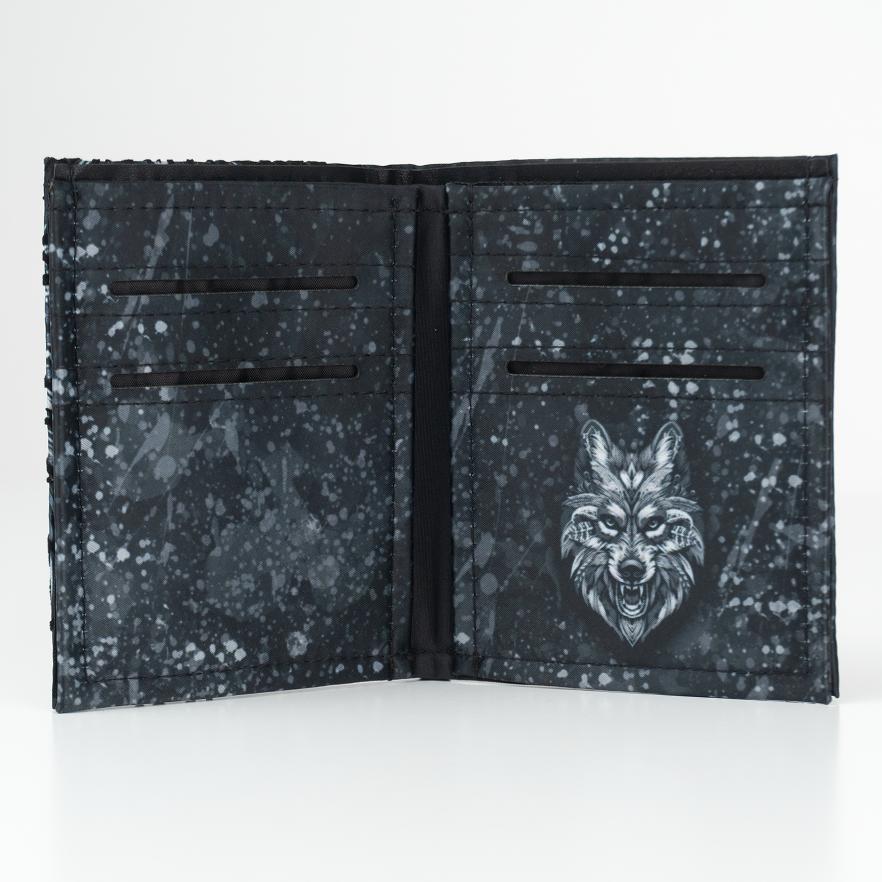 Billetera full print con aplicaciones de vinil metalizado y flock.
