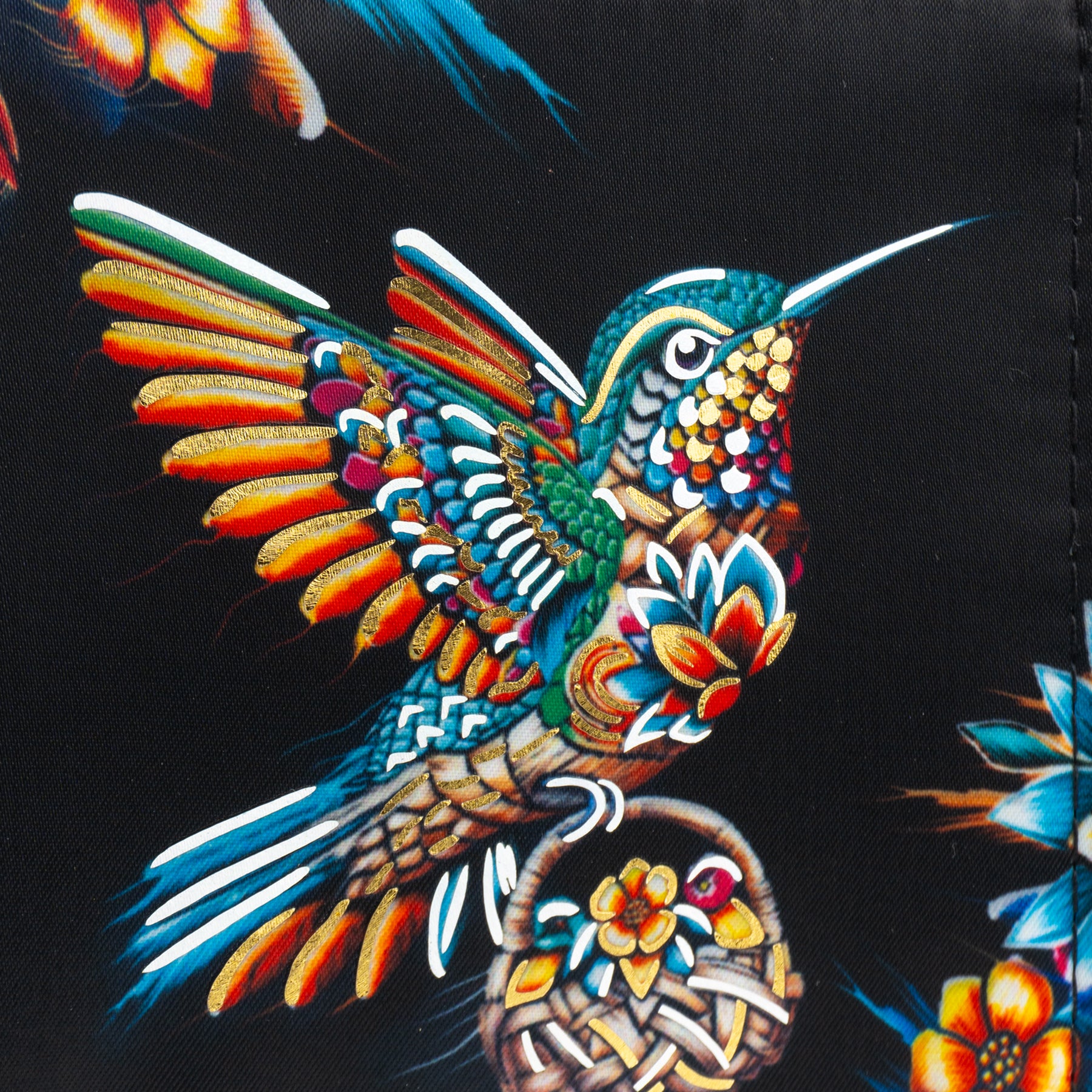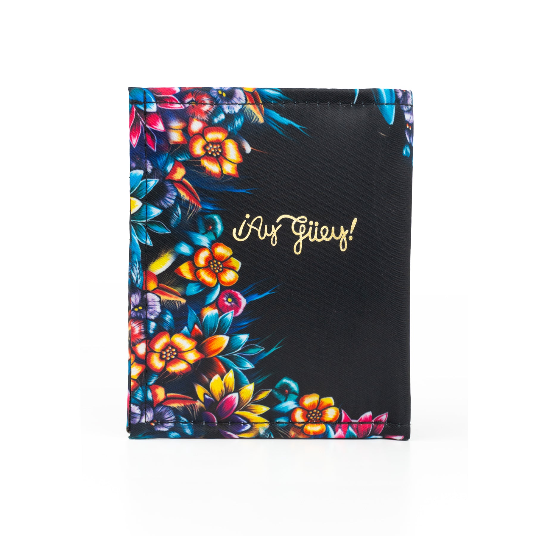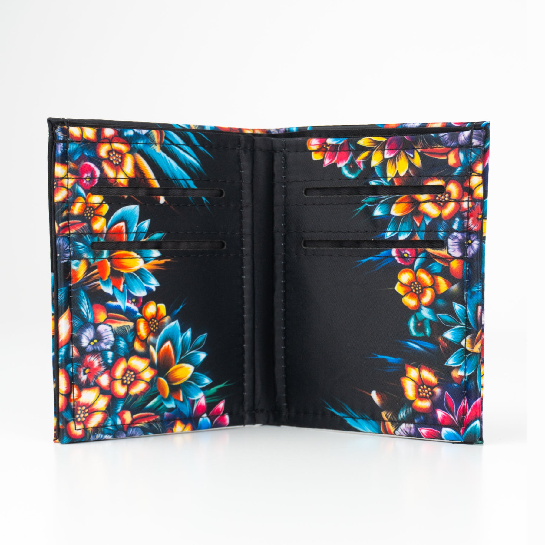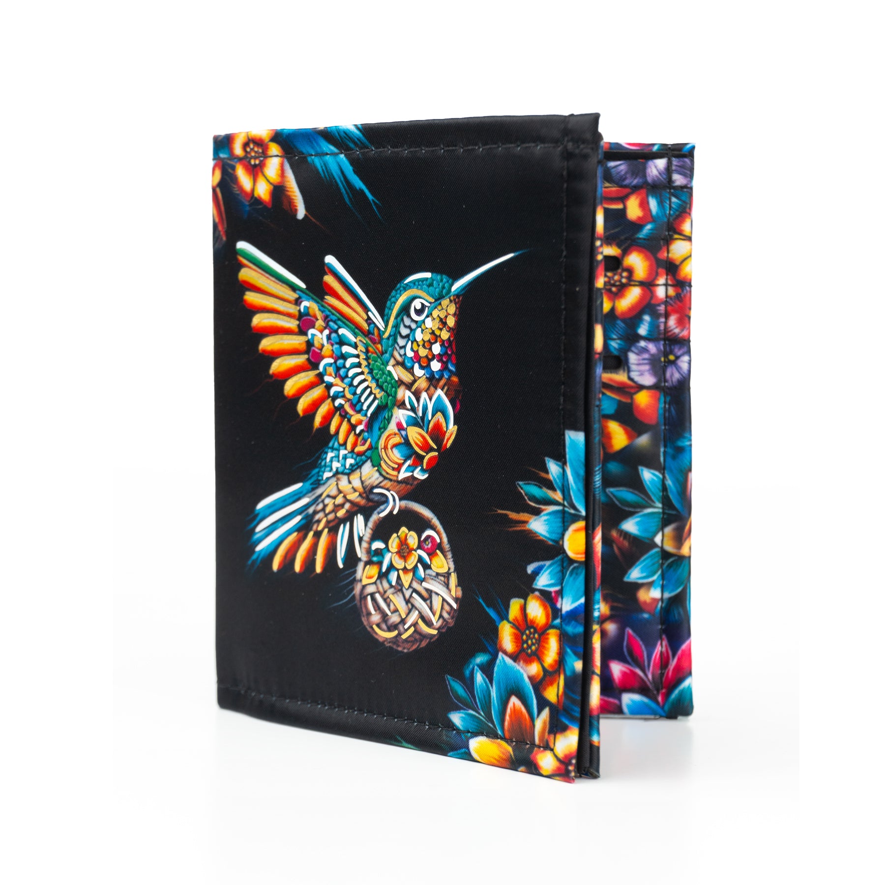 Billetera en color negro y foil metalizado inspirado en los colibrís y el colorido de la primavera.