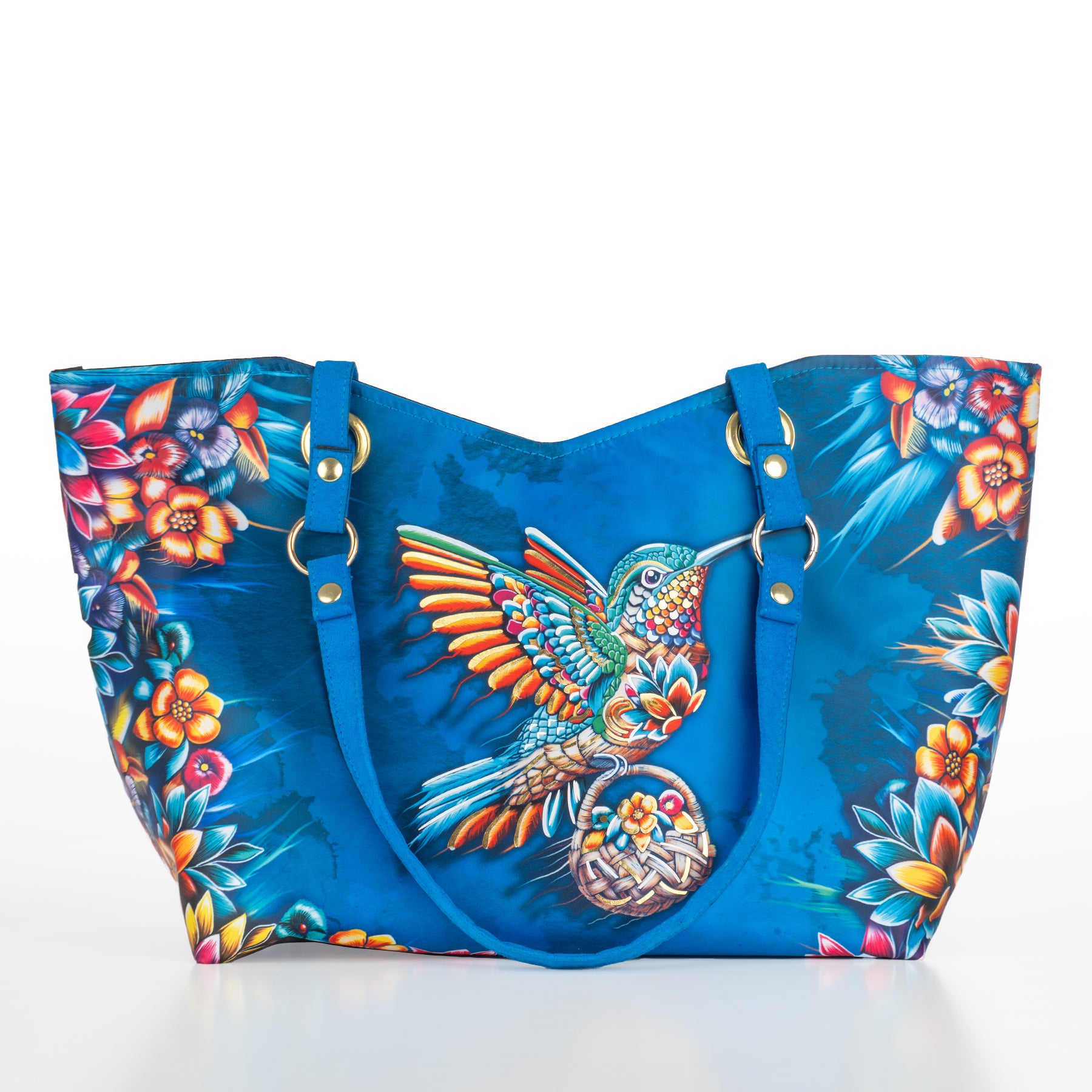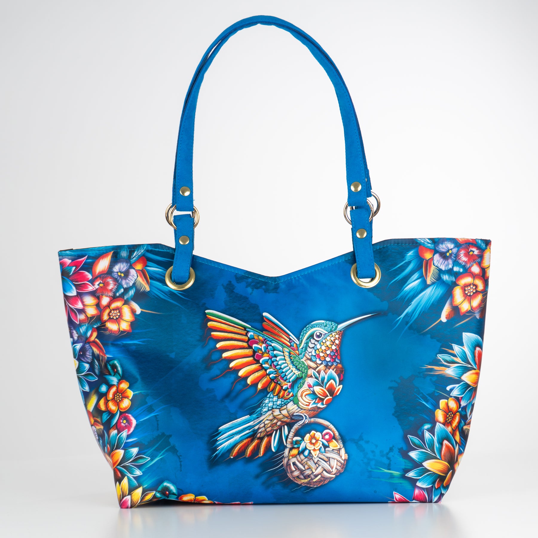 Esta bolsa de tela, parte de nuestra colección IZAHUATL, es perfecta para las mujeres con estilo. Cuenta con asas y aros para facilitar su transporte, además de un hermoso diseño de colibrís y flores. No solo te ayudará a llevar tus pertenencias, sino que también añadirá un toque elegante a cualquier outfit.