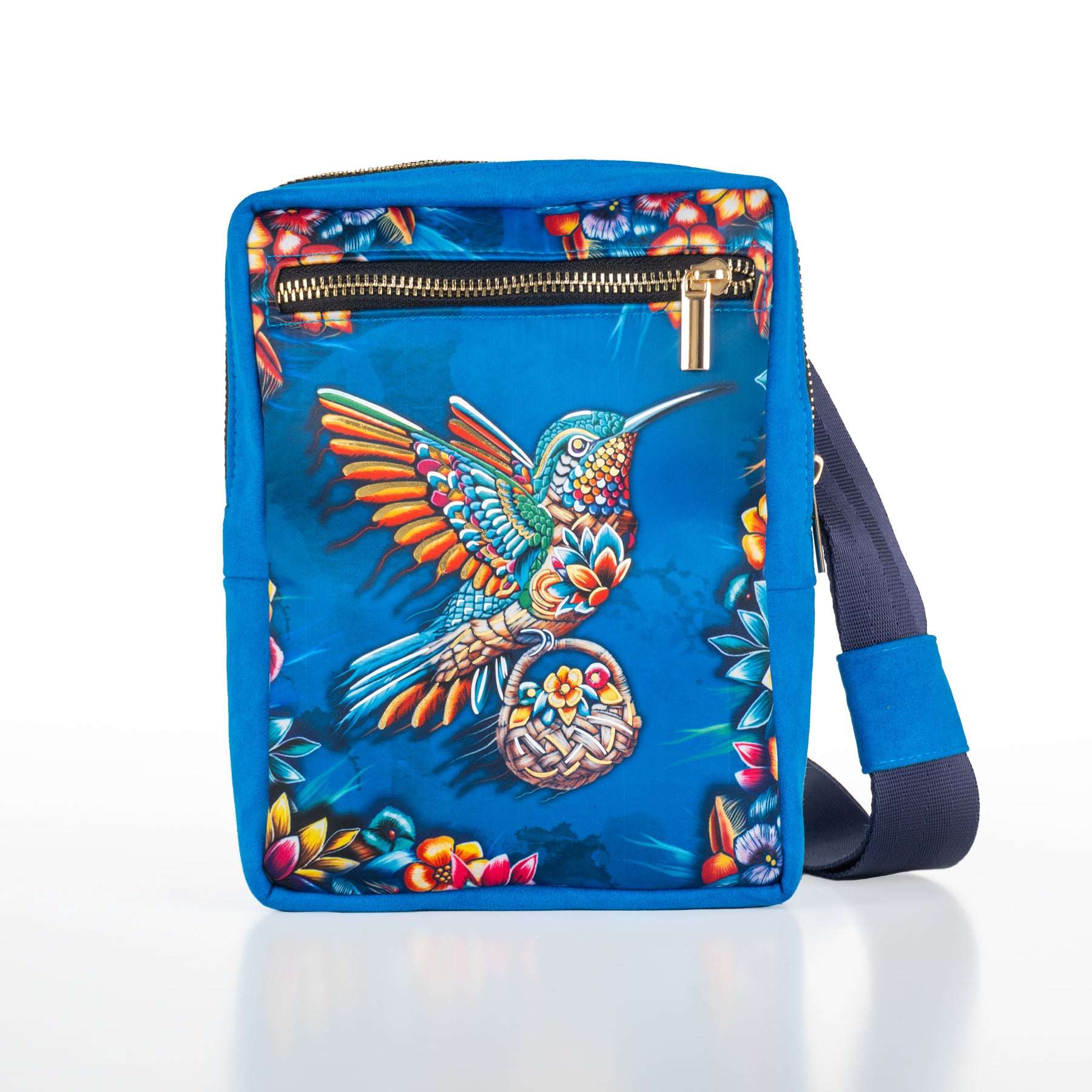 Mochila tipo bandolera, con correa de de tela, inspirada en el colibrí y la primavera.