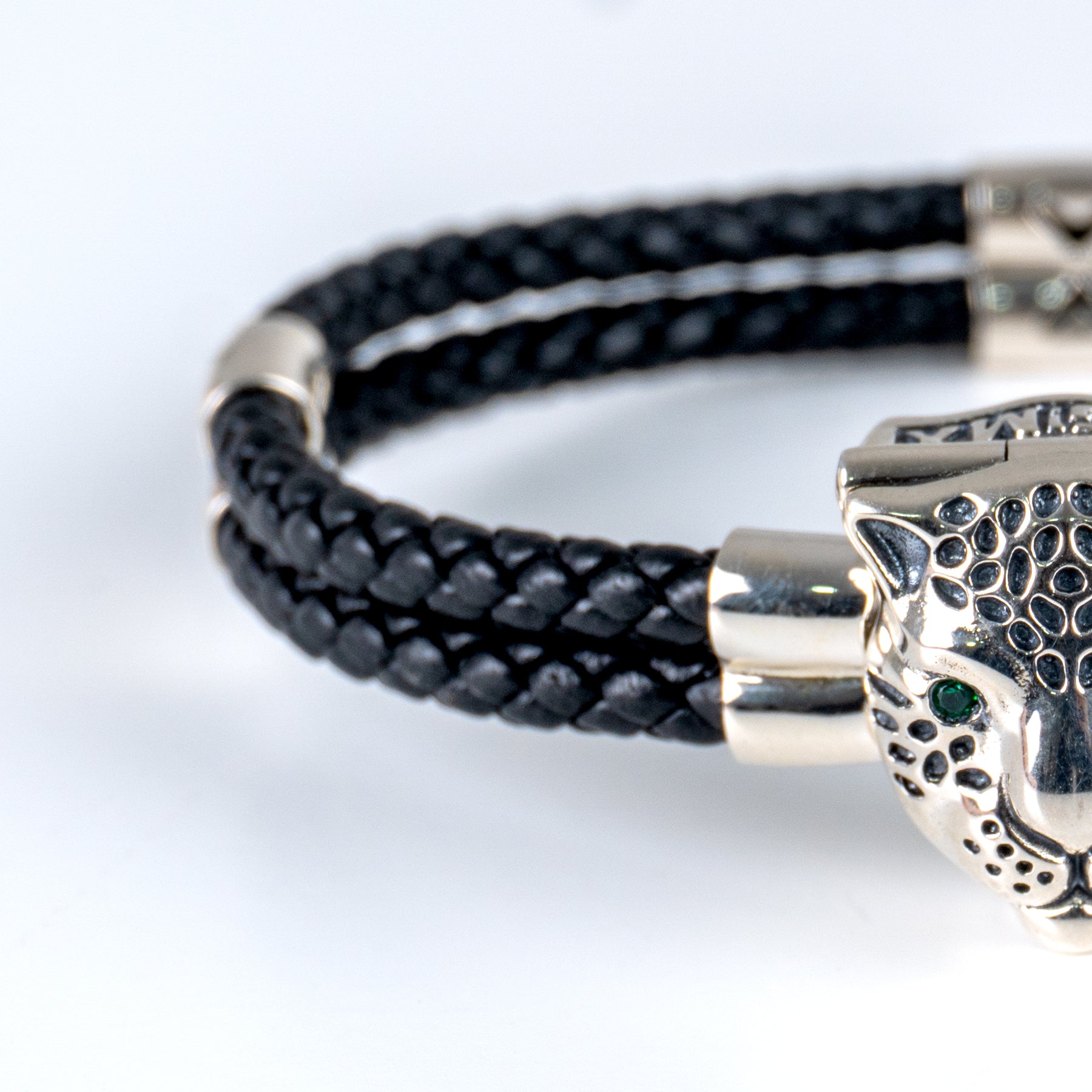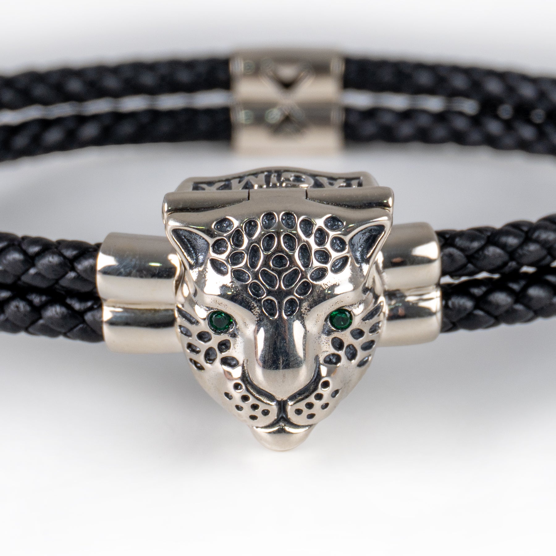 Brazalete de piel trenzada color negro con dije de plata en forma de Jaguar
