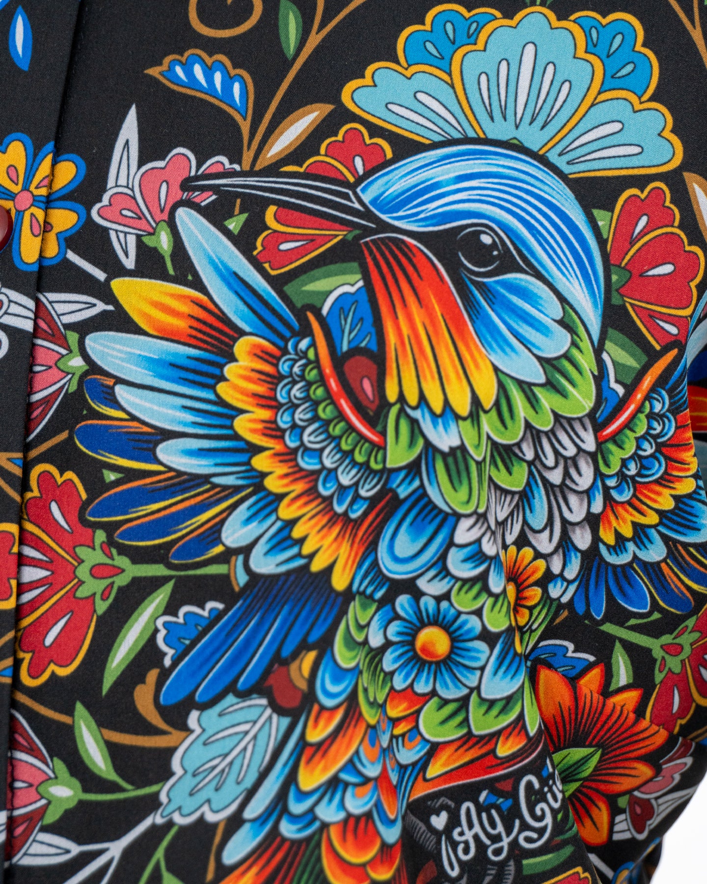 El diseño se inspira en los bordados huicholes y tenangos, fusionando patrones florales simétricos con un vibrante colibrí que parece cobrar vida entre las flores.