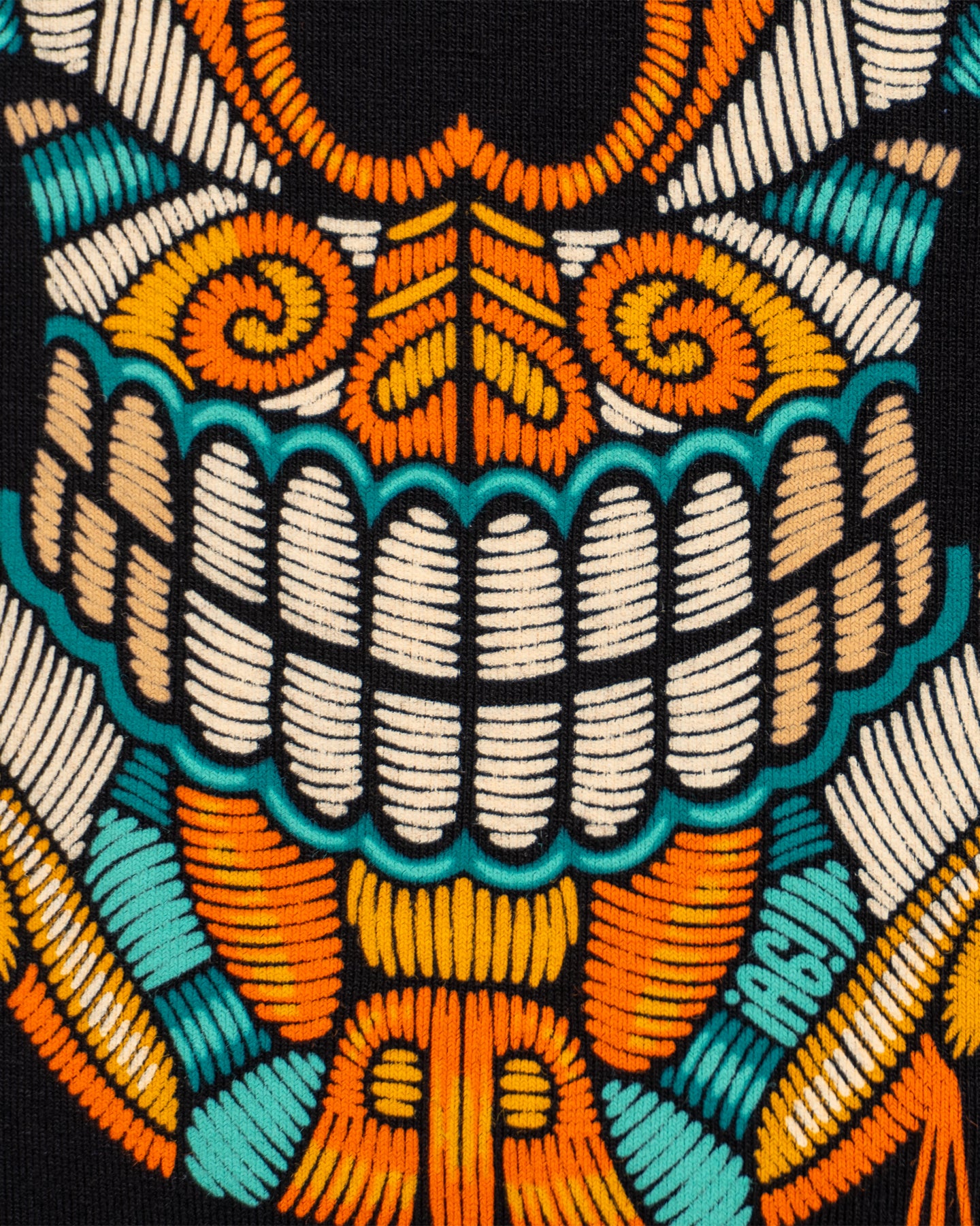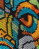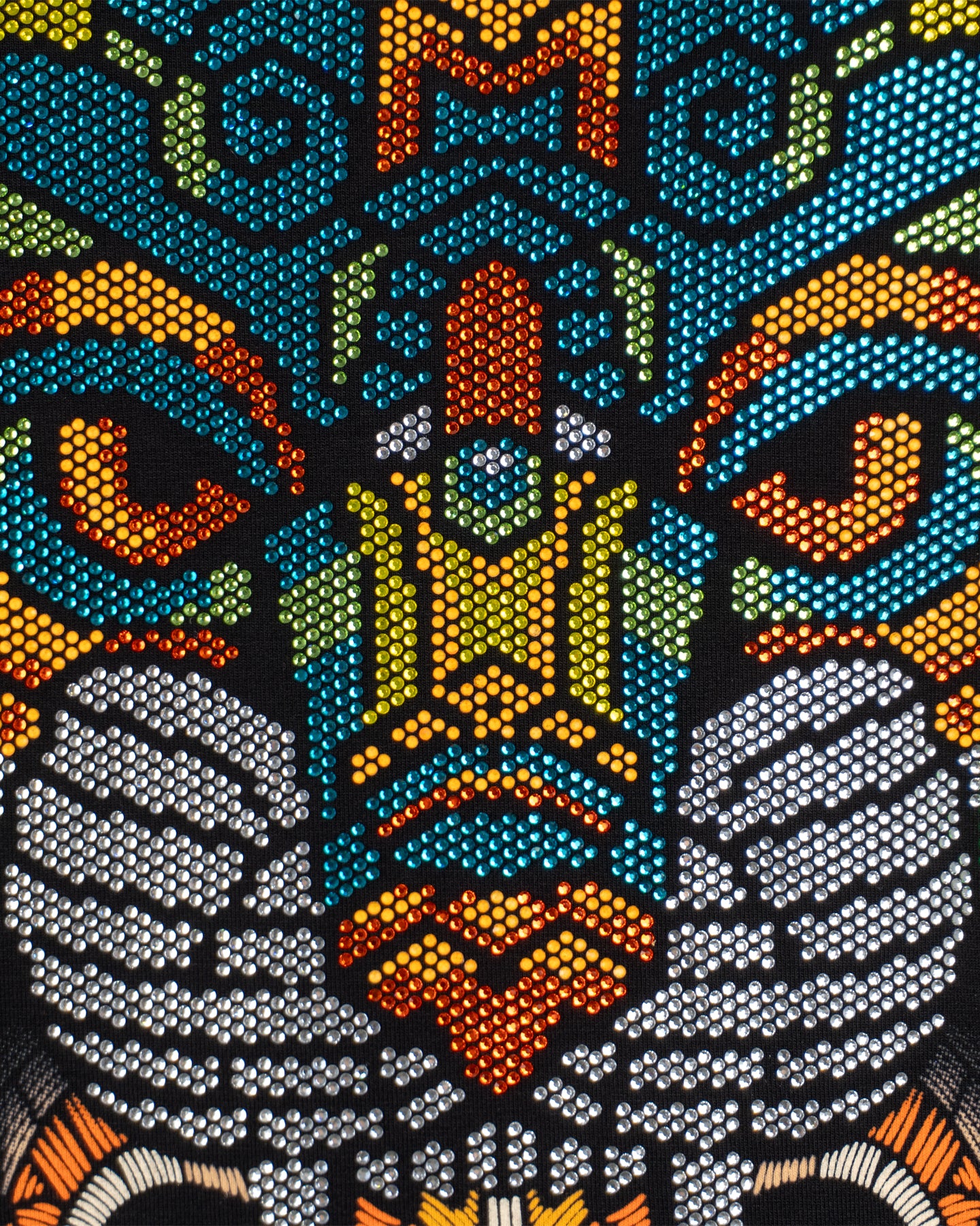 La inspiración de este diseño es el guerrero jaguar, figura emblemática que representa la fuerza, la valentía y la conexión espiritual con la naturaleza y el cosmos. Era considerado un guerrero de élite, protector del imperio y figura de gran respeto. Al combinarlo con el vitral que es tradicionalmente asociado con templos y espacios de contemplación, utiliza el color y la luz como elementos expresivos fundamentales. Esta técnica permite transformar una imagen en una experiencia visual dinámica.