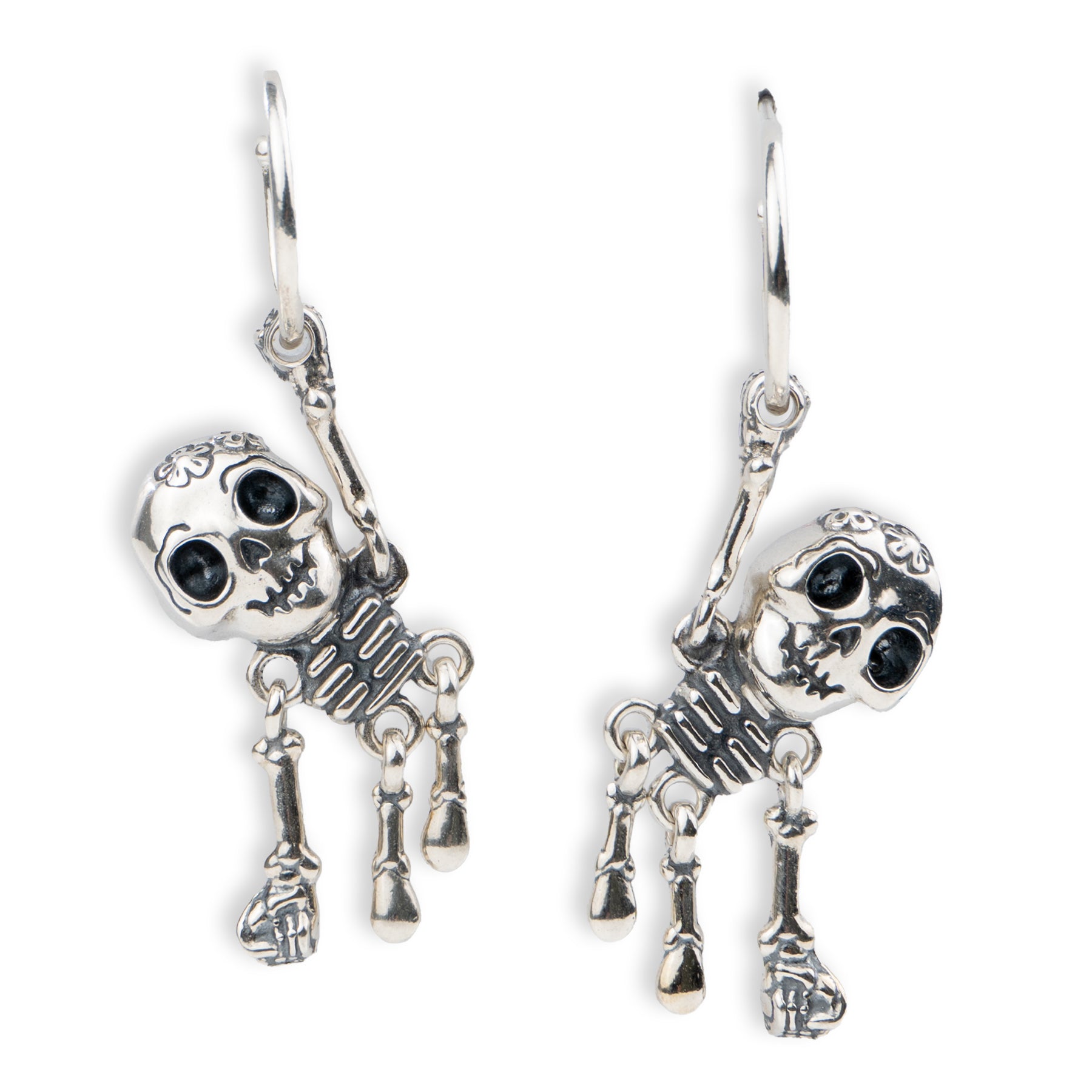 Par de aretes en forma de calavera, simulando que cuelga de tu oreja. De la mano de ¡Ay Güey! esta Colección es presentada por Zanfeld, taller platero con mas de 30 años de experiencia, ubicado en el pueblo mágico de Taxco de Alarcón. Seis generaciones de joyeros han perfeccionado la técnica para obtener joyas de plata de la más alta calidad, sin perder la tradición artesanal. Apasionados por crear y elaborar piezas únicas que reflejen el esmero y cuidado en cada pieza que nace de sus expertas manos. Incluye caja de madera grabada.