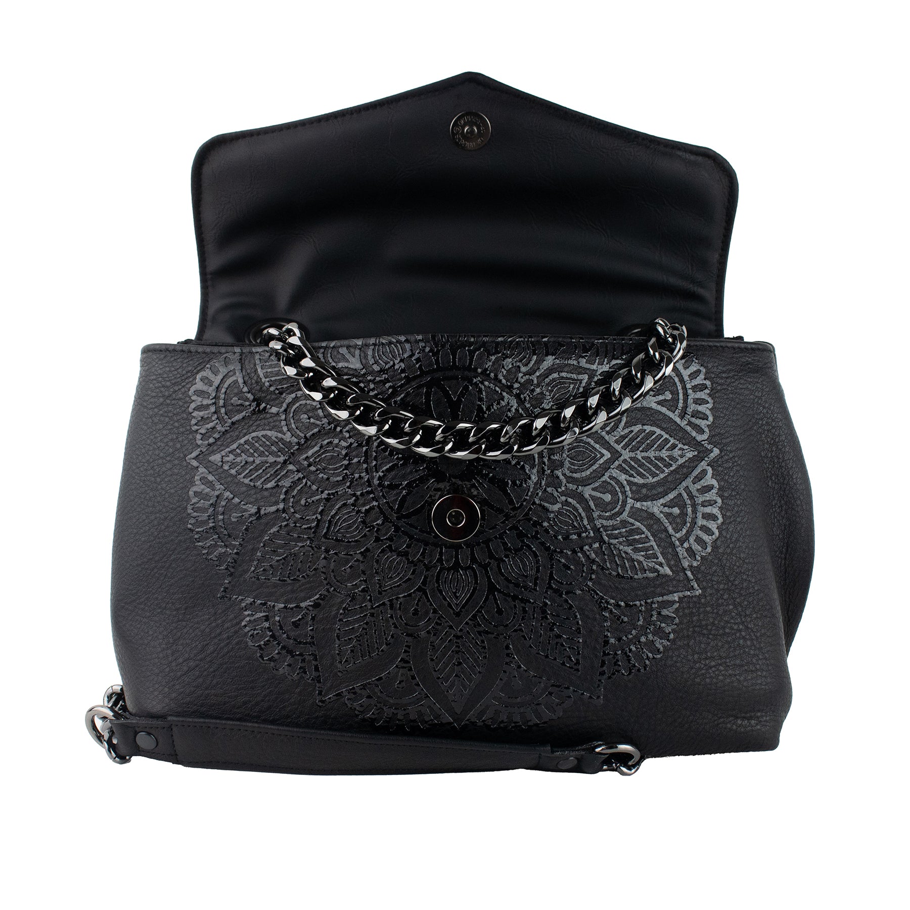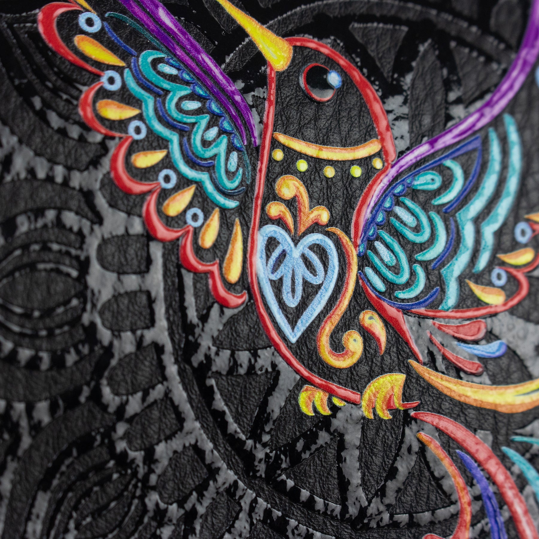 Bolsa de dama, con correa de cadena, inspirada en el colibrí, animal que de acuerdo a la cultura azteca son los mensajeros de buenos deseos. Resaltan sobre la bolsa un dibujo de mandala que aporta elegancia y misticismo.