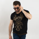 Playera de caballero, cuello redondo, con diseño de ajolote de estoperoles dorados. esta playera es perfecta para unir a la familia en un look único y elegante. Costuras color oro que le dan un toque aún más especial.