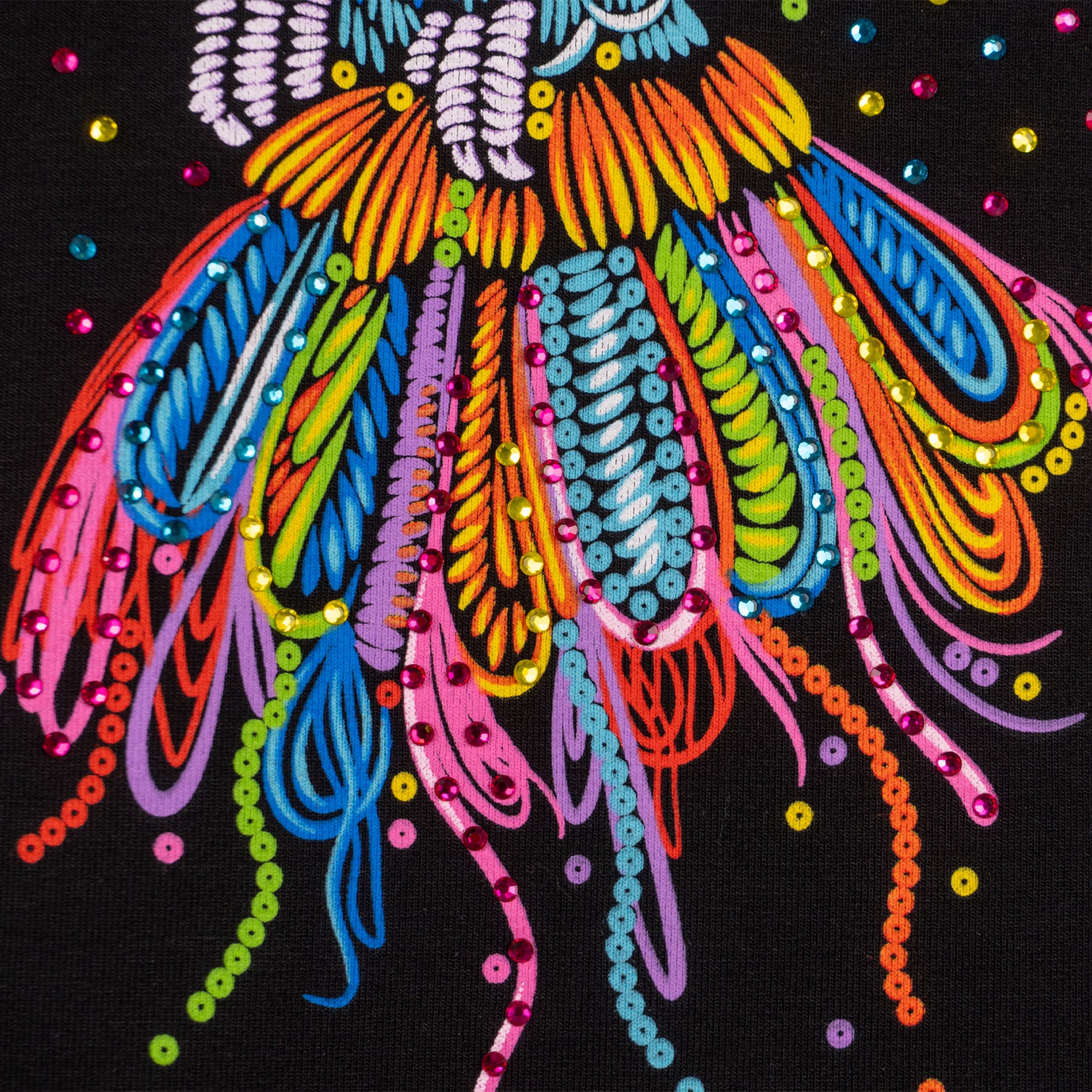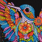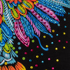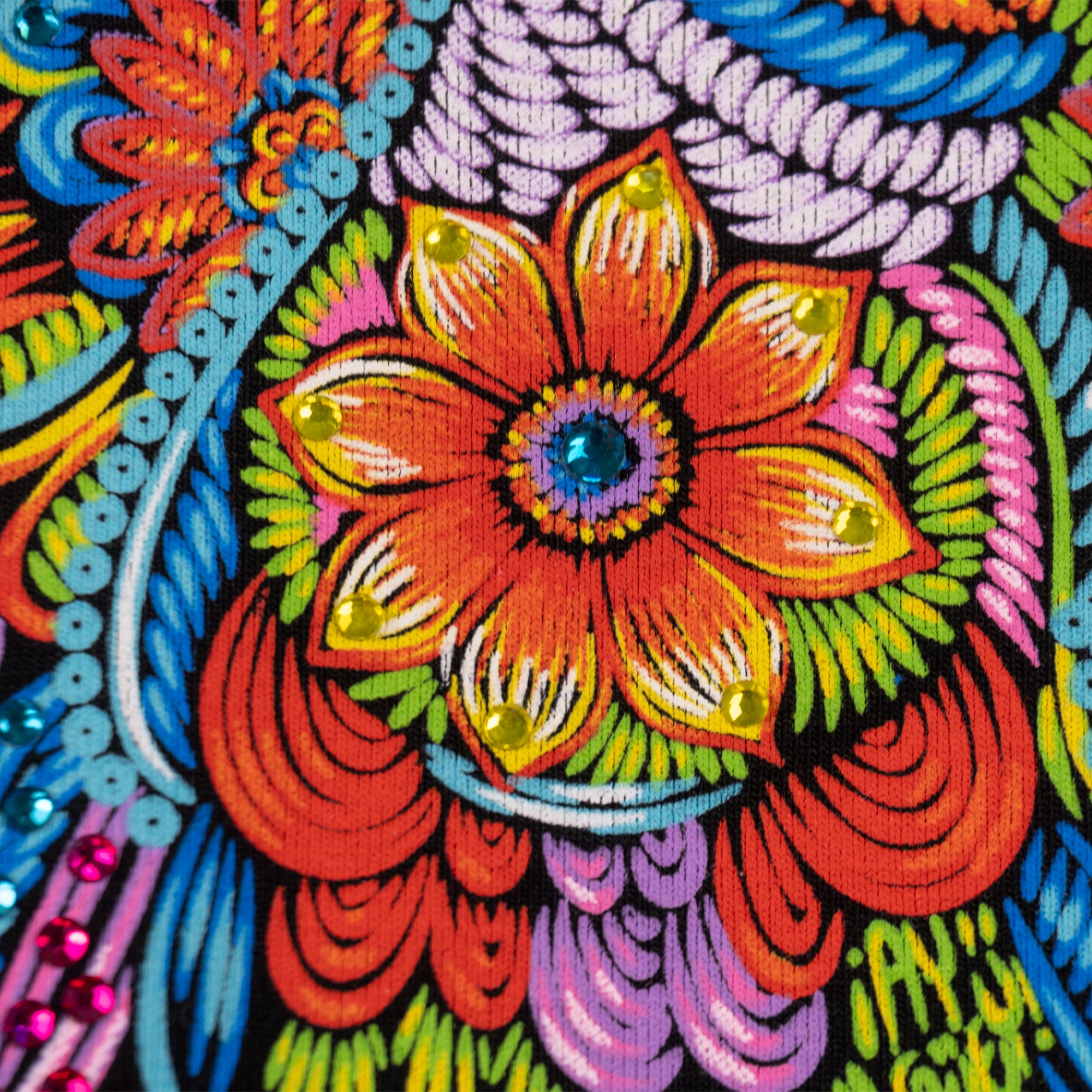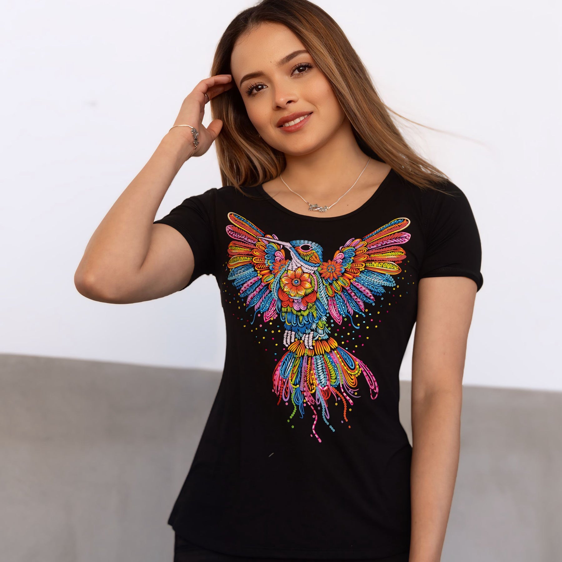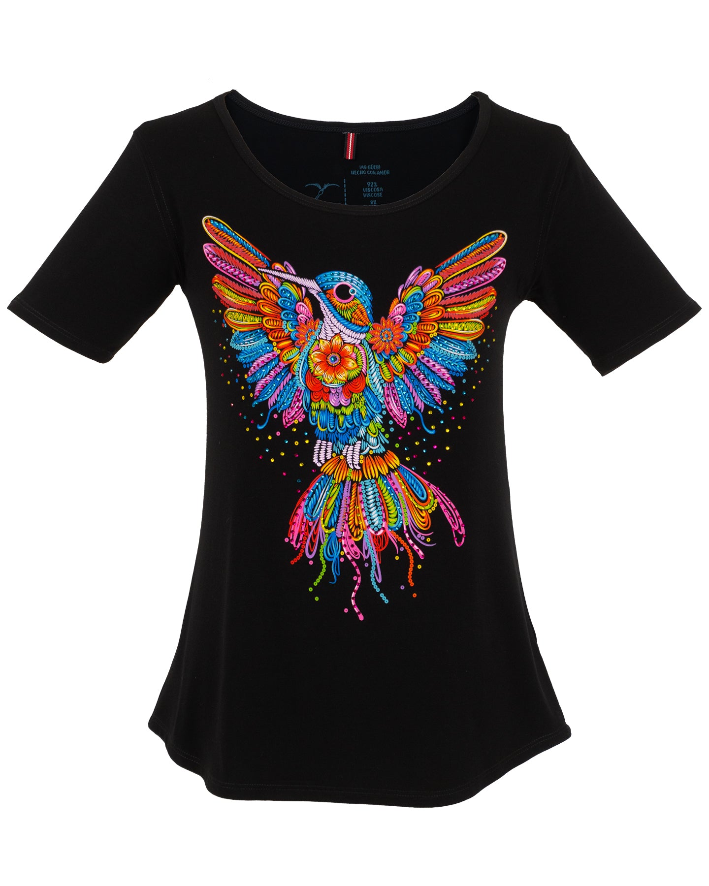 ¡Aletea con estilo con HUITZIL! Este blusón curvo de dama cuenta con un vibrante estampado de colibrí y brillantes aplicaciones de pedrería. ¡Destaca con nuestro diseño único y colorido!