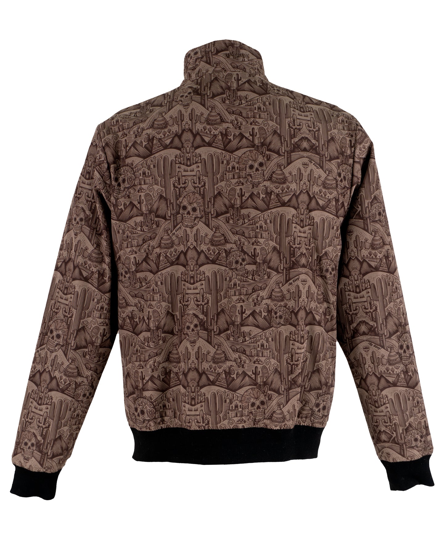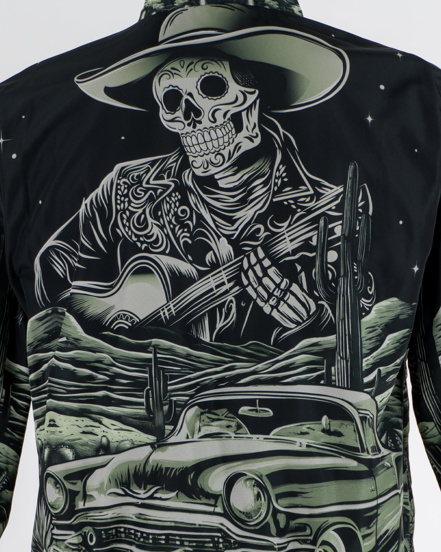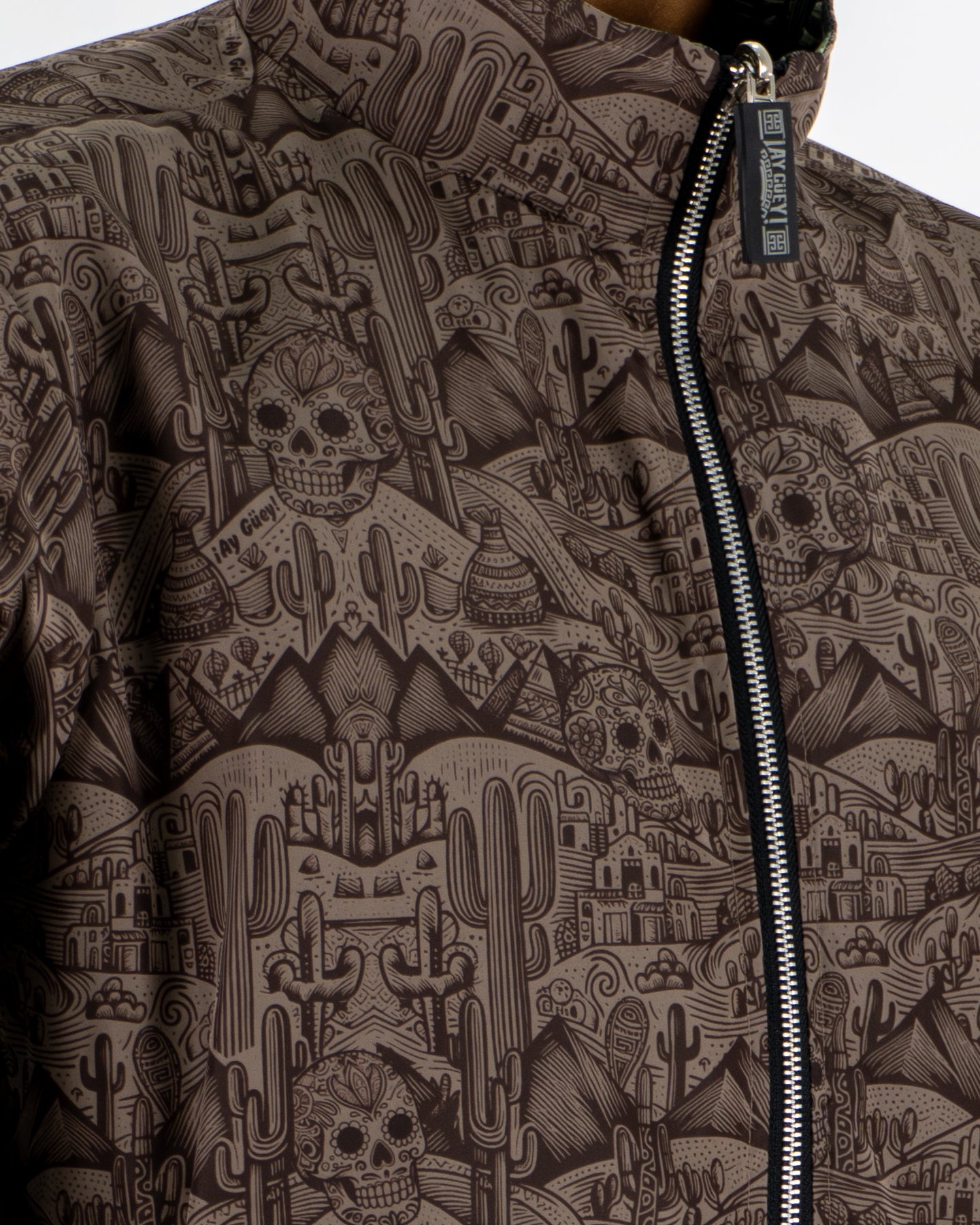 Por un lado, tiene un vibrante diseño impreso de un mariachi calavera tocando la guitarra, ideal para quienes buscan ropa de diseño mexicano con un toque artístico. Por el otro lado, un sutil estampado en tonos tierra con calaveras, pirámides prehispánicas y cactus ofrece un estilo más versátil.