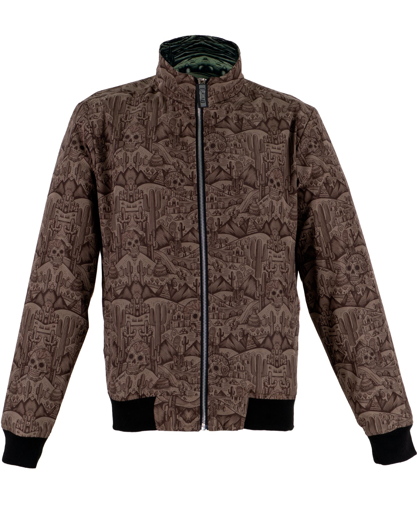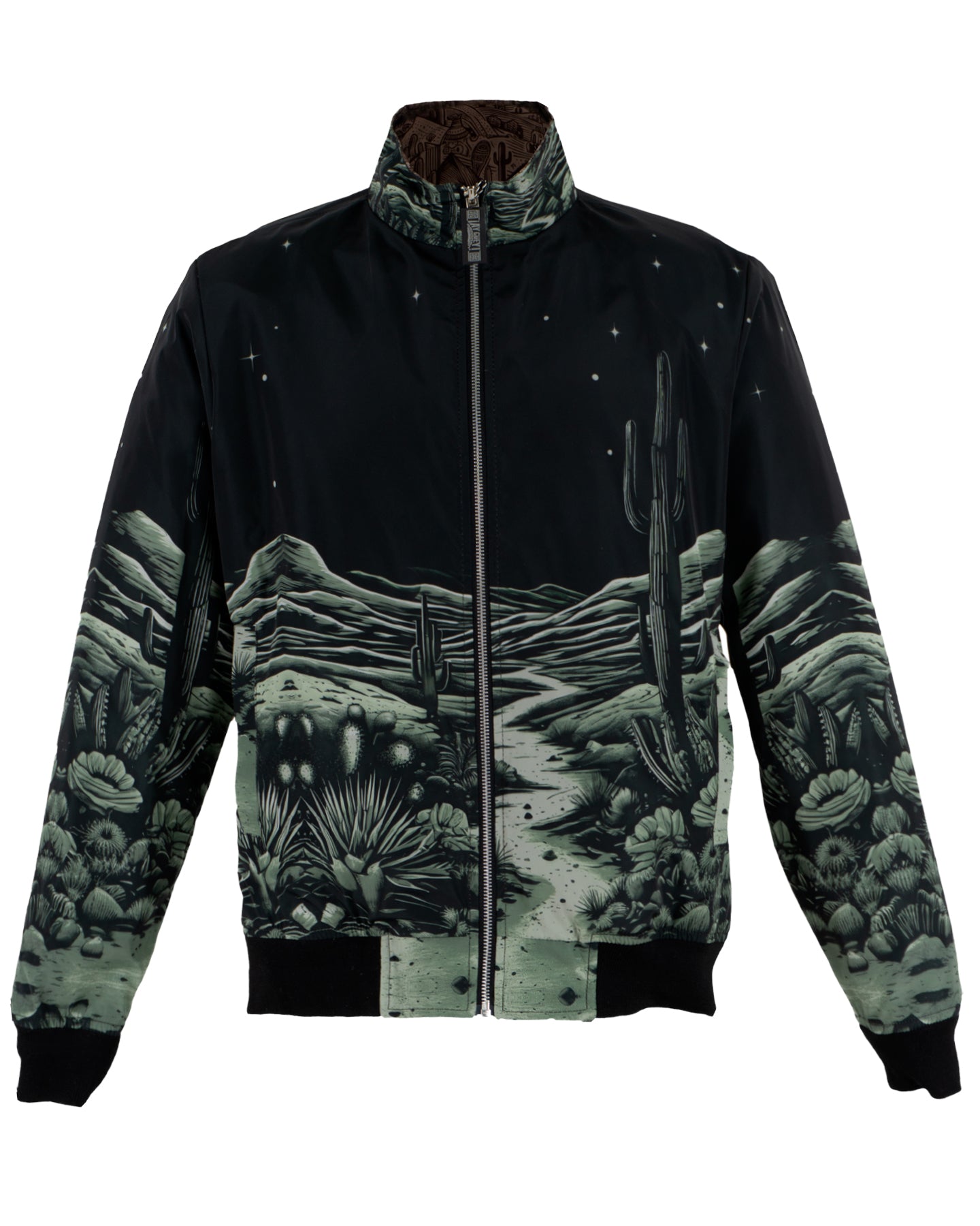 La chamarra Bomber "La Noche" es una pieza reversible que cuenta una historia de misterio y música.