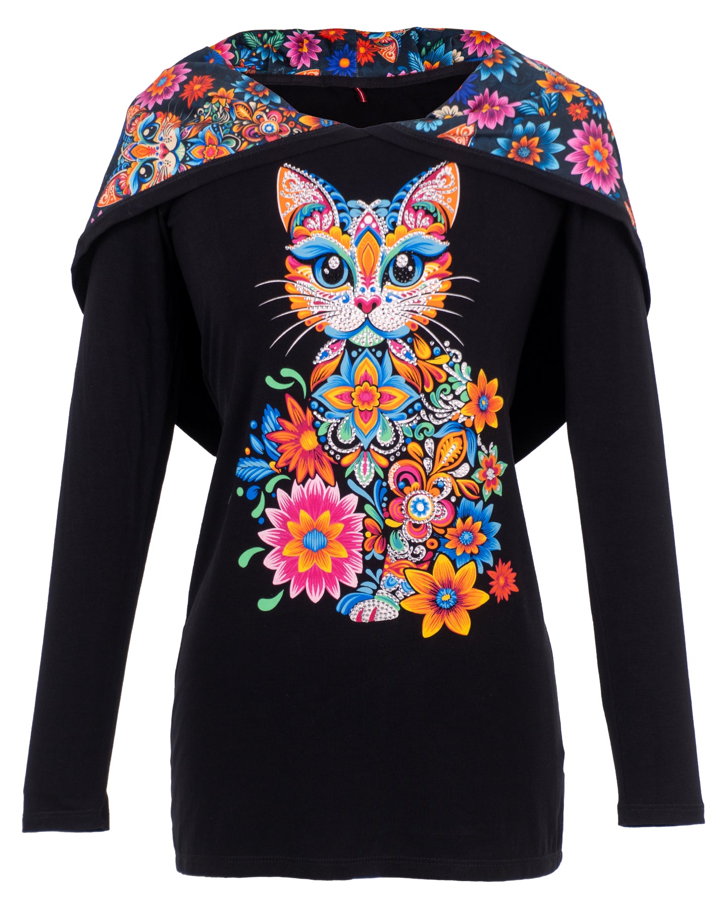Blusón con gorro estampado con aplicación de pedrería para mujer - Modelo GATITO GATITO