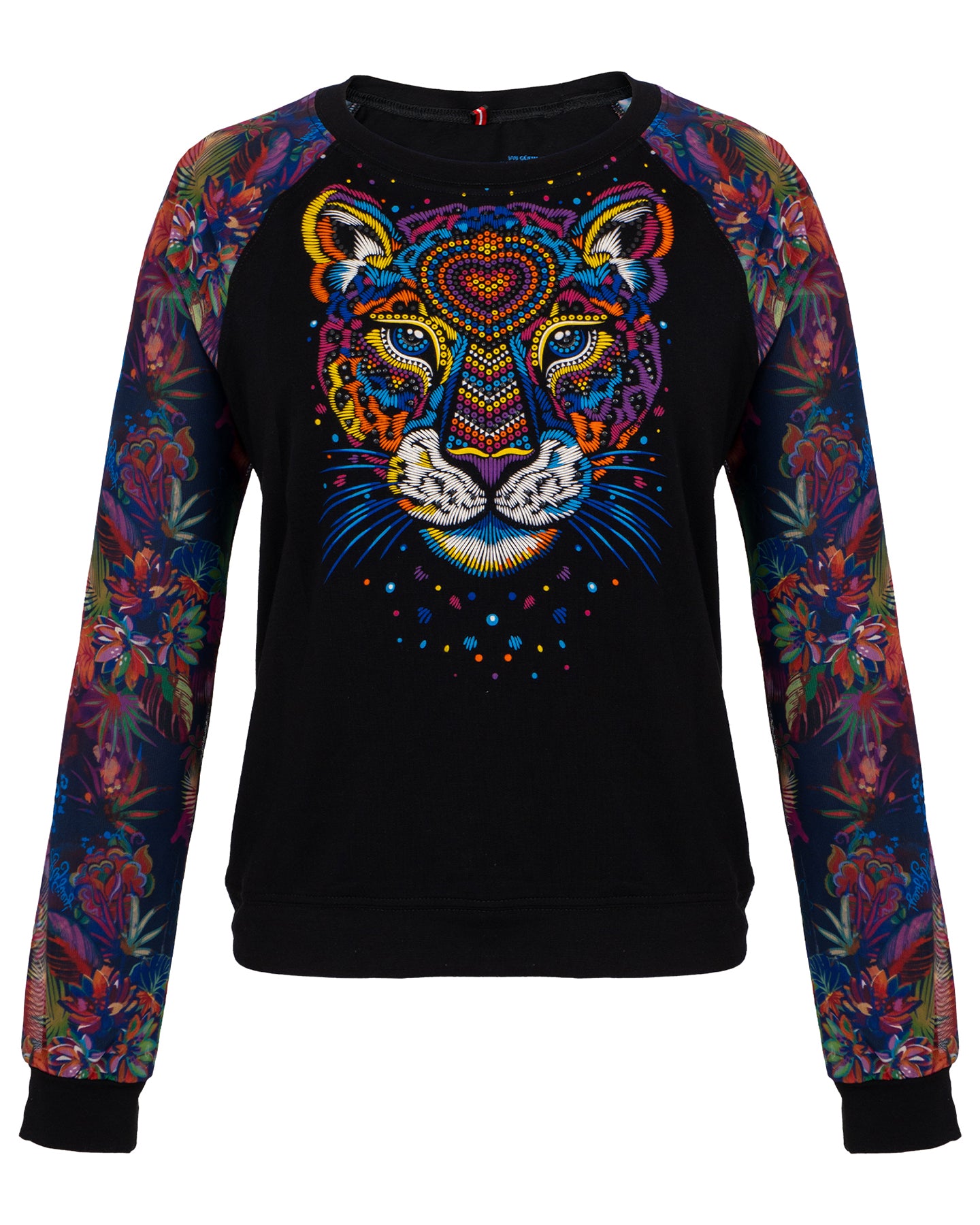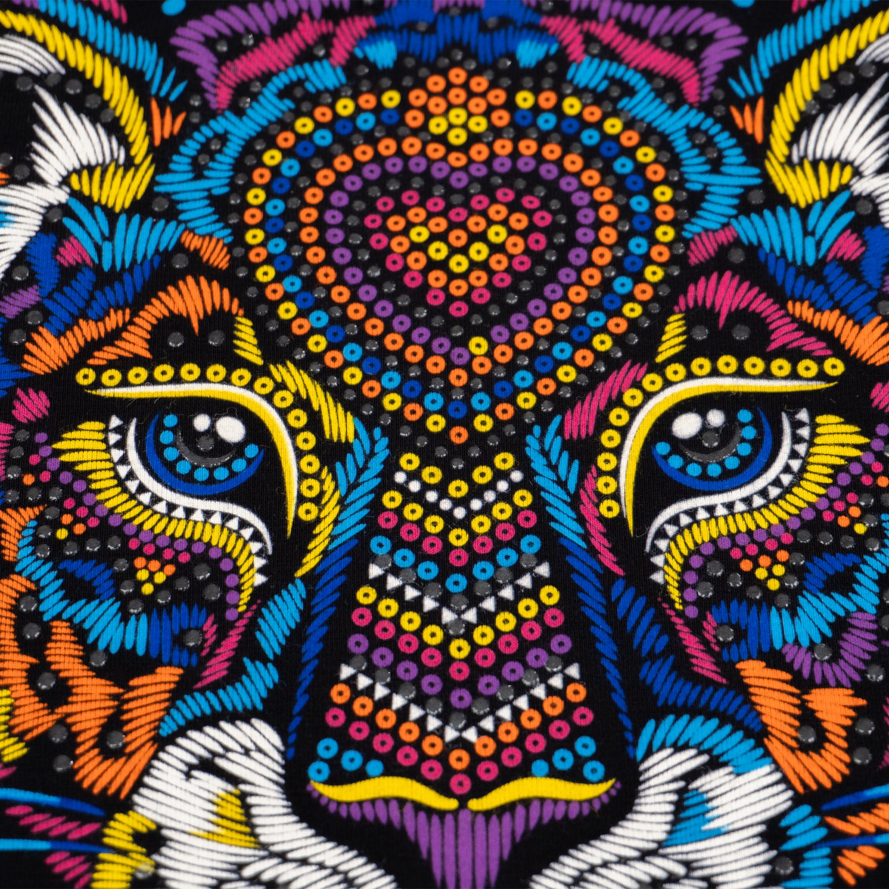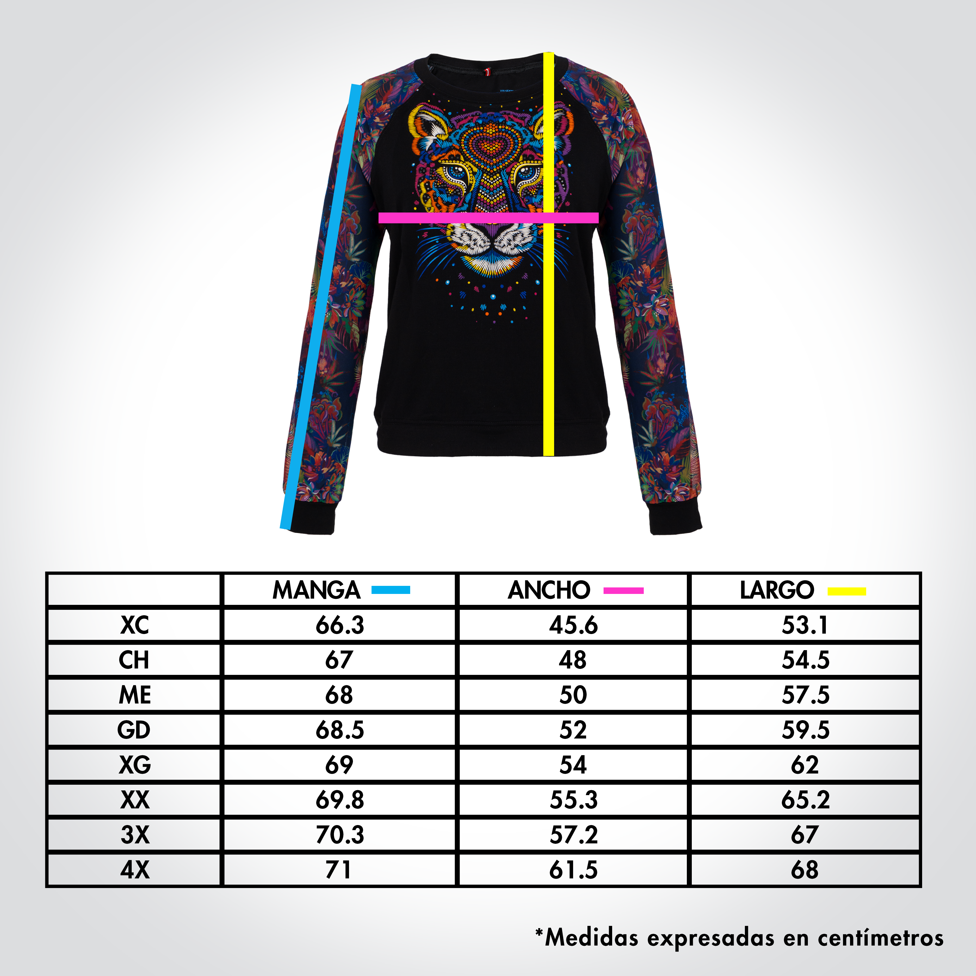 El jaguar, un felino majestuoso y enigmático, es uno de los tesoros más preciados de la biodiversidad mexicana. Este magnífico felino no solo es el protagonista de la selva, sino también un guardián de nuestras tradiciones y leyendas. En la frente del jaguar esta un corazón con estilo huichol lleno de la vibrante energía. La tela de las mangas esta inspirada en la selva y sus elegantes colores.