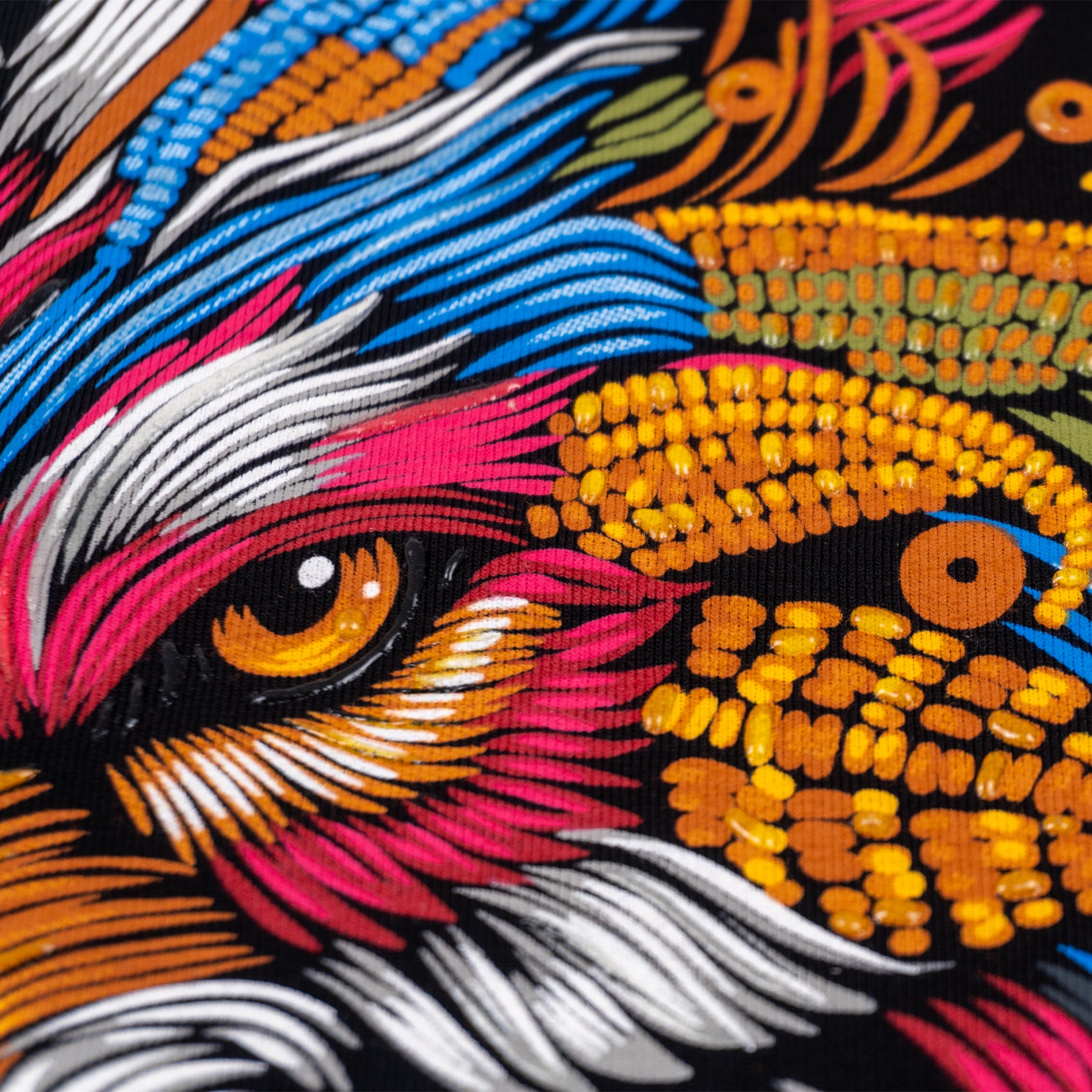 Este diseño es una fusión entre uno de los animales más poderosos de México y el emblemático maíz. Su pelaje está compuesto por tonos terrosos que evocan los paisajes áridos y fértiles de México, desde los ocres de la tierra hasta los dorados del atardecer, así como mazorcas que emergen fantásticamente a su alrededor.