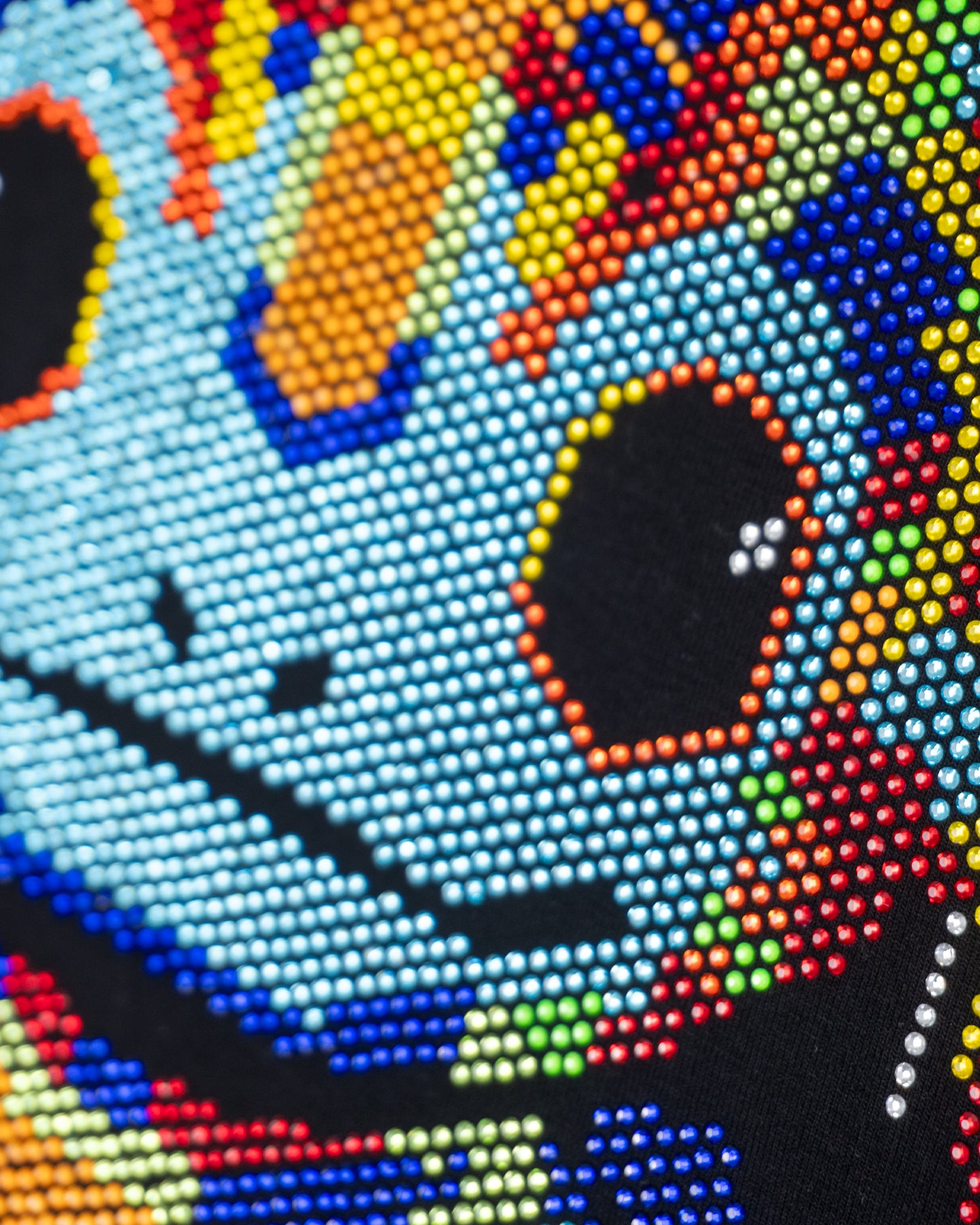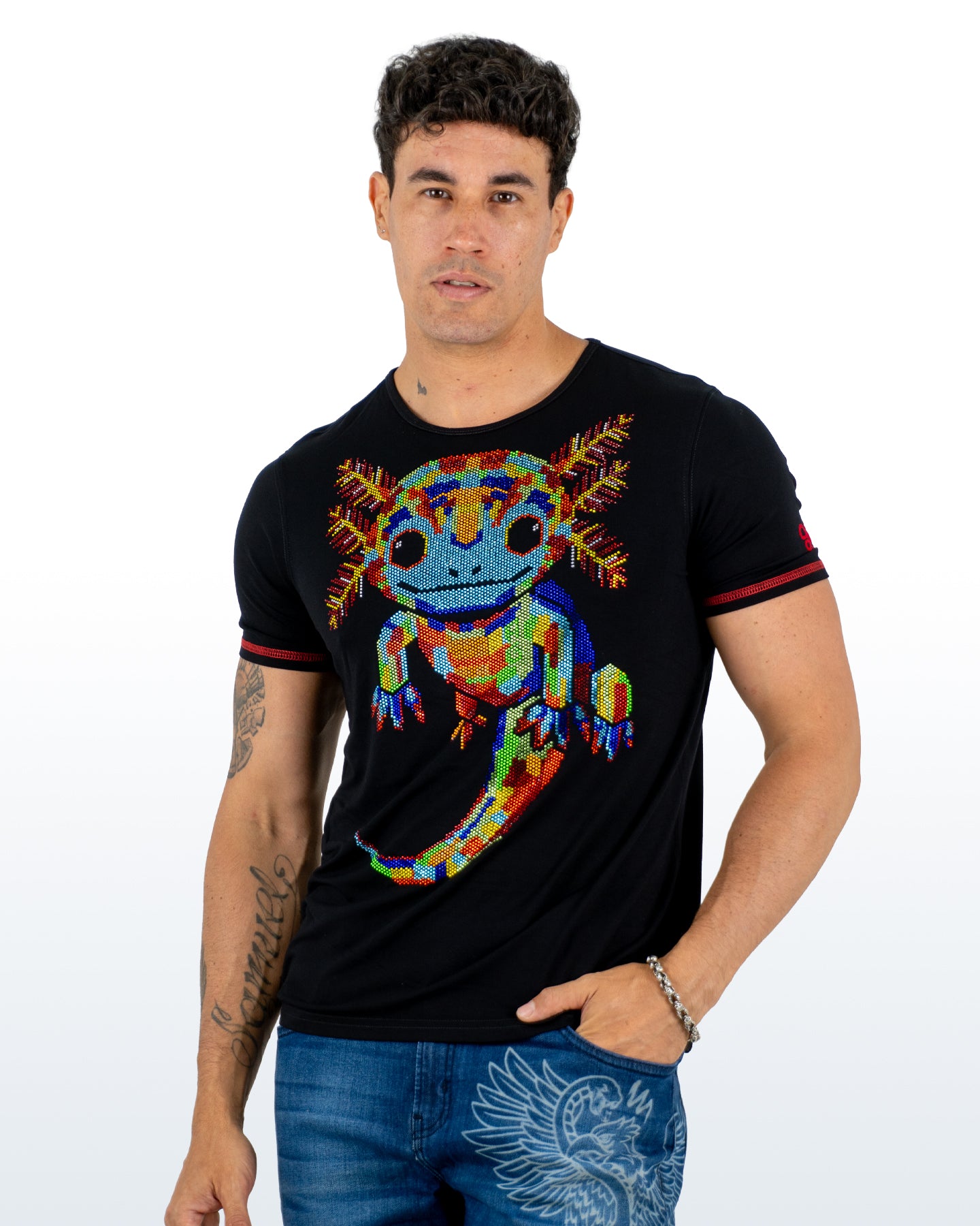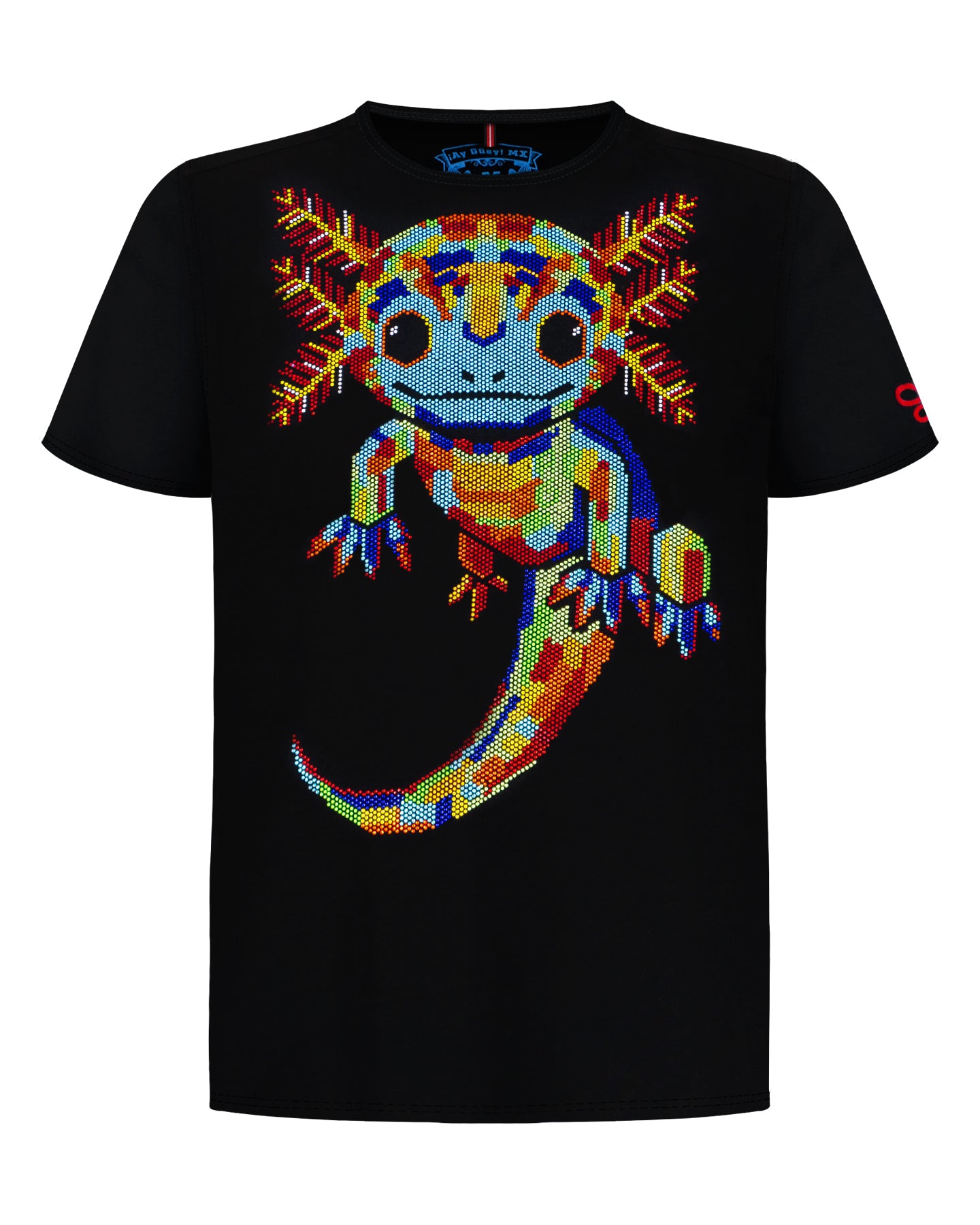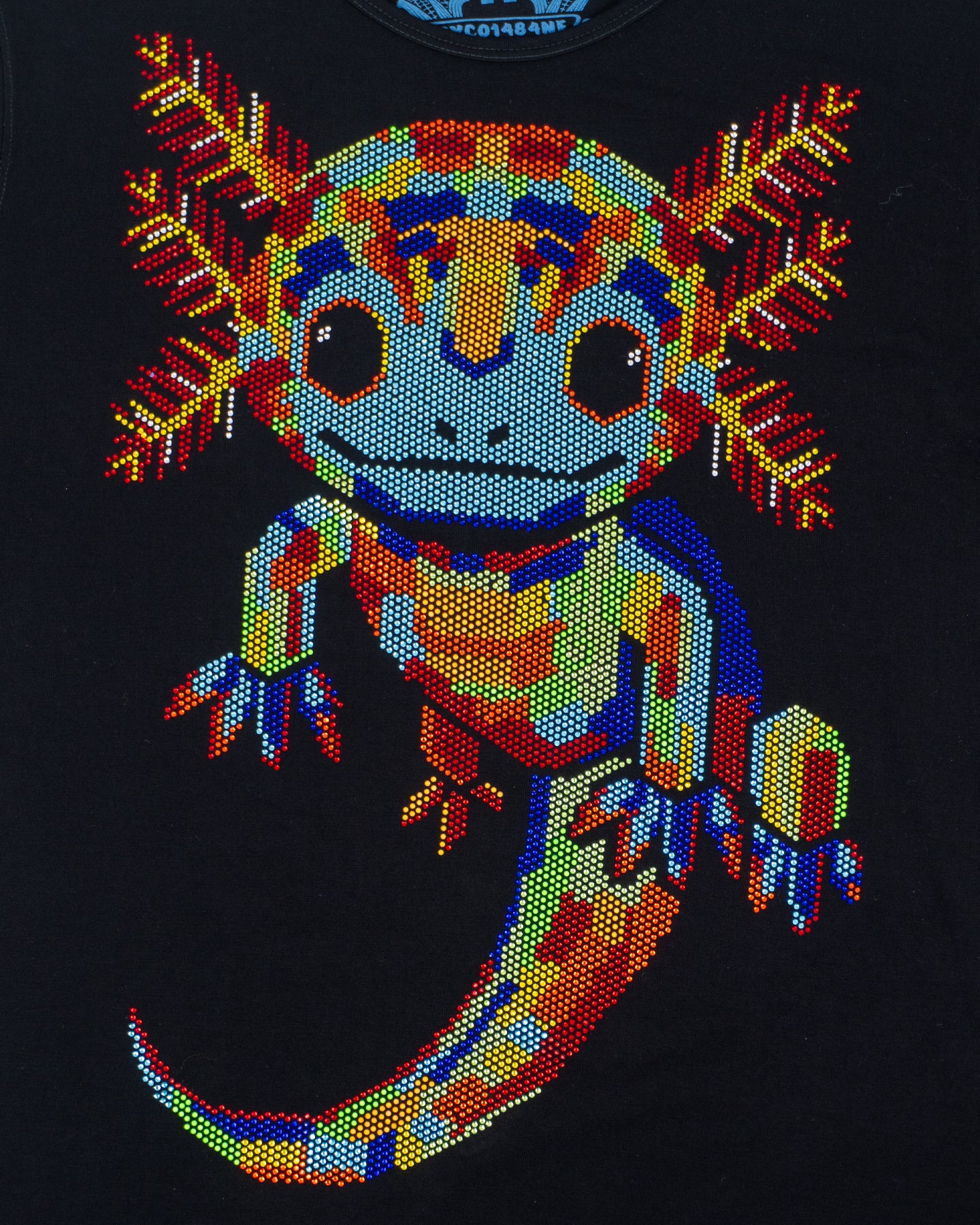 Esta camiseta celebra al ajolote, símbolo de la resiliencia y la magia de México, a través de una reinterpretación artesanal en técnica de pedrería. Cada punto de color evoca a la alegría, fusionando lo ancestral con lo contemporáneo