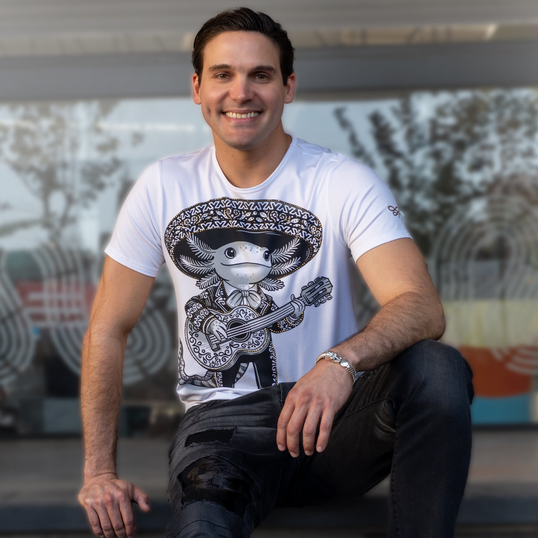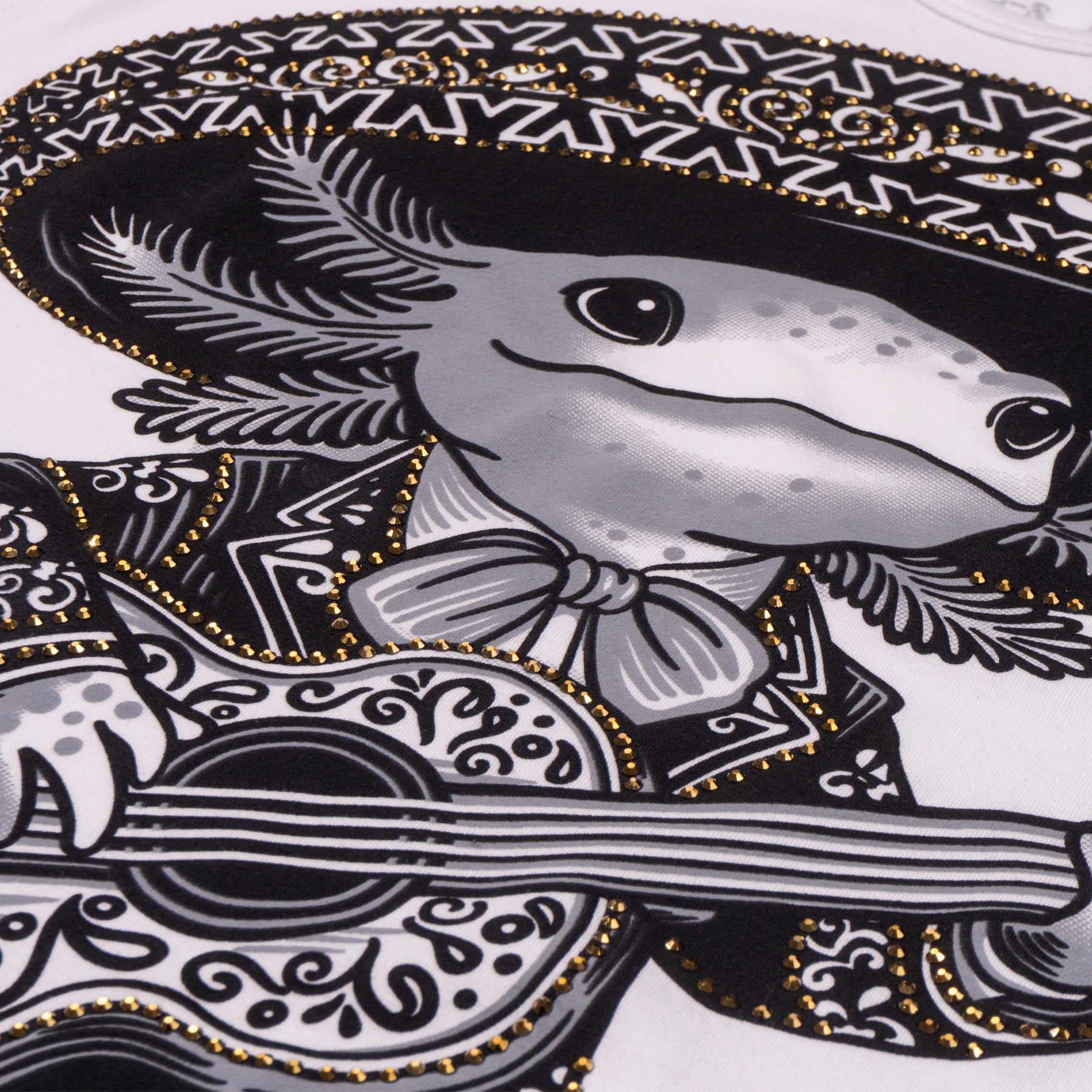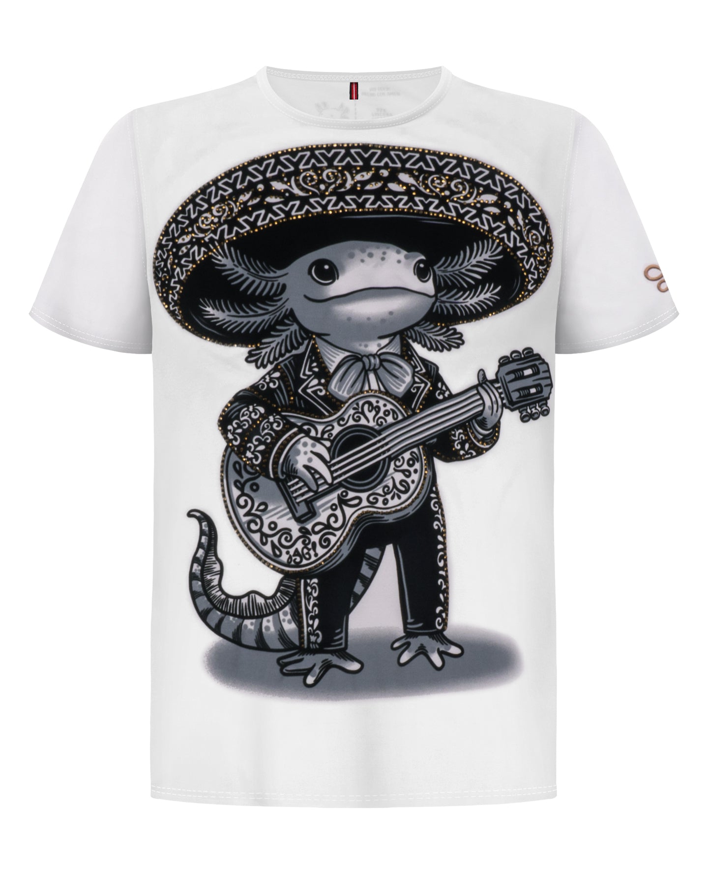 Su expresión alegre y su guitarra en mano transmiten pura vibra festiva, combinando el encanto de este icónico anfibio con el espíritu vibrante de la música tradicional mexicana. Perfecta para quienes aman la cultura, la naturaleza y un toque de diversión en su outfit. ¡Que nunca falte la música ni el ajolote en tu vida!