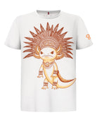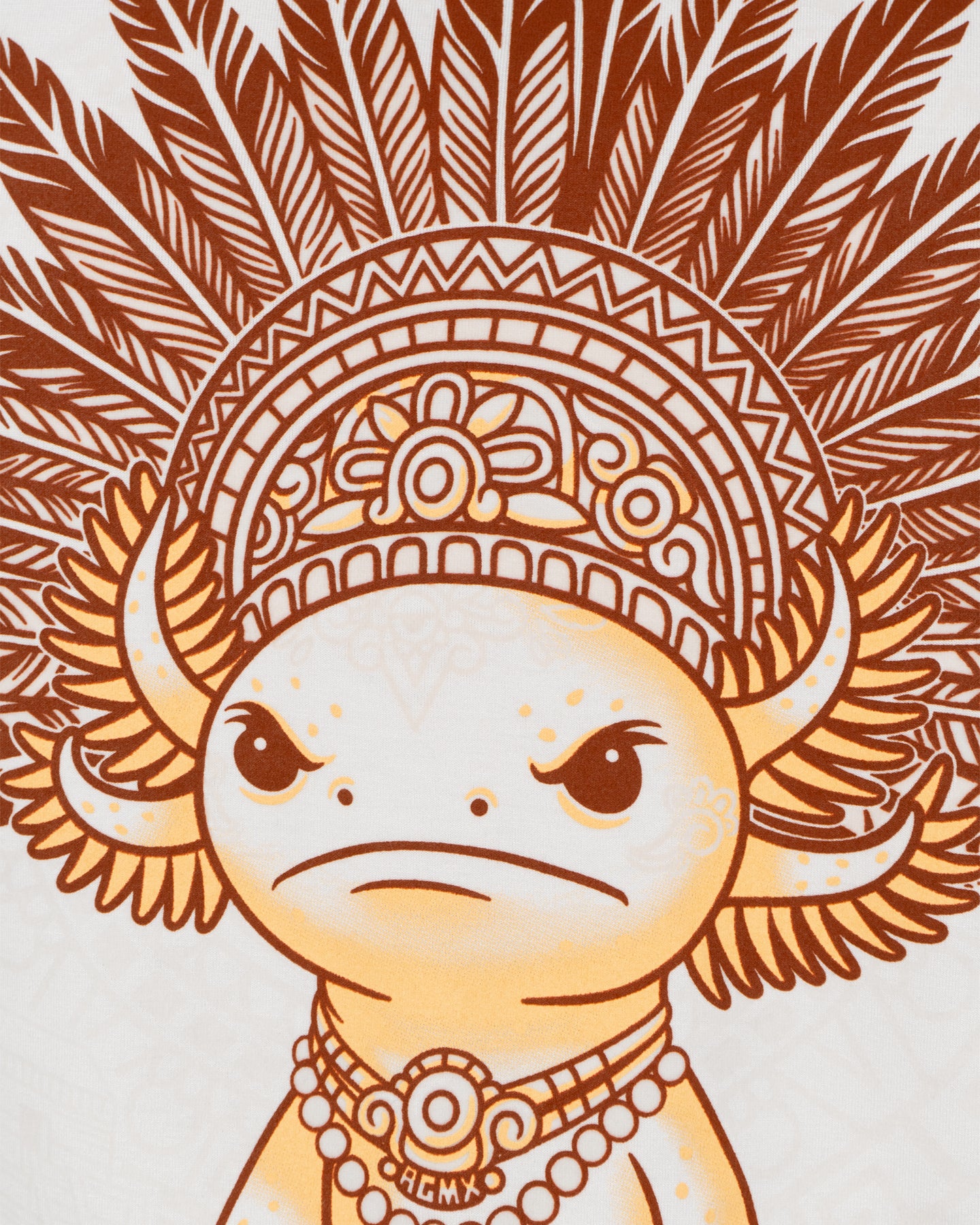 Esta playera nace de la fusión entre la fauna endémica mexicana y la herencia prehispánica. El ajolote, símbolo de regeneración y sabiduría ancestral, es representado aquí con un penacho ceremonial que evoca la grandeza de las culturas mexica y maya. Su gesto tierno y sereno recuerda que el poder no siempre viene del rugido, sino también de la calma.