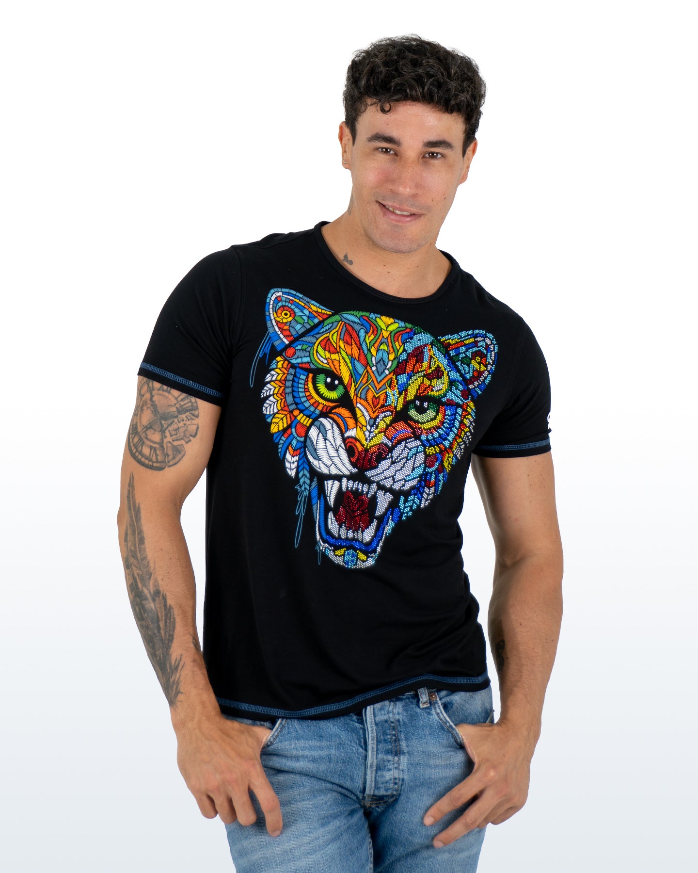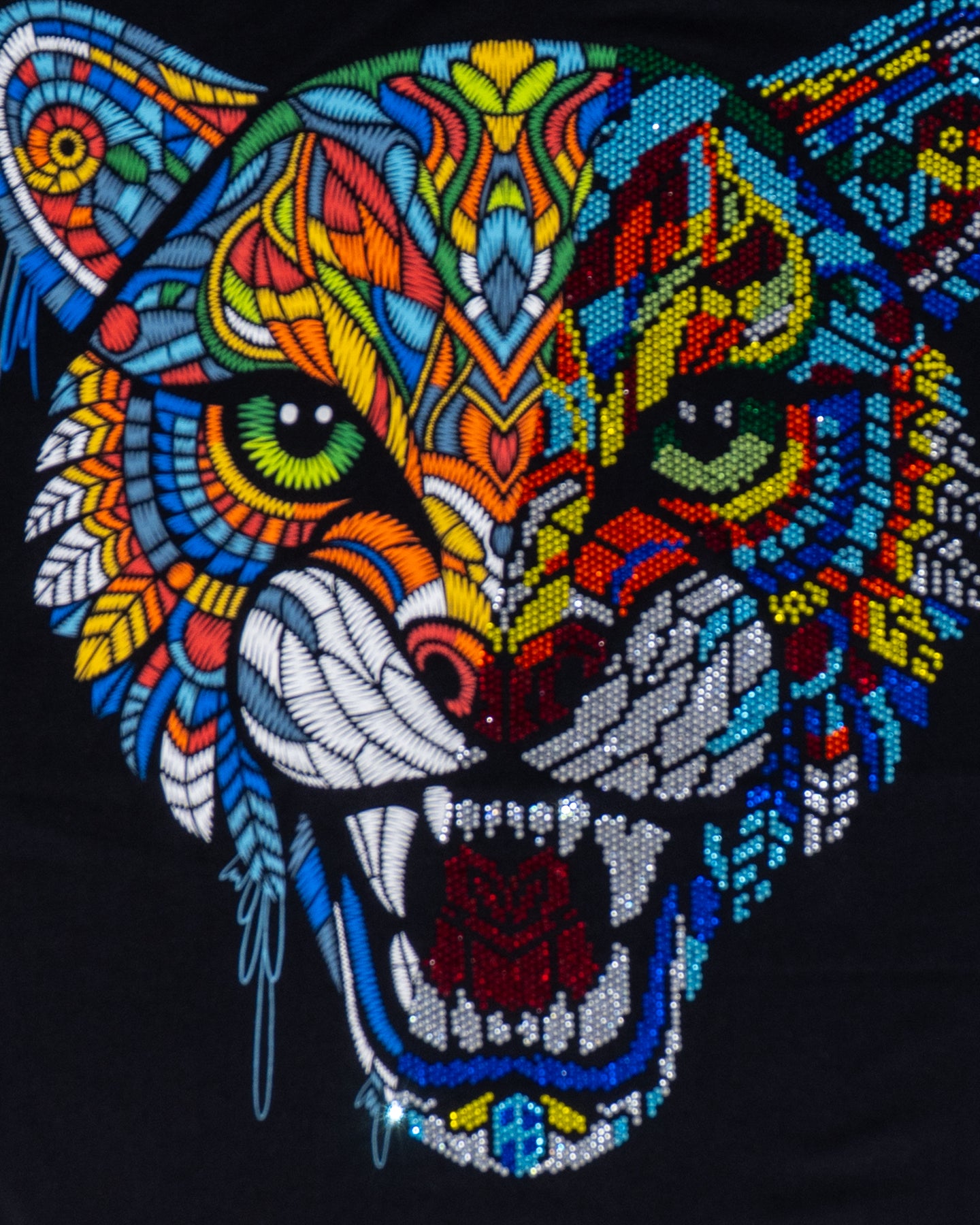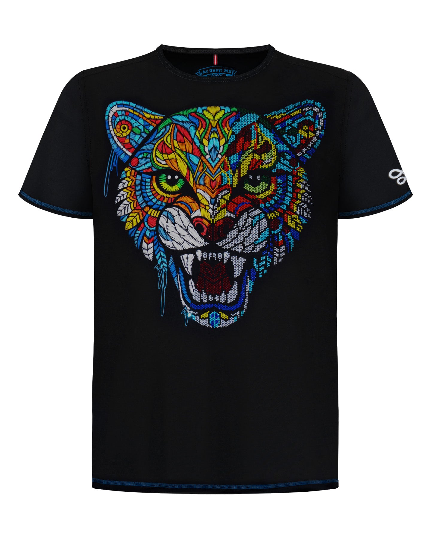 ¡Libera la fuerza que llevas dentro con la playera para caballero "VIDRIERA"! Esta prenda es una obra de arte, donde un majestuoso jaguar cobra vida con un diseño vibrante, evocando la belleza de un vitral. Cada detalle resplandece con pedrería que atrapa la luz, otorgándole un toque de distinción y elegancia. No es una playera común, es una declaración de estilo para el hombre que busca destacar con una pieza única y excepcional. ¡Viste esta joya y haz que tu presencia sea inolvidable!