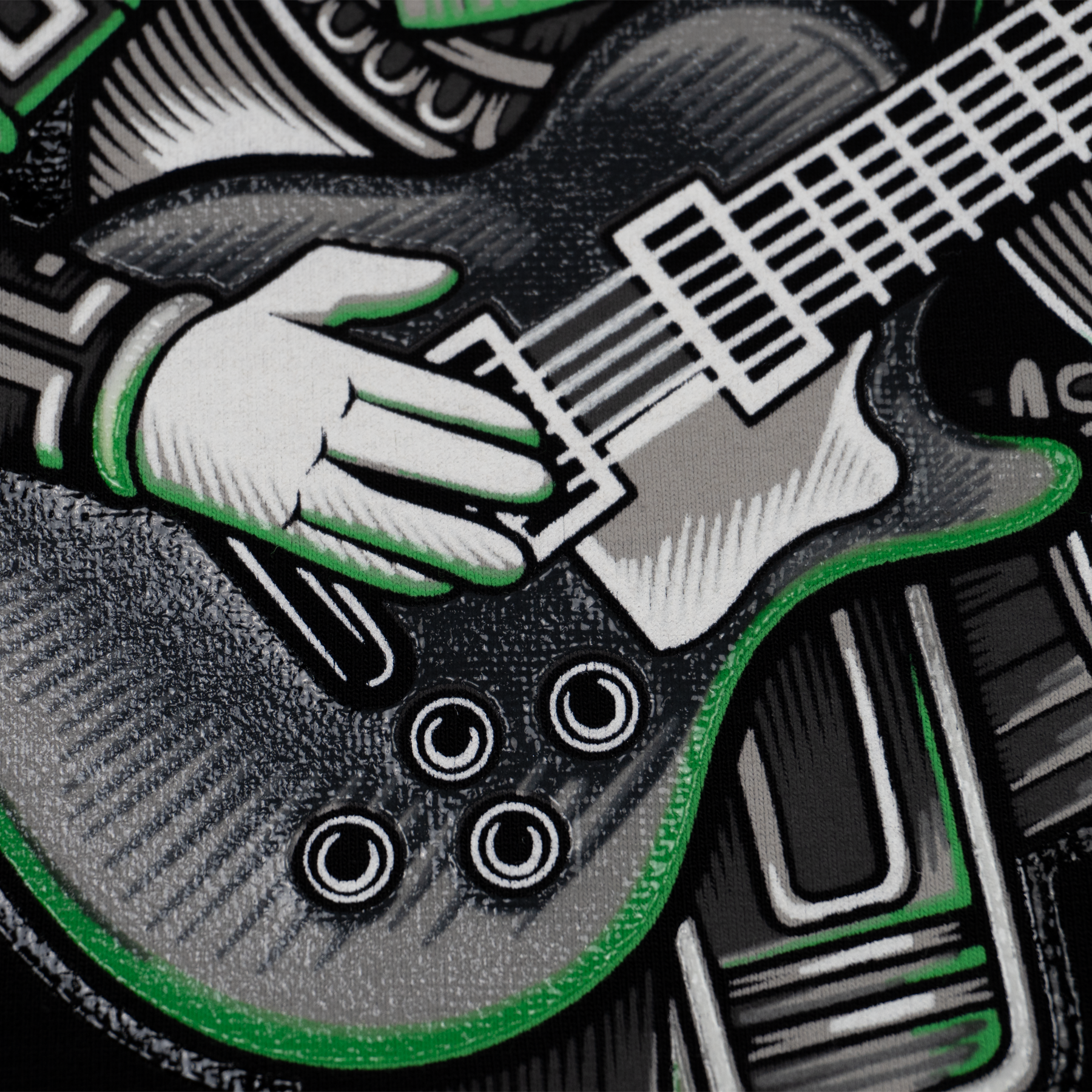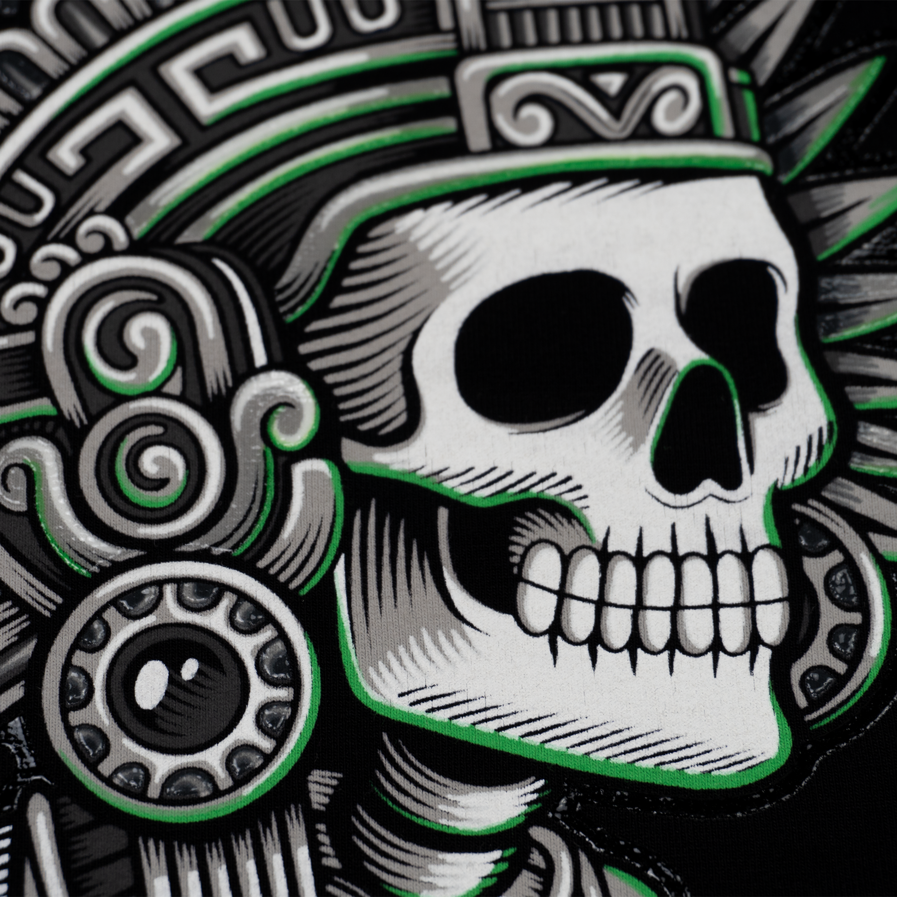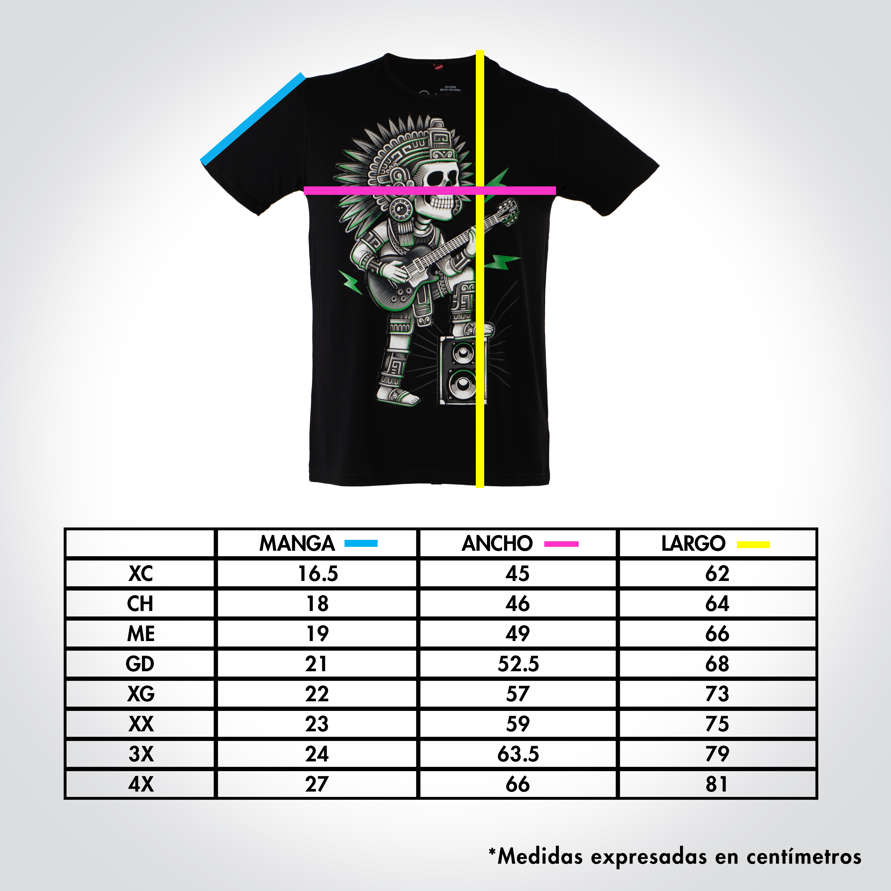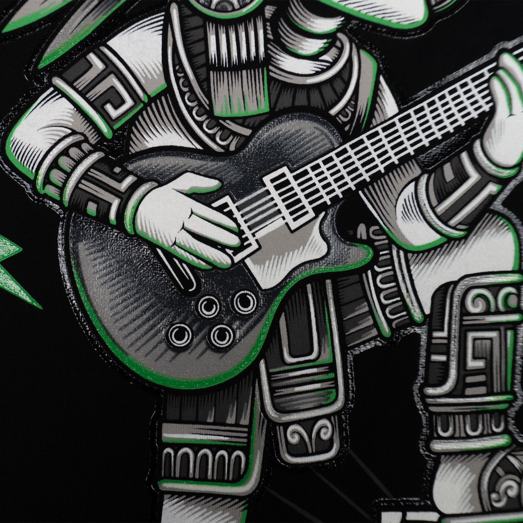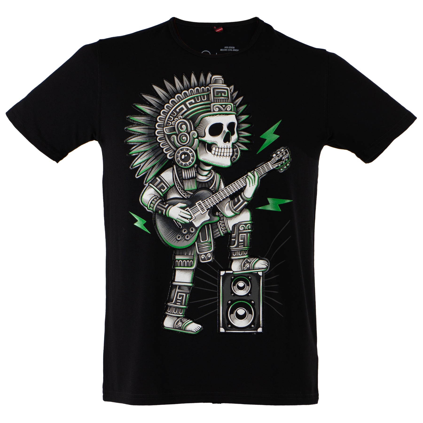 Playera en color negro para adulto, el diseño es una reinterpretación de los códices mayas modernizados mezclándolos con temas mas contemporáneos, en este caso esta combinada con la cultura del rock.