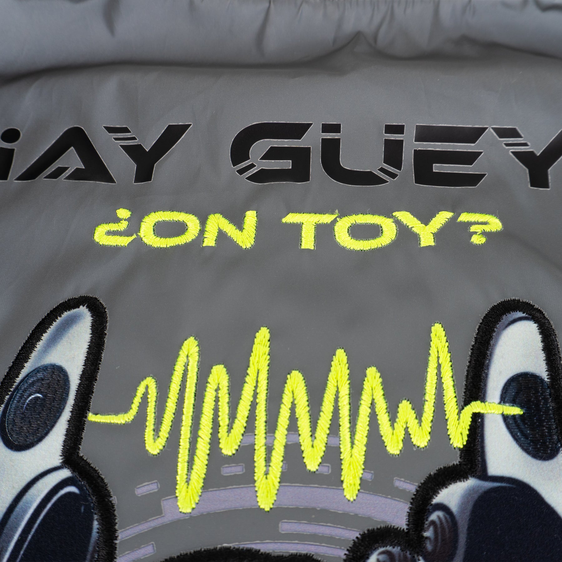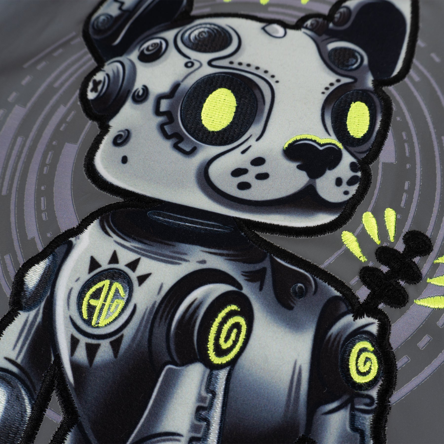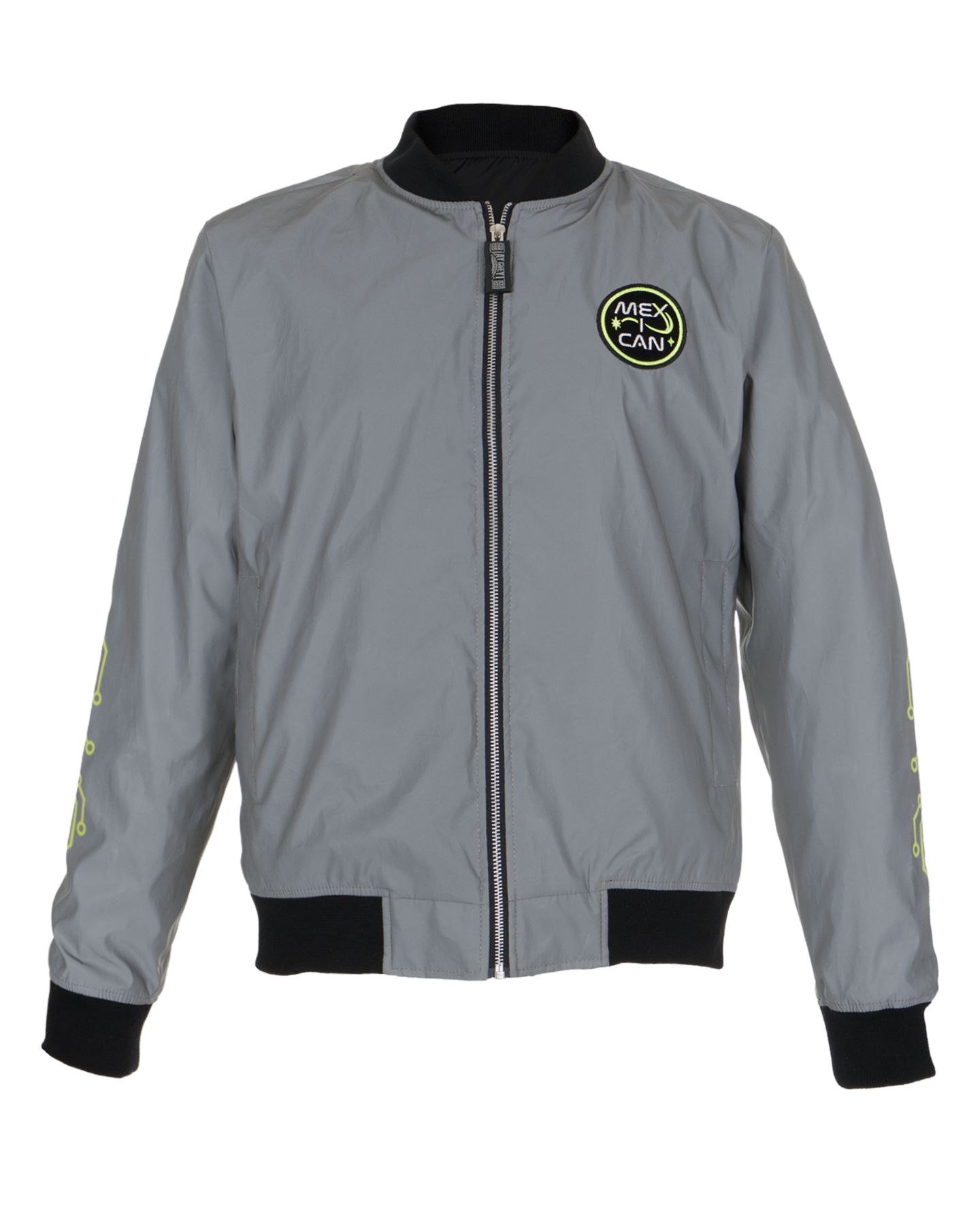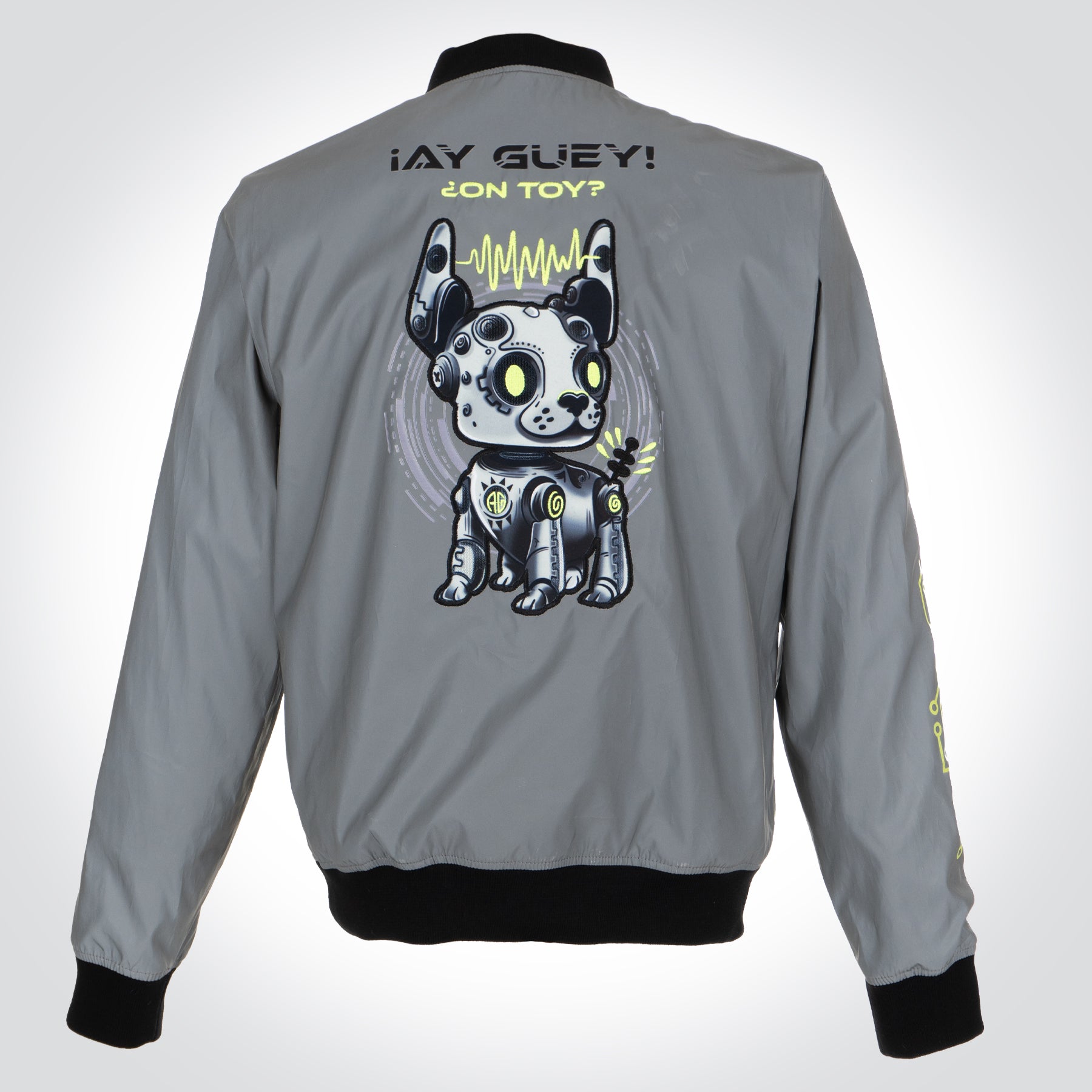 ¡Actualiza tu estilo con nuestra chamarra bomber Pilas! Con un diseño único con perro xolo robot y estampado de circuitos en mangas, agrega un toque de tecnología a tu outfit. Además, el material reflejante y parche bordado trasero te mantendrán visible y a la moda. ¡Lleva tu estilo al siguiente nivel con esta increíble chamarra!