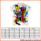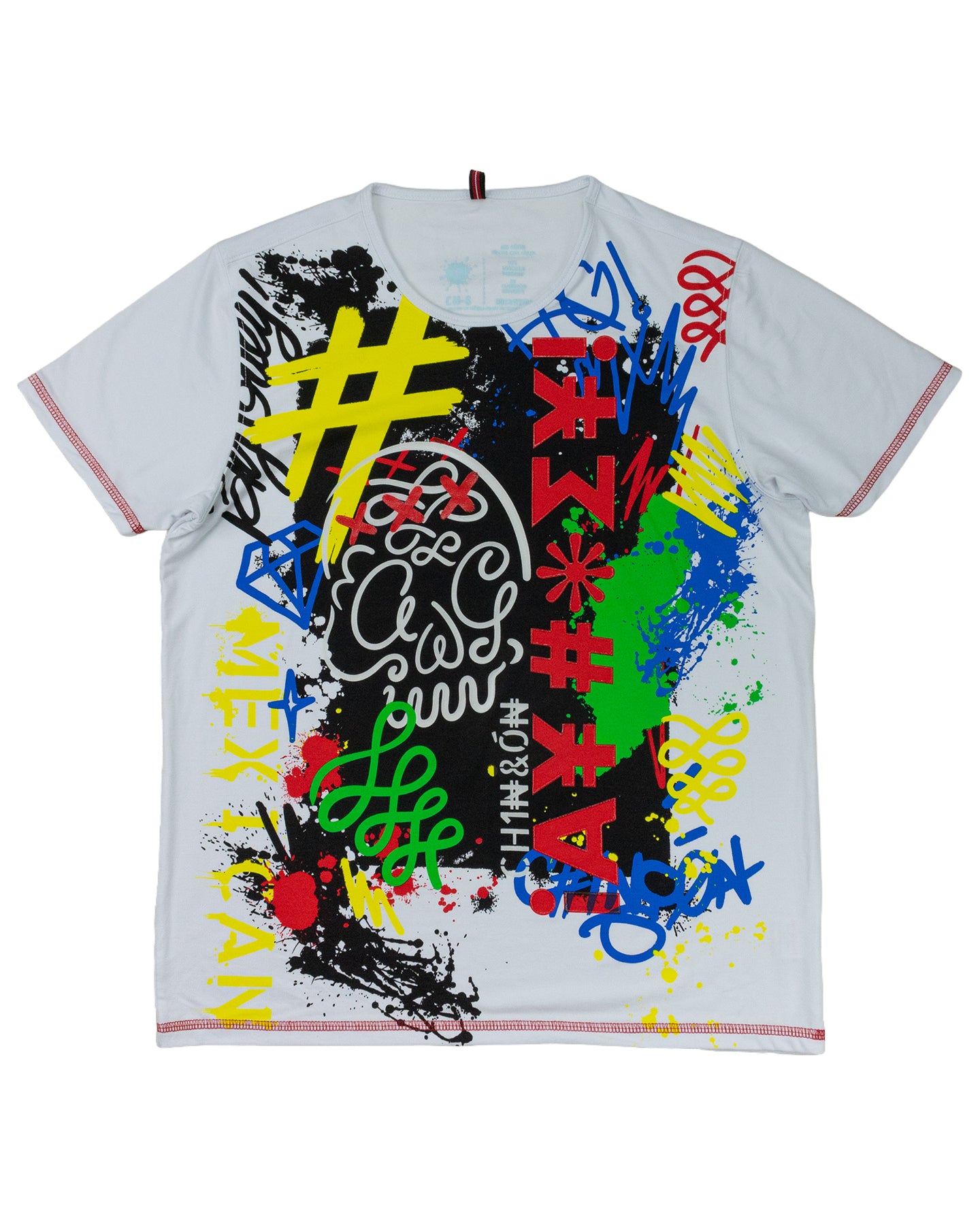 Playera de manga corta con cuello redondo base blanca y estampado en full print con tintas base agua y tinta alta densidad roja en el letrero principal.