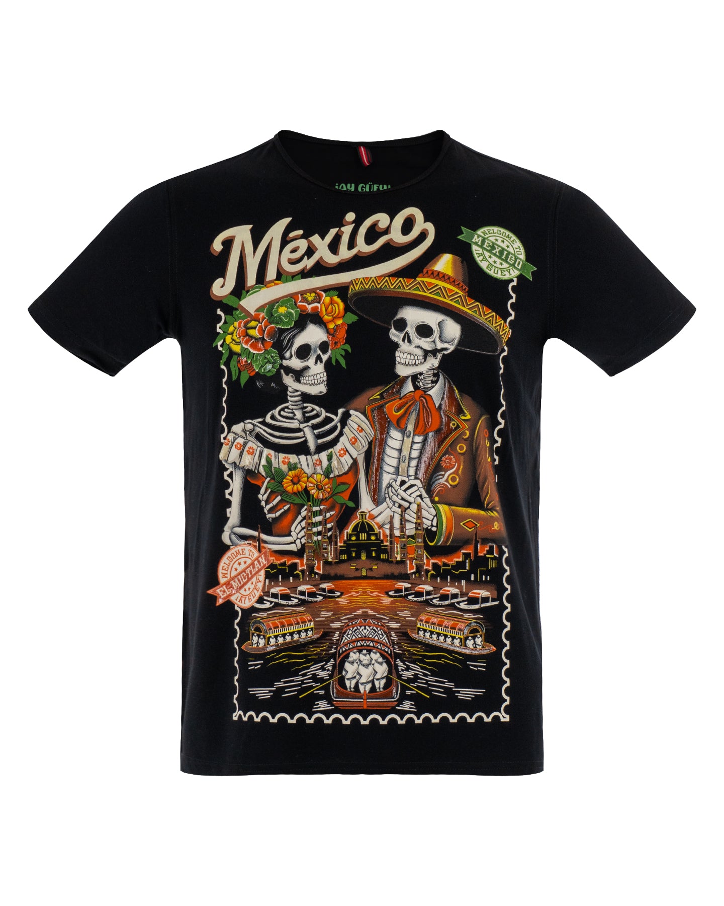La playera "Mictlán" presenta una impresionante ilustración de dos esqueletos elegantemente ataviados: un mariachi y una catrina. El entorno festivo evoca los canales de Xochimilco al anochecer, con cada detalle cuidadosamente elaborado para reflejar la riqueza cultural de México.