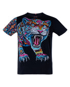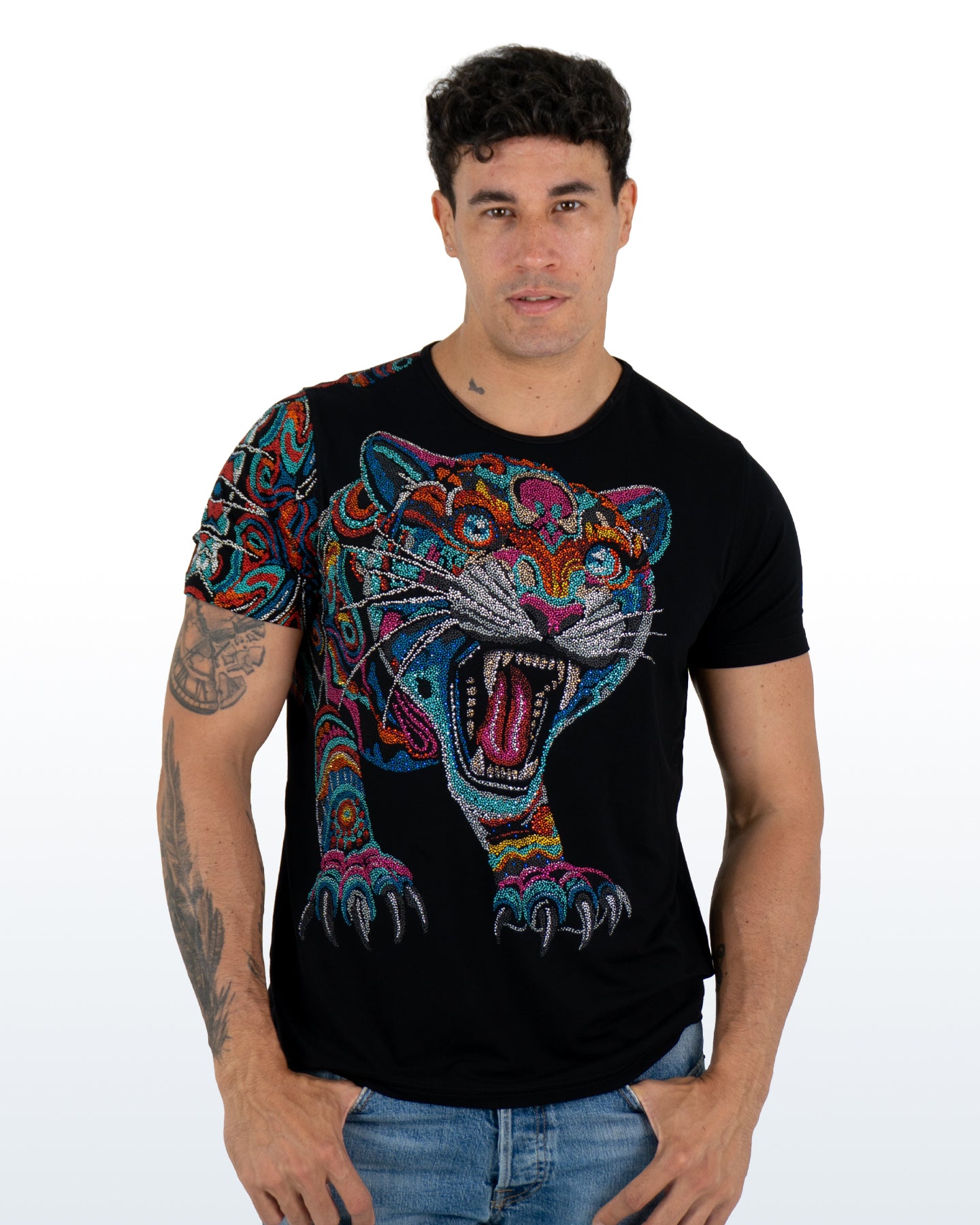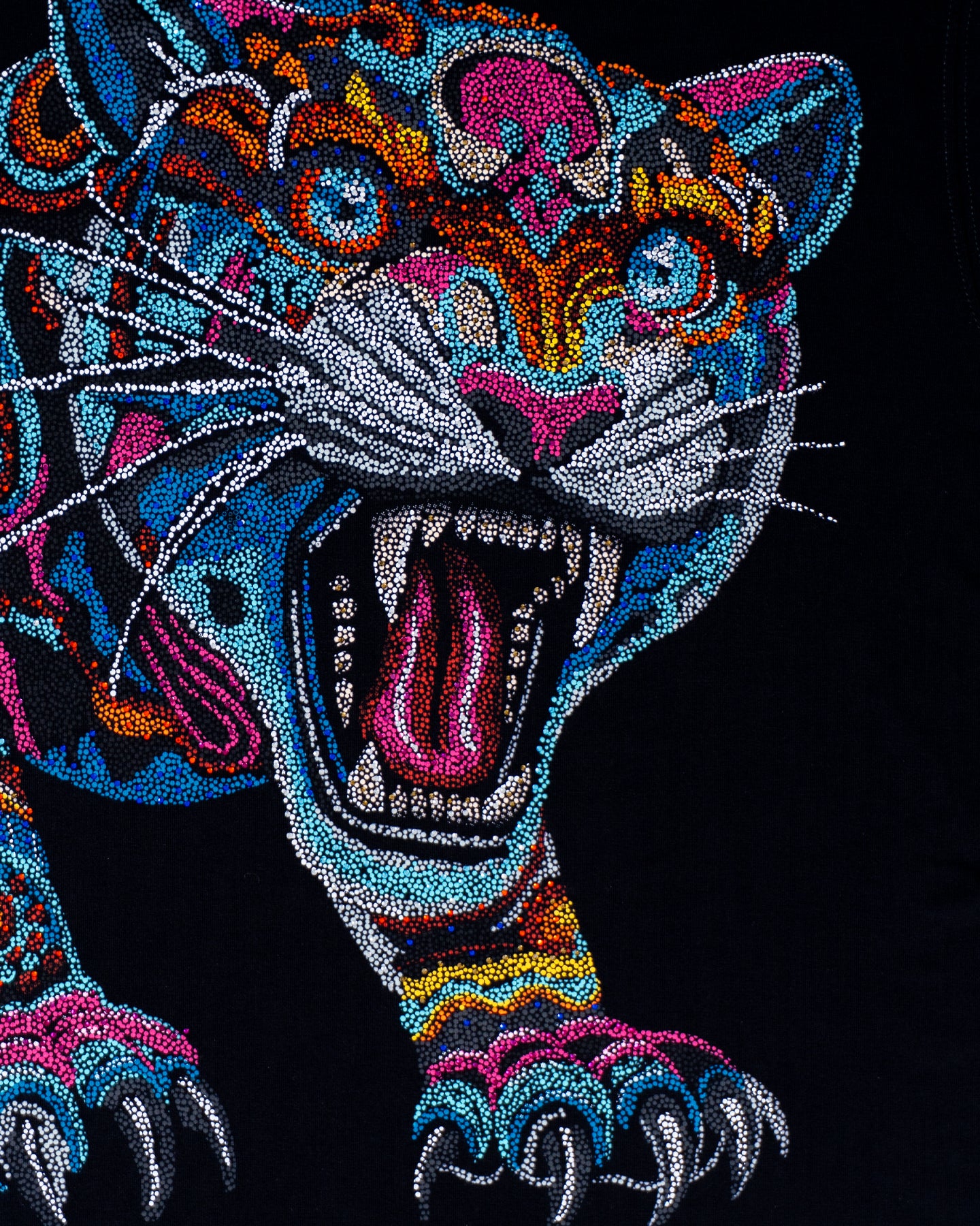 Su diseño central, un imponente jaguar en una paleta de colores vibrantes y profundos, se realza con miles de aplicaciones de pedrería colocadas con precisión. Cada gema captura la luz, generando un efecto resplandeciente inigualable. Perfecta para quienes buscan incorporar un toque de naturaleza exótica y lujo a su vestuario.
