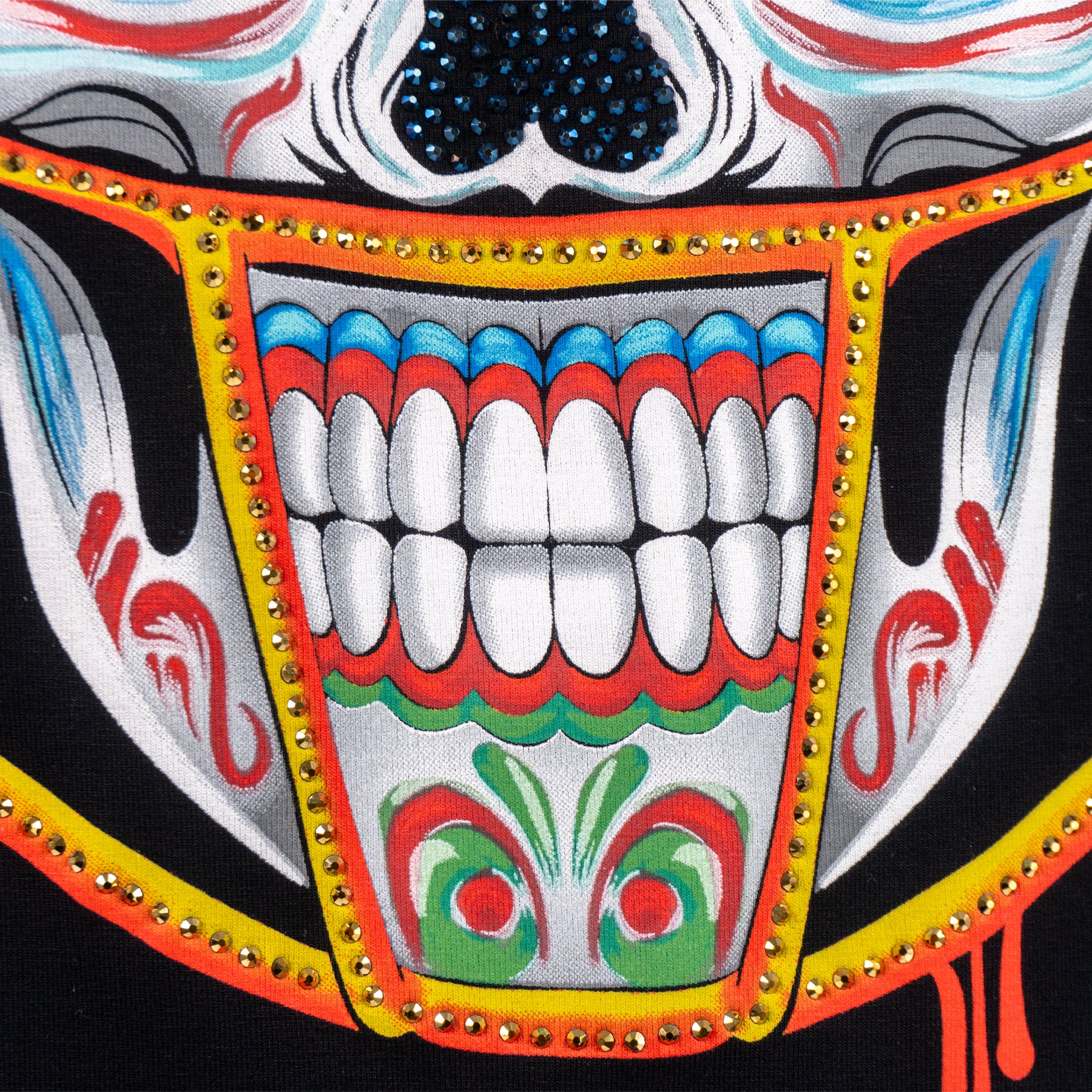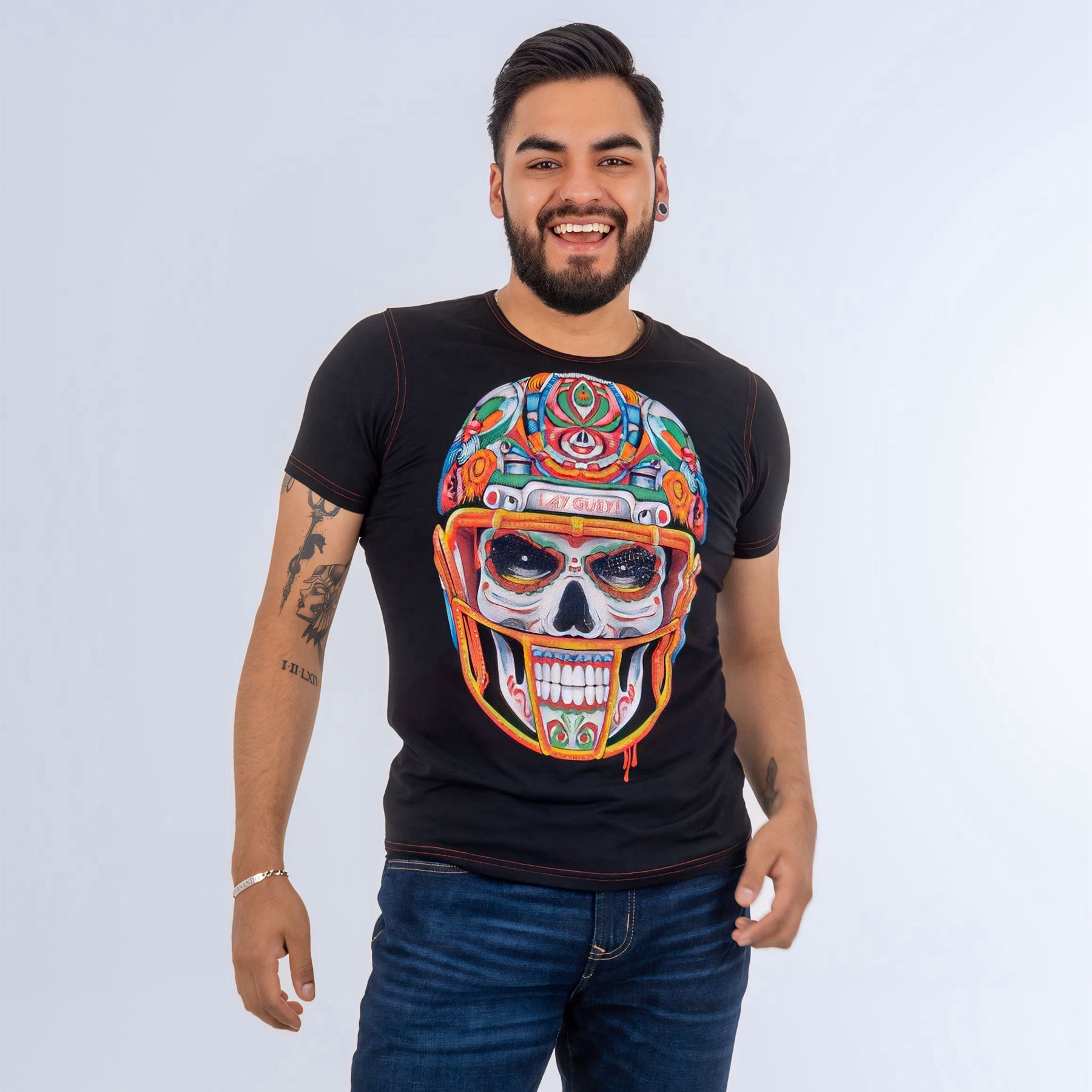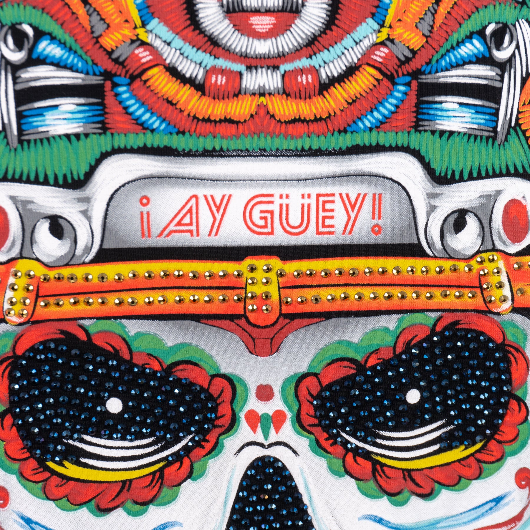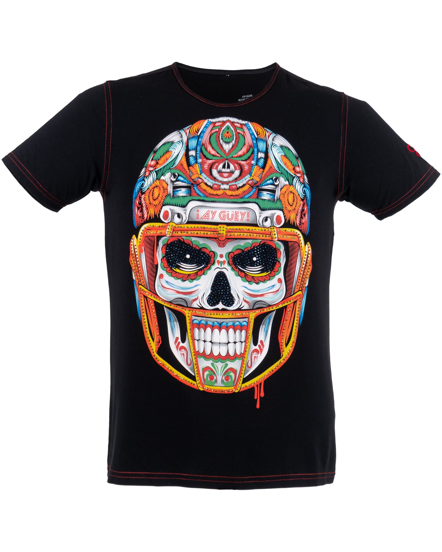 Una fusión explosiva entre la tradición mexicana y la pasión por el deporte. Nuestra playera presenta una imponente calavera de azúcar, adornada con un casco de fútbol americano que rinde homenaje a los héroes del emparrillado. La combinación de texturas y colores vibrantes, junto con los destellos de pedrería, crean una pieza única que refleja la riqueza cultural de México