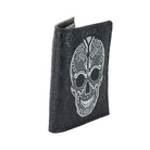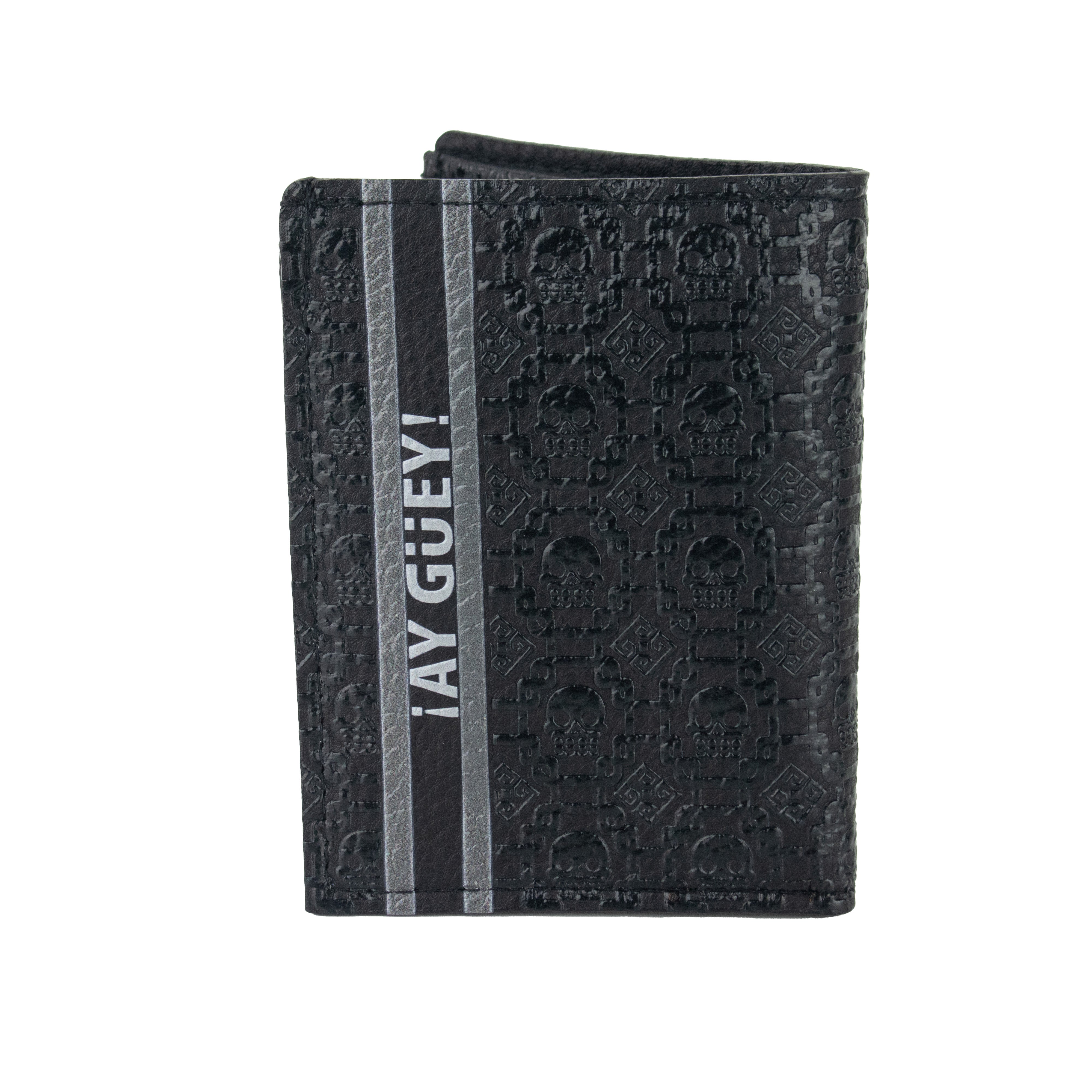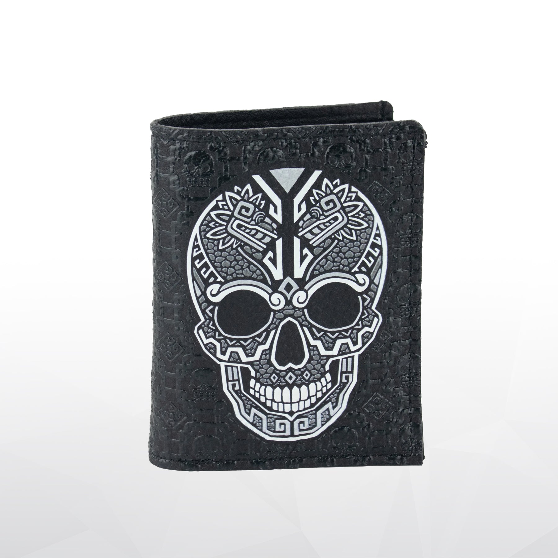Billetera de piel en color negro con impresión de calavera, texturizada con motivos aztecas.