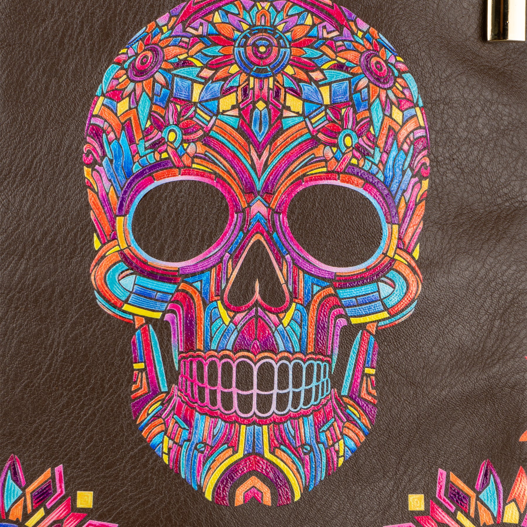 Mochila tipo bandolera, con correa de de tela, inspirada en las calaveras de azúcar y las artesanías mexicanas.