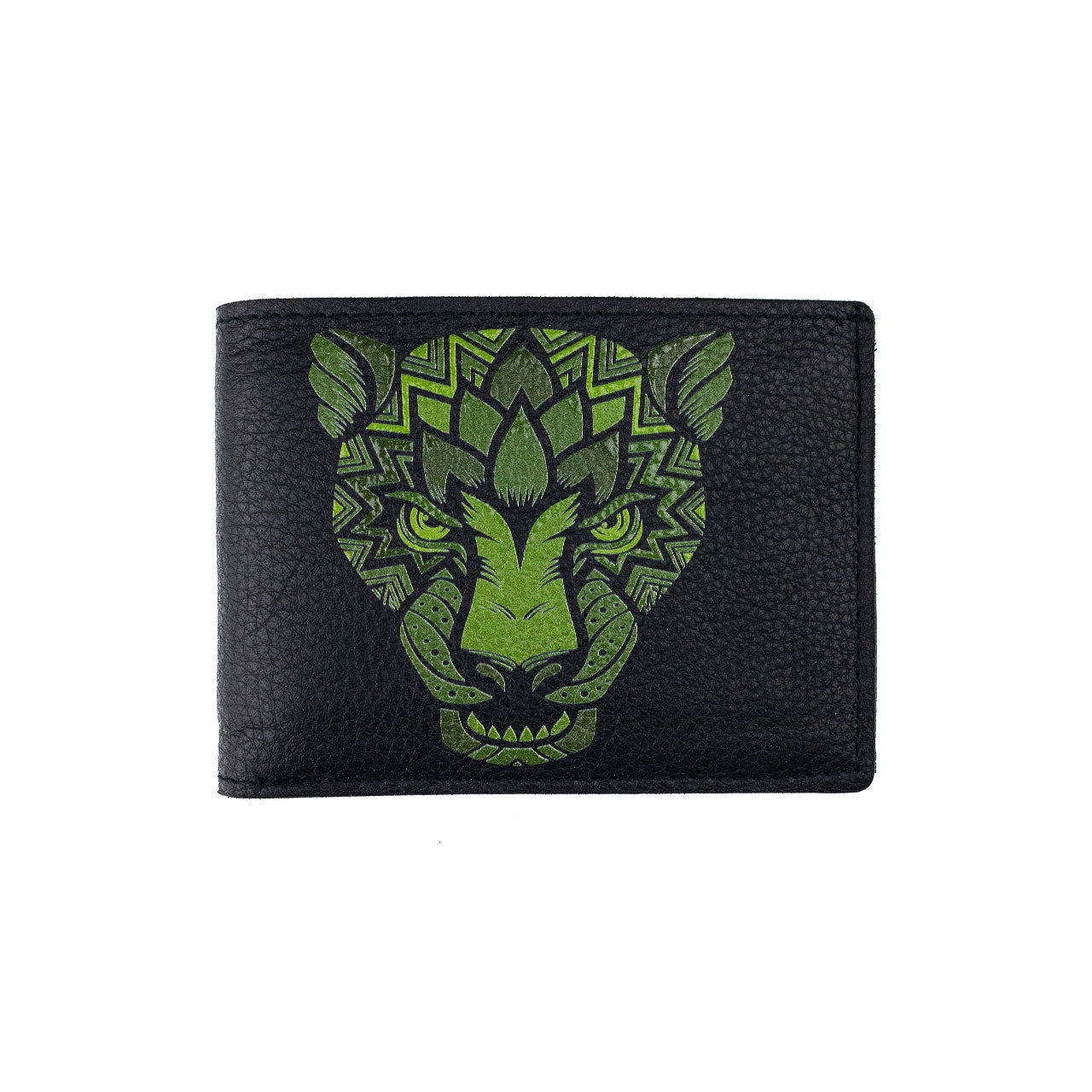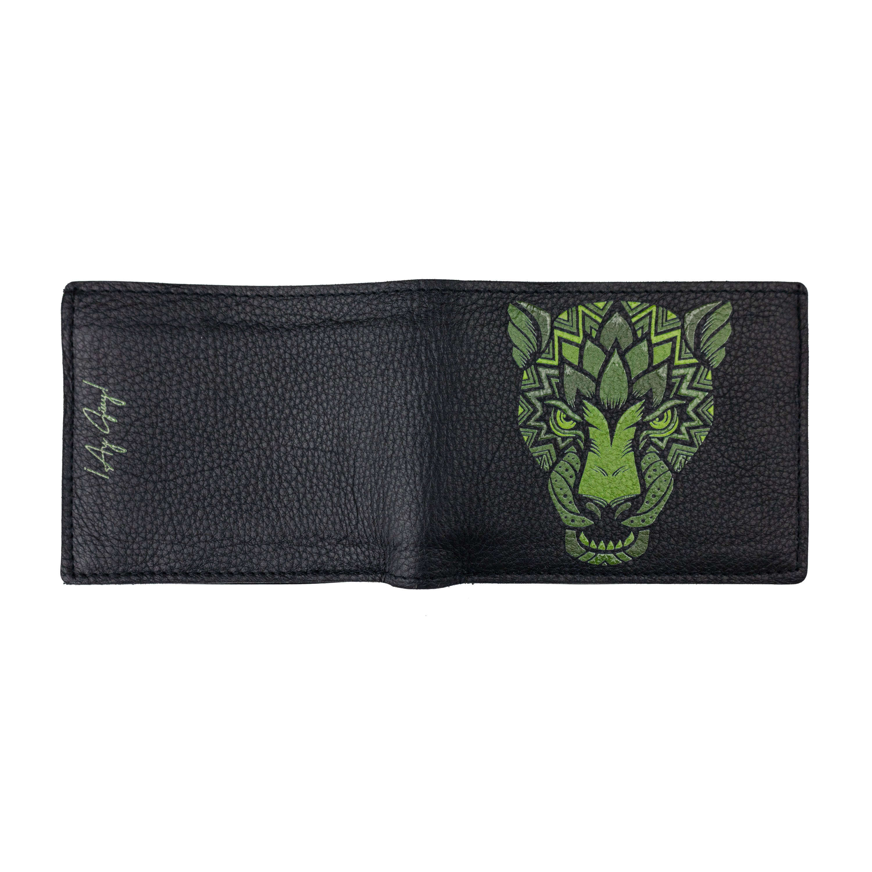 Cartera de piel en color verde con impresión de jaguar