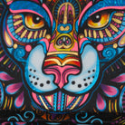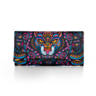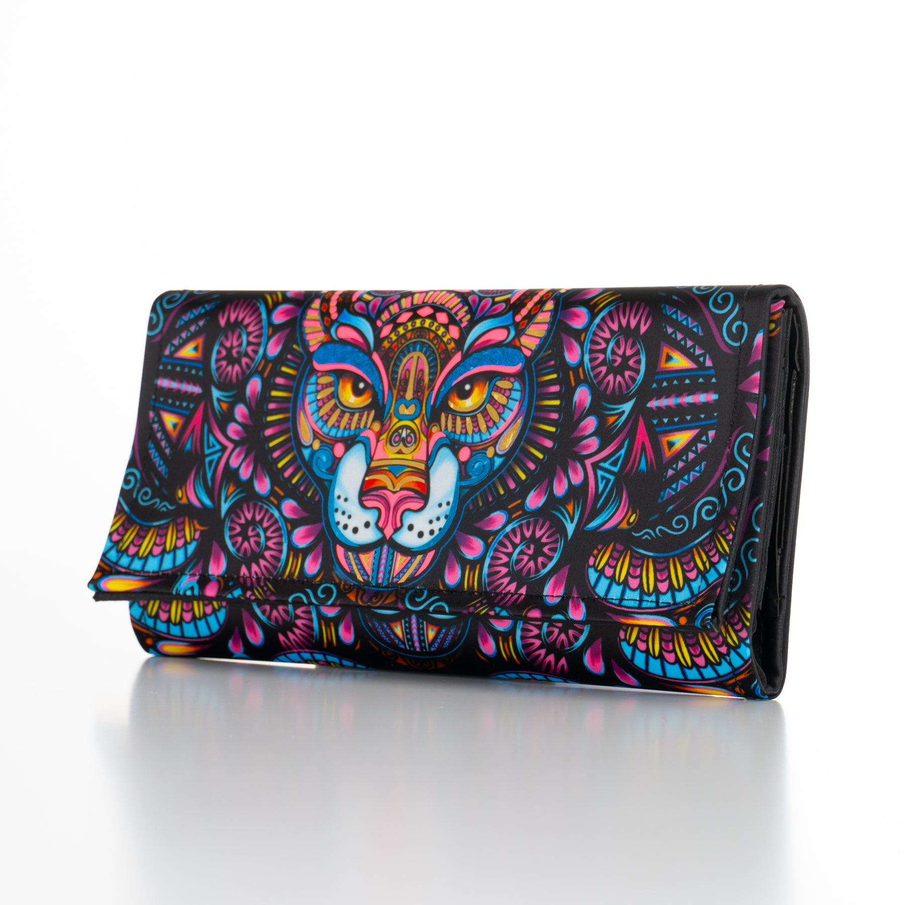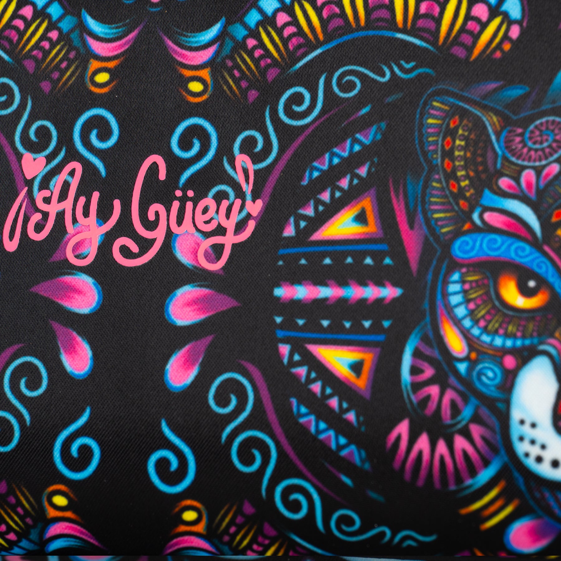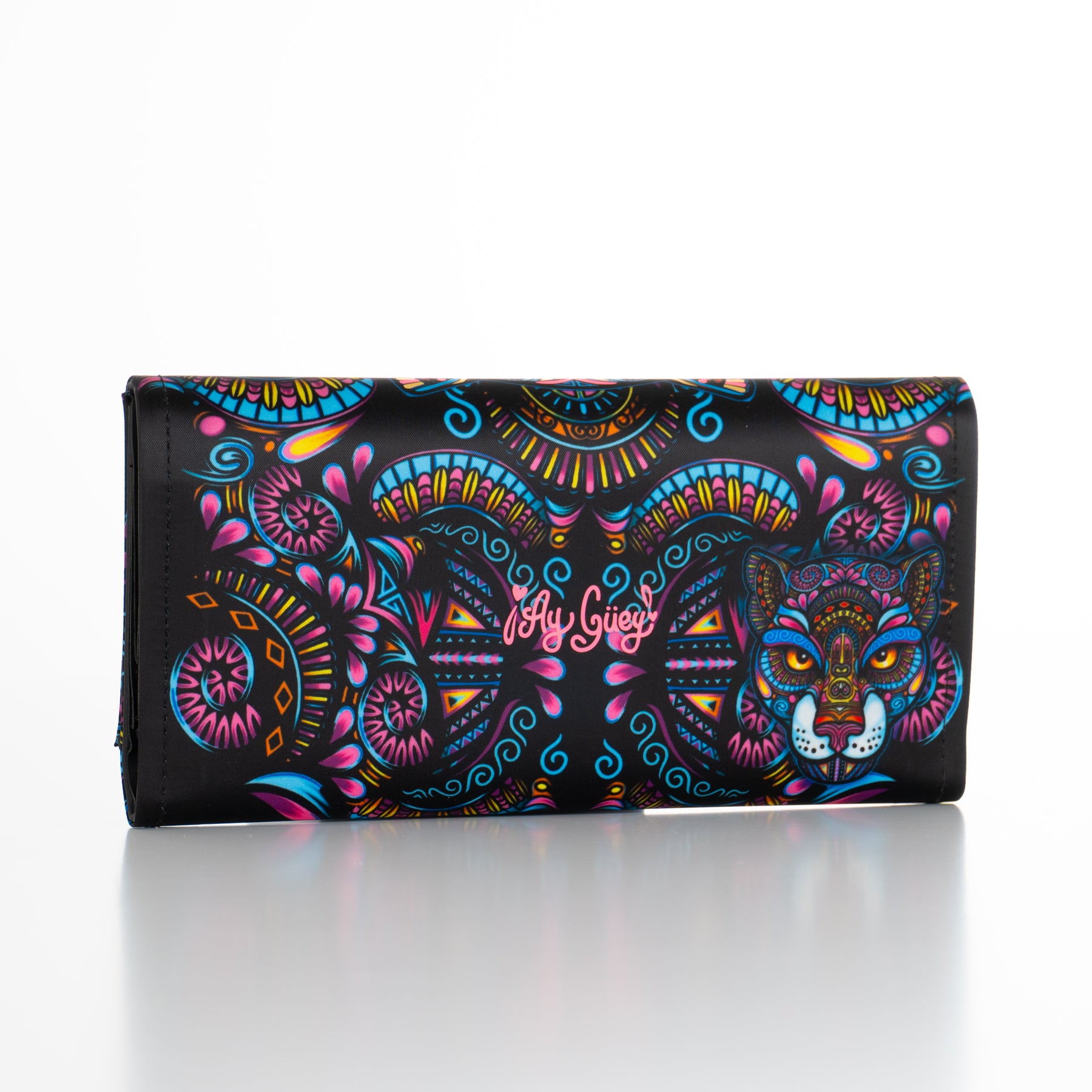 Cartera de dama inspirada en el jaguar y los ornamentos característicos de los alebrijes. Cuenta con aplicaciones en vinil neón.