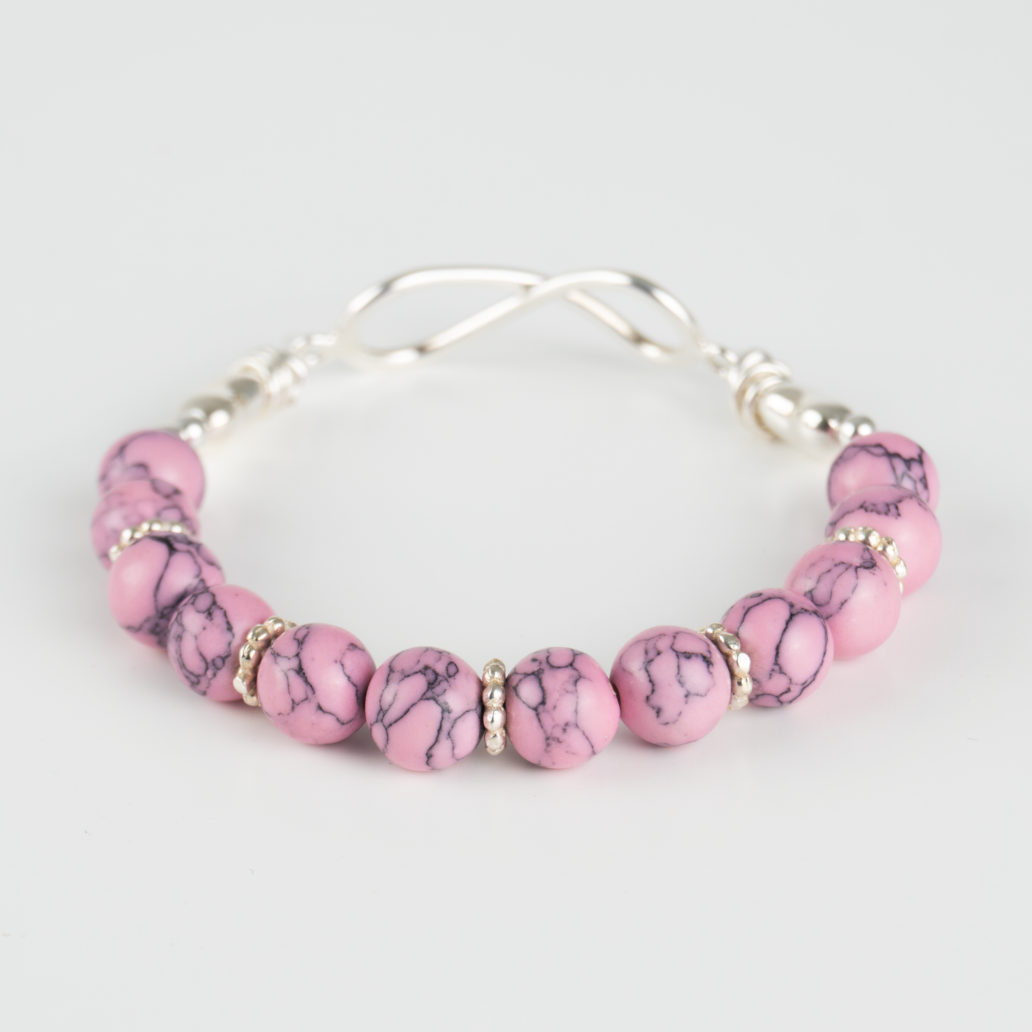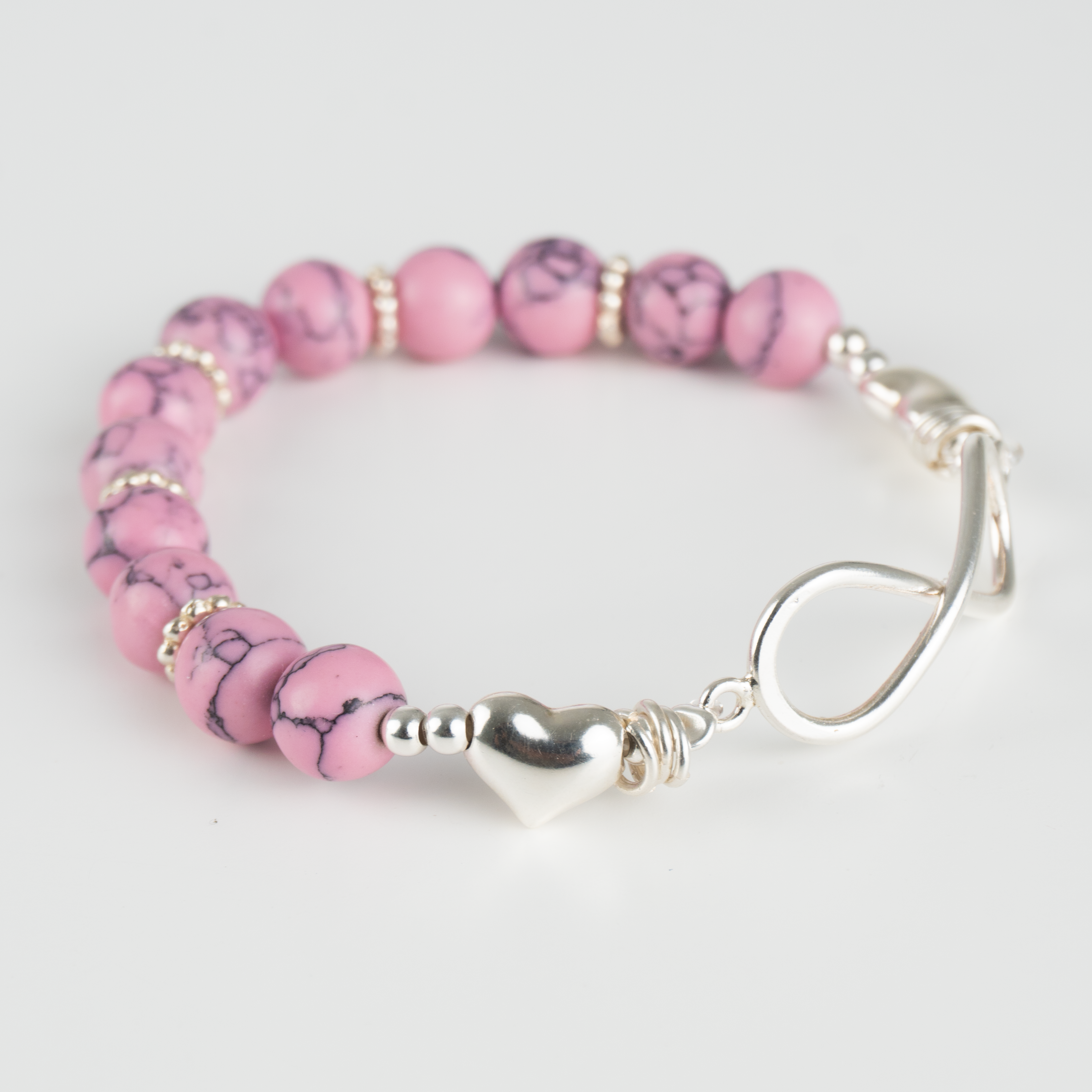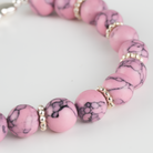Esta delicada pulsera, elaborada con suaves cuentas de tono rosa jaspeado, evoca la ternura y la conexión infinita. Un elegante símbolo de infinito en plata de ley se une a pequeños detalles de corazón, representando un amor sin límites y lleno de cariño. Perfecta para expresar un sentimiento duradero con un toque de dulzura.